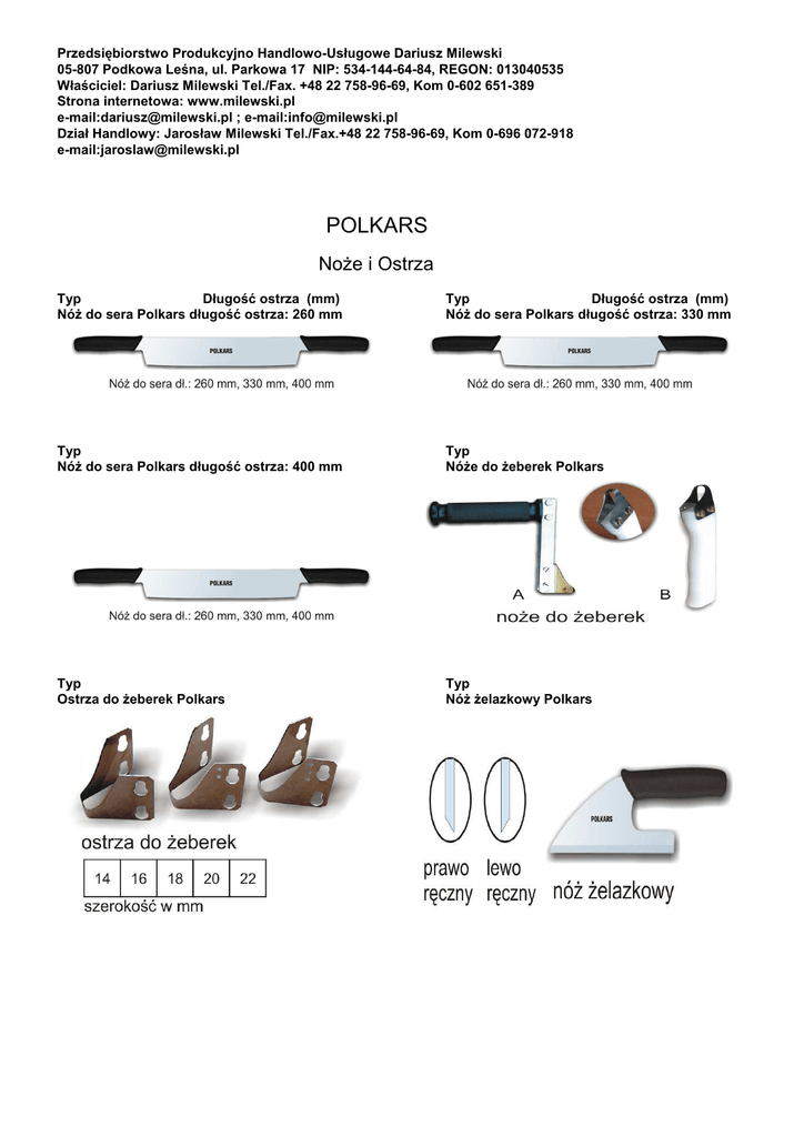 PrzedsiĊbiorstwo Produkcyjno Handlowo-Usługowe Dariusz Milewski 05-807 Podkowa LeĞna, ul. Parkowa 17 NIP: 534-144-64-84, REGON: 013040535 WłaĞciciel: Dariusz Milewski Tel./Fax. +48 22 758-96-69, Kom 0-602 651-389 Strona internetowa: www.milewski.pl e-mail:[email protected] ; e-mail:[email protected] Dział Handlowy: Jarosław Milewski Tel./Fax.+48 22 758-96-69, Kom 0-696 072-918 e-mail:[email protected] POLKARS NoĪe i Ostrza Typ DługoĞü ostrza (mm) NóĪ do sera Polkars długoĞü ostrza: 260 mm Typ DługoĞü ostrza (mm) NóĪ do sera Polkars długoĞü ostrza: 330 mm Typ NóĪ do sera Polkars długoĞü ostrza: 400 mm Typ NóĪe do Īeberek Polkars Typ Ostrza do Īeberek Polkars Typ NóĪ Īelazkowy Polkars PrzedsiĊbiorstwo Produkcyjno Handlowo-Usługowe Dariusz Milewski 05-807 Podkowa LeĞna, ul. Parkowa 17 NIP: 534-144-64-84, REGON: 013040535 WłaĞciciel: Dariusz Milewski Tel./Fax. +48 22 758-96-69, Kom 0-602 651-389 Strona internetowa: www.milewski.pl e-mail:[email protected] ; e-mail:[email protected] Dział Handlowy: Jarosław Milewski Tel./Fax.+48 22 758-96-69, Kom 0-696 072-918 e-mail:[email protected] POLKARS Pochwy na noĪe, Igły Typ Pochwa na noĪe Polkars długoĞci 250 mm Typ Pochwa na noĪe Polkars długoĞci 300 mm Typ Igła masarska Polkars Krótki opis : noĪe, ostrza, pochwy na noĪe, igły POLKARS NoĪe, ostrza, pochwy na noĪe, igły mają szerokie zastosowanie w całym przemyĞle miĊsnym. Firma POLKARS posiada system zarządzania jakoĞcią zgodny z normą ISO 9001:2000. Wszystkie produkty posiadają atest PaĔstwowego Zakładu Higieny. Zamówienie moĪna składaü telefonicznie, e-mailem, listownie lub faxem na adres : PrzedsiĊbiorstwo Produkcyjno Handlowo-Usługowe Dariusz Milewski 05-807 Podkowa LeĞna, ul. Parkowa 17 NIP: 534-144-64-84, REGON: 013040535 WłaĞciciel: Dariusz Milewski Tel./Fax. +48 22 758-96-69, Kom 0-602 651-389 Strona internetowa: www.milewski.pl e-mail:[email protected] ; e-mail:[email protected] Dział Handlowy: Jarosław Milewski Tel./Fax.+48 22 758-96-69, Kom 0-696 072-918 e-mail:[email protected]