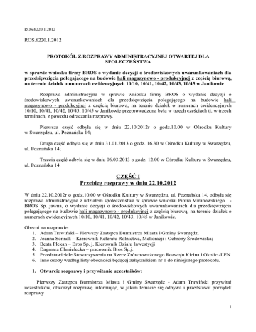 ROS.6220.1.2012 ROS.6220.1.2012 PROTOKÓŁ Z ROZPRAWY ADMINISTRACYJNEJ OTWARTEJ DLA SPOŁECZEŃSTWA w sprawie wniosku firmy BROS o wydanie decyzji o środowiskowych uwarunkowaniach dla przedsięwzięcia polegającego na budowie hali magazynowo - produkcyjnej z częścią biurową, na terenie działek o numerach ewidencyjnych 10/10, 10/41, 10/42, 10/43, 10/45 w Janikowie Rozprawa administracyjna w sprawie wniosku firmy BROS o wydanie decyzji o środowiskowych uwarunkowaniach dla przedsięwzięcia polegającego na budowie hali magazynowo - produkcyjnej z częścią biurową, na terenie działek o numerach ewidencyjnych 10/10, 10/41, 10/42, 10/43, 10/45 w Janikowie przeprowadzona była w trzech częściach tj. w trzech terminach, z powodu odraczania rozprawy. Pierwsza część odbyła się w dniu 22.10.2012r o godz.10.00 w Ośrodku Kultury w Swarzędzu, ul. Poznańska 14; Druga część odbyła się w dniu 31.01.2013 o godz. 16.30 w Ośrodku Kultury w Swarzędzu, ul. Poznańska 14; Trzecia część odbyła się w dniu 06.03.2013 o godz. 12.00 w Ośrodku Kultury w Swarzędzu, ul. Poznańska 14. CZĘŚĆ I Przebieg rozprawy w dniu 22.10.2012 W dniu 22.10.2012r o godz.10.00 w Ośrodku Kultury w Swarzędzu, ul. Poznańska 14, odbyła się rozprawa administracyjna z udziałem społeczeństwa w sprawie wniosku Piotra Miranowskiego BROS Sp. jawna, o wydanie decyzji o środowiskowych uwarunkowaniach dla przedsięwzięcia polegającego na budowie hali magazynowo - produkcyjnej z częścią biurową, na terenie działek o numerach ewidencyjnych 10/10, 10/41, 10/42, 10/43, 10/45 w Janikowie. Obecni na rozprawie: 1. Adam Trawiński – Pierwszy Zastępca Burmistrza Miasta i Gminy Swarzędz; 2. Joanna Sonnak – Kierownik Referatu Rolnictwa, Melioracji i Ochrony Środowiska; 3. Beata Plekan – Bros Sp. j. Kierownik Działu Inwestycji 4. Dagmara Chmielecka – pracownik Bros Sp.j. 5. Przedstawiciele Stowarzyszenia na Rzecz Zrównoważonego Rozwoju Kicina i Okolic -LEN 6. Inne osoby według listy obecności będącej załącznikiem nr 1 do niniejszego protokołu. 1. Otwarcie rozprawy i przywitanie uczestników: Pierwszy Zastępca Burmistrza Miasta i Gminy Swarzędz - Adam Trawiński przywitał uczestników, otworzył rozprawę informując, w jakim temacie się odbywa i przedstawił porządek rozprawy 1 ROS.6220.1.2012 - rozprawa administracyjna przeprowadzana jest w ramach postępowania dotyczącego wydania decyzji o środowiskowych uwarunkowaniach dla przedsięwzięcia pn: budowa hali magazynowo produkcyjnej z częścią biurową, na terenie działek o numerach ewidencyjnych 10/10, 10/41, 10/42, 10/43, 10/45 w Janikowie; - osobą wyznaczoną do kierowania rozprawą jest p. Joanna Sonnak - Kierownik Referatu Rolnictwa, Melioracji i Ochrony Środowiska Urzędu Miasta i Gminy w Swarzędzu; - strony uczestniczące w rozprawie mogą składać wyjaśnienia, zgłaszać żądania, propozycje i zarzuty oraz przedstawiać dowody na ich poparcie; - kwestie poruszane podczas rozprawy, powinny dotyczyć tylko oddziaływania przedmiotowego przedsięwzięcia na środowisko; - informuję, że przebieg rozprawy administracyjnej jest rejestrowany w postaci nagrania. 2. Porządek rozprawy 1. Zagadnienia formalno-prawne rozprawy administracyjnej. 2. Dotychczasowy przebieg postępowania administracyjnego w sprawie. 3. Przedstawienie charakterystyki planowanego przedsięwzięcia przez Wnioskodawcę. 4. 5. Przedstawienie zgłoszonych zagadnień do Wnioskodawcy. 5. 6. Udzielanie odpowiedzi przez Wnioskodawcę na poruszane kwestie. 6. 8. Zgłaszanie uwag końcowych (dodatkowych) do wypowiedzi Wnioskodawcy. 7. 9. Zakończenie rozprawy. Pani Joanna Sonnak przywitała uczestników i poprosiła o wpisywanie się na listę obecności. Następnie przedstawiła zasady dobrej współpracy, zasady formalno – prawne i dotychczasowy przebieg postępowania w sprawie 3. Zasady dobrej współpracy 1. Wyłączamy lub ściszamy telefony komórkowe. 2. Wpisujemy się na listę obecności. 3. Jedna osoba mówi, reszta osób słucha. Szanujemy opinie innych. 4. W celu zabrania głosu należy się zgłosić i kierujący rozprawą udzieli głosu. 5.7.Zgłaszane zagadnienia powinny dotyczyć wyłącznie spraw związanych uwarunkowaniami środowiskowymi przedsięwzięcia. z 1. Zagadnienia formalno-prawne rozprawy administracyjnej. - w czasie rozprawy każdy będzie miał prawo do zabrania głosu w dyskusji – celem zaprotokołowania konieczne będzie przedstawienie się z imienia i nazwiska, w ten sam sposób każdy będzie miał prawo zadawać pytania i składać wnioski, na które następnie zostanie udzielona odpowiedź; - w sprawach istotnych, do których wnioskodawca nie odniesie się na rozprawie, z braku czasu lub z innych przyczyn, Burmistrz Miasta i Gminy Swarzędz wezwie wnioskodawcę do złożenia pisemnych wyjaśnień; - rozprawa będzie rejestrowana w postaci zapisu dźwiękowego, na podstawie, którego zostanie sporządzony protokół z rozprawy, który zostanie zamieszczony na stronie internetowej Urzędu Miasta i Gminy w Swarzędzu; - zgodnie z art. 95. Kodeksu postępowania administracyjnego § 1 Na rozprawie strony mogą składać wyjaśnienia, zgłaszać żądania, propozycje i zarzuty oraz 2 ROS.6220.1.2012 przedstawiać dowody na ich poparcie. Ponadto strony mogą wypowiadać się, co do wyników postępowania dowodowego. § 2. Kierujący rozprawą może uchylić zadawane świadkom, biegłym i stronom pytania, jeżeli nie mają one istotnego znaczenia dla sprawy. Jednakże na żądanie strony należy zamieścić w protokole osnowę treści uchylonego pytania. - zgodnie z art. 96 Kodeksu postępowania administracyjnego - za niewłaściwe zachowanie się w czasie rozprawy strony, świadkowie, biegli i inne osoby uczestniczące w rozprawie mogą być, po uprzednim ostrzeżeniu, wydalone z miejsca rozprawy przez kierującego rozprawą oraz ukarane grzywną do 100 zł. Na postanowienie o ukaraniu grzywną służy zażalenie. - wszy