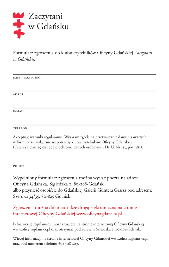 Zaczytani w Gdańsku Formularz zgłoszenia do klubu czytelników Oficyny Gdańskiej Zaczytani w Gdańsku. imię i nazwisko adres e-mail telefon Akceptuję warunki regulaminu. Wyrażam zgodę na przetwarzanie danych zawartych w formularzu wyłącznie na potrzeby klubu czytelników Oficyny Gdańskiej (Ustawa z dnia 29.08.1997 o ochronie danych osobowych Dz. U. Nr 133, poz. 883). podpis Wypełniony formularz zgłoszenia można wysłać pocztą na adres: Oficyna Gdańska, Sąsiedzka 2, 80-298-Gdańsk albo przynieść osobiście do Gdańskiej Galerii Güntera Grassa pod adresem: Szeroka 34/35, 80-825 Gdańsk. Zgłoszenia można dokonać także drogą elektroniczną na stronie internetowej Oficyny Gdańskiej www.oficynagdanska.pl. Pełną wersję regulaminu można znaleźć na stronie internetowej Oficyny Gdańskiej www.oficynagdanska.pl oraz otrzymać pod adresem Sąsiedzka 2, 80-298-Gdańsk. Więcej informacji na stronie internetowej Oficyny Gdańskiej www.oficynagdanska.pl oraz pod numerem telefonu 602 728 409.
