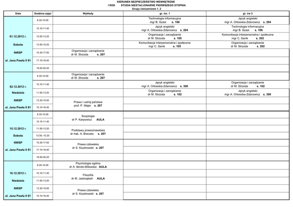 I ROK Data Godzina zajęć Wykłady KIERUNEK BEZPIECZEŃSTWO WEWNĘTRZNE STUDIA NIESTACJONARNE PIERWSZEGO STOPNIA Grupy ćwiczeniowe 1, 2 gr. ćw. 1 gr. ćw 2 Technologia informacyjna mgr B. Szast s. 106 8.30-10.00 Język angielski mgr A. Orłowska-Zdanowicz 10.10-11.40 s. 204 01.12.2012 r. 12.00-13.20 Organizacja i zarządzanie dr M. Strzoda s. 105 Sobota 13.50-15.20 Komunikacja interpersonalna i społeczna mgr C. Sanik s. 105 NWSP 15.30-17.00 al. Jana Pawła II 91 17.10-18.40 Język angielski mgr A. Orłowska-Zdanowicz s. 204 Technologia informacyjna mgr B. Szast s. 106 Komunikacja interpersonalna i społeczna mgr C. Sanik s. 202 Organizacja i zarządzanie dr M. Strzoda s. 202 Organizacja i zarządzanie dr M. Strzoda s. 207 18.50-20.20 8.30-10.00 02.12.2012 r. Organizacja i zarządzanie dr M. Strzoda s. 207 Język angielski mgr A. Orłowska-Zdanowicz 10.10-11.40 Niedziela 11.50-13.20 NWSP 13.30-15.00 al. Jana Pawła II 91 15.10-16.40 8.30-10.00 10.10-11.40 15.12.2012 r. 11.50-13.20 Sobota 13.50.-15.20 NWSP 15.30-17.00 al. Jana Pawła II 91 17.10-18.40 Organizacja i zarządzanie dr M. Strzoda s. 102 Prawo i ustrój państwa prof. P. Majer s. 207 Socjologia dr P. Karpowicz AULA Podstawy prawoznawstwa dr hab. A. Breczko s. 207 Prawa człowieka dr S. Kozdrowski s. 207 18.50-20.20 8.30-10.00 16.12.2012 r. 10.10-11.40 Niedziela 11.50-13.20 NWSP 13.30-15.00 al. Jana Pawła II 91 15.10-16.40 s. 300 Psychologia ogólna dr A. Iłendo-Milewska AULA Filozofia dr M. Jastrzębski AULA Prawa człowieka dr S. Kozdrowski s. 207 Organizacja i zarządzanie dr M. Strzoda s. 102 Język angielski mgr A. Orłowska-Zdanowicz s. 300 I ROK Data Godzina zajęć 8.30-10.00 10.10-11.40 Wykłady Filozofia dr M. Jastrzębski KIERUNEK BEZPIECZEŃSTWO WEWNĘTRZNE STUDIA NIESTACJONARNE PIERWSZEGO STOPNIA Grupy ćwiczeniowe 1, 2 gr. ćw. 1 gr. ćw 2 AULA 19.01.2013 r. 12.00-13.20 Technologia informacyjna mgr B. Szast s. 106 Prawo i ustrój państwa dr K. Jurewicz-Bakun s. AULA Sobota 13.50-15.20 Prawo i ustrój państwa dr K. Jurewicz-Bakun s. AULA Technologia informacyjna mgr B. Szast s. 106 NWSP 15.30-17.00 al. Jana Pawła II 91 17.10-18.40 8.30-10.00 Technologia informacyjna mgr B. Szast s. 106 Prawo i ustrój państwa dr K. Jurewicz-Bakun s. 104 10.10-11.40 Prawo i ustrój państwa dr K. Jurewicz-Bakun s. 104 Technologia informacyjna mgr B. Szast s. 106 18.50-20.20 Socjologia dr P. Karpowicz AULA Psychologia ogólna dr A. Iłendo-Milewska AULA 20.01.2013 r. Niedziela 11.50-13.20 NWSP 13.30-15.00 al. Jana Pawła II 91 15.10-16.40 8.30-10.00 10.10-11.40 Psychologia ogólna dr A. Iłendo-Milewska AULA Komunikacja interpersonalna i społeczna mgr C. Sanik s. 105 Język angielski mgr A. Orłowska-Zdanowicz s. 105 Język angielski mgr A. Orłowska-Zdanowicz s. 205 Komunikacja interpersonalna i społeczna mgr C. Sanik s. 205 Biomedyczne podstawy rozwoju człowieka dr A. Korzeniecka-Kozerska AULA 02.02.2013 r. 11.50-13.20 Sobota 13.50.-15.20 NWSP 15.30-17.00 al. Jana Pawła II 91 17.10-18.40 Organizacja i zarządzanie dr M. Strzoda s. 203 ZALICZENIE Technologia informacyjna mgr B. Szast s. 106 18.50-20.20 Technologia informacyjna mgr B. Szast s. 106 Organizacja i zarządzanie dr M. Strzoda s. 203 ZALICZENIE 8.30-10.00 03.02.2013 r. 10.10-11.40 Niedziela 11.50-13.20 NWSP 13.30-15.00 al. Jana Pawła II 91 15.10-16.40 Filozofia dr M. Jastrzębski AULA Organizacja i zarządzanie dr M. Strzoda AULA Socjologia dr P. Karpowicz AULA Język angielski mgr A. Orłowska-Zdanowicz s. 103 Prawo i ustrój państwa dr K. Jurewicz-Bakun s. 103 Psychologia ogólna dr A. Iłendo-Milewska AULA Prawo i ustrój państwa dr K. Jurewicz-Bakun s. 105 Język angielski mgr A. Orłowska-Zdanowicz s. 105