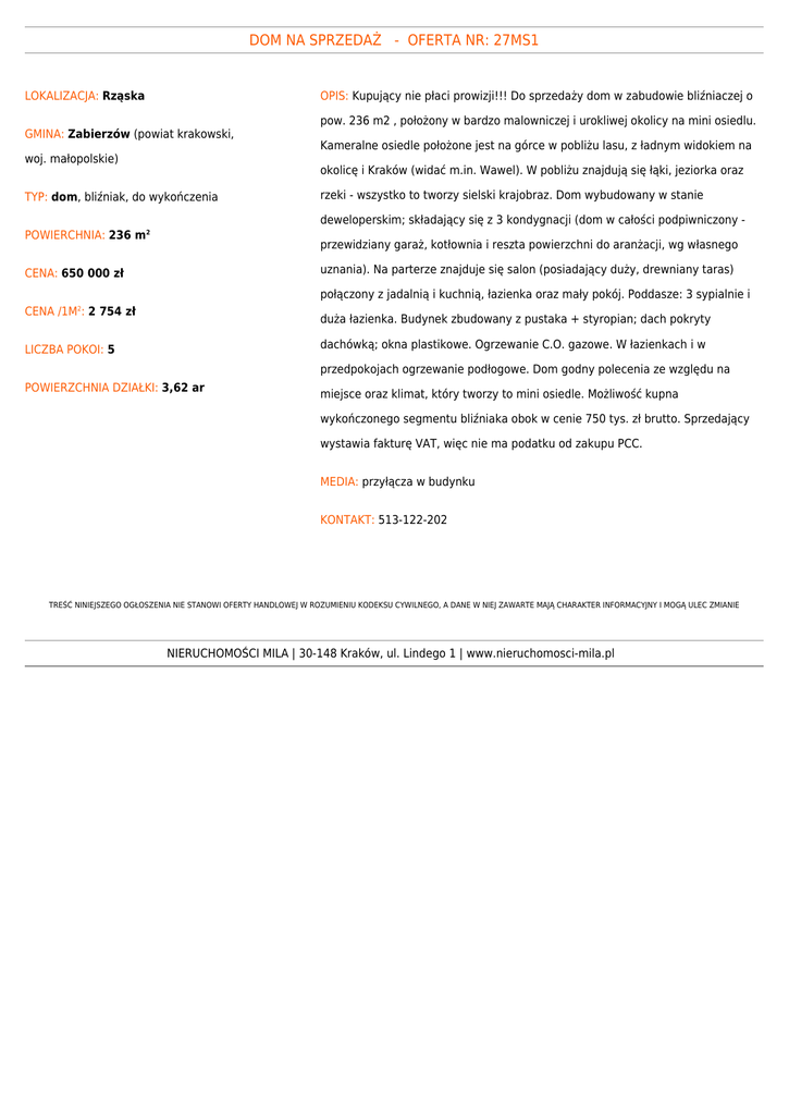 DOM NA SPRZEDAŻ - OFERTA NR: 27MS1 LOKALIZACJA: Rząska OPIS: Kupujący nie płaci prowizji!!! Do sprzedaży dom w zabudowie bliźniaczej o GMINA: Zabierzów (powiat krakowski, woj. małopolskie) pow. 236 m2 , położony w bardzo malowniczej i urokliwej okolicy na mini osiedlu. Kameralne osiedle położone jest na górce w pobliżu lasu, z ładnym widokiem na okolicę i Kraków (widać m.in. Wawel). W pobliżu znajdują się łąki, jeziorka oraz TYP: dom, bliźniak, do wykończenia rzeki - wszystko to tworzy sielski krajobraz. Dom wybudowany w stanie deweloperskim; składający się z 3 kondygnacji (dom w całości podpiwniczony - POWIERCHNIA: 236 m2 przewidziany garaż, kotłownia i reszta powierzchni do aranżacji, wg własnego uznania). Na parterze znajduje się salon (posiadający duży, drewniany taras) CENA: 650 000 zł połączony z jadalnią i kuchnią, łazienka oraz mały pokój. Poddasze: 3 sypialnie i CENA /1M2: 2 754 zł duża łazienka. Budynek zbudowany z pustaka + styropian; dach pokryty dachówką; okna plastikowe. Ogrzewanie C.O. gazowe. W łazienkach i w LICZBA POKOI: 5 przedpokojach ogrzewanie podłogowe. Dom godny polecenia ze względu na POWIERZCHNIA DZIAŁKI: 3,62 ar miejsce oraz klimat, który tworzy to mini osiedle. Możliwość kupna wykończonego segmentu bliźniaka obok w cenie 750 tys. zł brutto. Sprzedający wystawia fakturę VAT, więc nie ma podatku od zakupu PCC. MEDIA: przyłącza w budynku KONTAKT: 513-122-202 TREŚĆ NINIEJSZEGO OGŁOSZENIA NIE STANOWI OFERTY HANDLOWEJ W ROZUMIENIU KODEKSU CYWILNEGO, A DANE W NIEJ ZAWARTE MAJĄ CHARAKTER INFORMACYJNY I MOGĄ ULEC ZMIANIE NIERUCHOMOŚCI MILA | 30-148 Kraków, ul. Lindego 1 | www.nieruchomosci-mila.pl