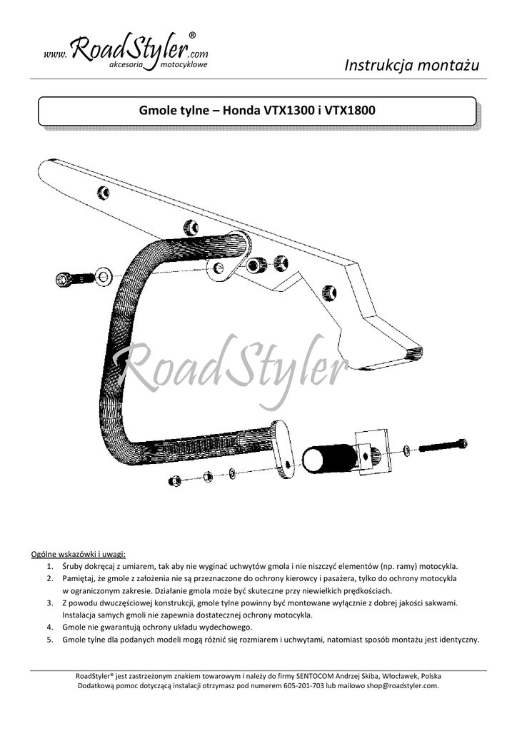 www. ® RoadStyler.com akcesoria motocyklowe Instrukcja montażu Gmole tylne – Honda VTX1300 i VTX1800 RoadStyler Ogólne wskazówki i uwagi: 1. Śruby dokręcaj z umiarem, tak aby nie wyginać uchwytów gmola i nie niszczyć elementów (np. ramy) motocykla. 2. Pamiętaj, że gmole z założenia nie są przeznaczone do ochrony kierowcy i pasażera, tylko do ochrony motocykla w ograniczonym zakresie. Działanie gmola może być skuteczne przy niewielkich prędkościach. 3. Z powodu dwuczęściowej konstrukcji, gmole tylne powinny być montowane wyłącznie z dobrej jakości sakwami. Instalacja samych gmoli nie zapewnia dostatecznej ochrony motocykla. 4. Gmole nie gwarantują ochrony układu wydechowego. 5. Gmole tylne dla podanych modeli mogą różnić się rozmiarem i uchwytami, natomiast sposób montażu jest identyczny. RoadStyler® jest zastrzeżonym znakiem towarowym i należy do firmy SENTOCOM Andrzej Skiba, Włocławek, Polska Dodatkową pomoc dotyczącą instalacji otrzymasz pod numerem 605-201-703 lub mailowo [email protected].