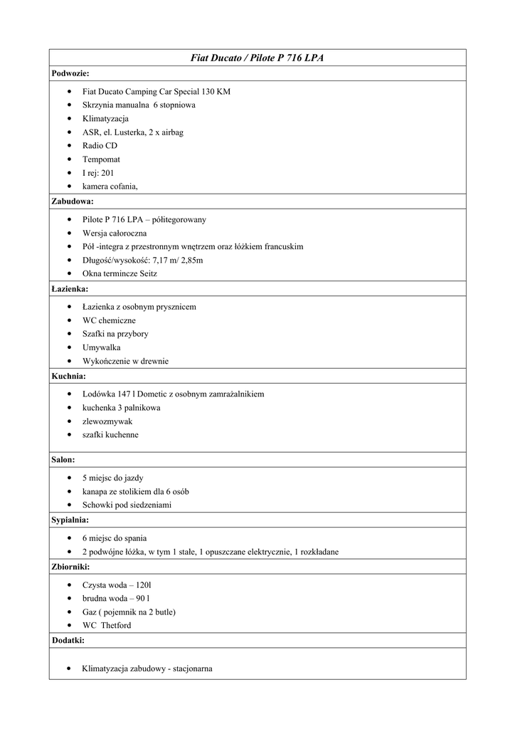 Fiat Ducato / Pilote P 716 LPA Podwozie: ● Fiat Ducato Camping Car Special 130 KM ● Skrzynia manualna 6 stopniowa ● Klimatyzacja ● ASR, el. Lusterka, 2 x airbag ● Radio CD ● Tempomat ● I rej: 201 ● kamera cofania, Zabudowa: ● Pilote P 716 LPA – półitegorowany ● Wersja całoroczna ● Pół -integra z przestronnym wnętrzem oraz łóżkiem francuskim ● Długość/wysokość: 7,17 m/ 2,85m ● Okna termincze Seitz Łazienka: ● Łazienka z osobnym prysznicem ● WC chemiczne ● Szafki na przybory ● Umywalka ● Wykończenie w drewnie Kuchnia: ● Lodówka 147 l Dometic z osobnym zamrażalnikiem ● kuchenka 3 palnikowa ● zlewozmywak ● szafki kuchenne Salon: ● 5 miejsc do jazdy ● kanapa ze stolikiem dla 6 osób ● Schowki pod siedzeniami Sypialnia: ● 6 miejsc do spania ● 2 podwójne łóżka, w tym 1 stałe, 1 opuszczane elektrycznie, 1 rozkładane Zbiorniki: ● Czysta woda – 120l ● brudna woda – 90 l ● Gaz ( pojemnik na 2 butle) ● WC Thetford Dodatki: ● Klimatyzacja zabudowy - stacjonarna Fiat Ducato / Pilote P 716 LPA ● Markiza ● Okno panoramiczne Heki ● Bagażnik na 4 rowery ● TV DVD 15 '' 12 V ● Zestaw TV ● Pakiet Startowy ( przyłącz 230V, wąż do wody, płyn do WC, woda 30 % zbiornika ● Ubezpieczenie Auto Casco, OC, NW, zielona karta, assistance Generali LUX