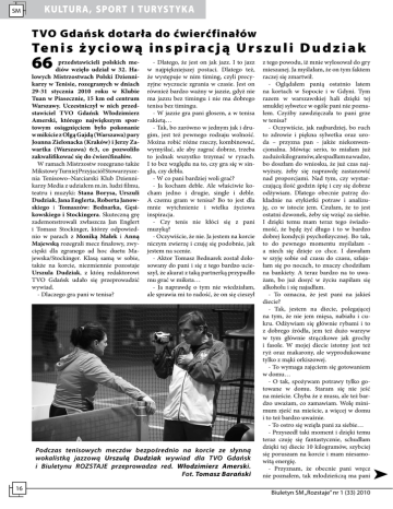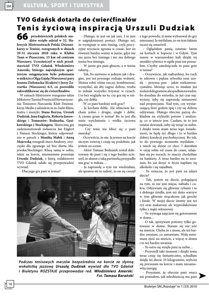 SM KULTURA, SPORT I TURYSTYKA TVO Gdańsk dotarła do ćwierćfinałów Te n i s ż y c i o w ą i n s p i r a c j ą U r s z u l i D u d z i a k 66 przedstawicieli polskich mediów wzięło udział w 32. Halowych Mistrzostwach Polski Dziennikarzy w Tenisie, rozegranych w dniach 29-31 stycznia 2010 roku w Klubie Tuan w Piasecznie, 15 km od centrum Warszawy. Uczestniczył w nich przedstawiciel TVO Gdańsk Włodzimierz Amerski, którego największym sportowym osiągnięciem było pokonanie w mikście z Olgą Gajdą (Warszawa) pary Joanna Zielonacka (Kraków) i Jerzy Zawartka (Warszawa) 6:3, co pozwoliło zakwalifikować się do ćwierćfinałów. W ramach Mistrzostw rozegrano także Mikstowy Turniej Przyjaciół Stowarzyszenia Tenisowo–Narciarski Klub Dziennikarzy Media z udziałem m.in. ludzi filmu, teatru i muzyki: Stana Borysa, Urszuli Dudziak, Jana Englerta, Roberta Janowskiego i Tomaszów: Bednarka, Gęsikowskiego i Stockingera. Skuteczną grę zademonstrowali zwłaszcza Jan Englert i Tomasz Stockinger, którzy odpowiednio w parach z Moniką Małek i Anną Majewską rozegrali mecz finałowy, zwycięski dla zgranego ad hoc duetu Majewska/Stockinger. Klasą samą w sobie, także na korcie, niezmiennie pozostaje Urszula Dudziak, z którą redaktorowi TVO Gdańsk udało się przeprowadzić wywiad. - Dlaczego gra pani w tenisa? - Dlatego, że jest on jak jazz. I to jazz w najpiękniejszej postaci. Dlatego też, że występuje w nim timing, czyli precyzyjne wyczucie zgrania w czasie. Jest on również bardzo ważny w jazzie, gdyż nie ma jazzu bez timingu i nie ma dobrego tenisa bez timingu. - W jazzie gra pani głosem, a w tenisa rakietą… - Tak, bo zarówno w jednym jak i drugim, jest też pewnego rodzaju wolność. Można robić różne rzeczy, kombinować, wymyślać, ale aby zagrać dobrze, trzeba to jednak wszystko trzymać w ryzach. I to bez względu na to, czy gra się w singla, czy debla. - W co pani bardziej woli grać? - Ja kocham deble. Ale właściwie kocham jedno i drugie, single i deble. A czemu gram w tenisa? Bo to jest dla mnie wytchnienie i wielka życiowa inspiracja. - Czy tenis nie kłóci się z pani muzyką? - Oczywiście, że nie. Ja jestem na korcie niczym zwierzę i czuję się podobnie, jak jestem na scenie. - Aktor Tomasz Bednarek został dolosowany do pani i się z tego bardzo ucieszył, że akurat z taką partnerką przypadło mu grać w miksta… - Ja naprawdę o tym nie wiedziałam, ale sprawia mi to radość, że on się cieszył Podczas tenisowych meczów bezpośrednio na korcie ze słynną wokalistką jazzową Urszulą Dudziak wywiad dla TVO Gdańsk i Biuletynu ROZSTAJE przeprowadza red. Włodzimierz Amerski. Fot. Tomasz Barański 16 z tego powodu, iż mnie wylosował do gry mieszanej. Ja myślałam, że on tym faktem raczej się zmartwił. - Oglądałem panią ostatnio latem na kortach w Sopocie i w Gdyni. Tym razem w warszawskiej hali dzięki tej smukłej sylwetce w ogóle pani nie poznałem. Czyżby zawdzięczała to pani grze w tenisa? - Oczywiście, jak najbardziej, bo ruch to zdrowie i piękna sylwetka oraz uroda – przyzna pan - jakże niekonwencjonalna. Mówiąc serio, to miałam już za dużo kilogramów, ale spadłam na wadze, bo doszłam do wniosku, że już czas najwyższy, żeby się naprawdę zastanowić nad proporcjami. Nad tym, czy wystarczającą ilość godzin śpię i czy się dobrze odżywiam. Dlatego obecnie patrzę dokładnie na etykietki potraw i analizuję, co w istocie jem. Czułam, że to jest ostatni dzwonek, żeby się wziąć za siebie. I dzięki temu mam teraz tego świadomość, że będę żyć długo i to w bardzo dobrej kondycji psychofizycznej. Bo tak, to do pewnego momentu myślałam a niech się dzieje co chce. I dawałam w szyję sobie od czasu do czasu, szlajałam się po nocach, to znaczy chodziłam na bankiety. A teraz bardzo na to uważam, bo już dosyć w życiu napiłam się alkoholu i się najadłam. - To oznacza, że jest pani na jakieś diecie? - Tak, jestem na diecie, polegającej na tym, że nie jem mięsa, nabiału i cukru. Odżywiam się głównie rybami i to z dobrego źródła, jem też dużo warzyw w tym głównie strączkowe jak grochy i fasole. W mojej diecie istotny jest też ryż oraz makarony, ale wyprodukowane tylko z mąki orkiszowej. - To wymaga zajęciem się gotowaniem w domu… - O tak, spożywam potrawy tylko gotowane w domu. Staram się nie jeść na mieście. Chyba że z musu, ale też bardzo uważam, co zamawiam. Wolę minimum zjeść na mieście, a więcej w domu i to też bardzo uważnie. - To ostro się wzięła pani za siebie… - Przyszedł taki moment i dzięki temu teraz czuję się fantastycznie, schudłam dzięki tej diecie 10 kilogramów, szybciej się poruszam na korcie i mam niesamowitą energię. - Przyznam, że obecnie pani wręcz nie poznałem, tak młodzieńczą ma pani Biuletyn SM „Rozstaje” nr 1 (33) 2010 ców drugiej grupy, parę Anna Majewska i Tomasz Stockinger, którzy wcześniej pokonali parę Monika Małek i Jan Englert oraz stoczyli pasjonującą walkę ze Stanem Borysem grającym w parze z młodą dziennikarką Katarzyną Błaszczyk. Ten horror zakończył się wynikiem 13:11 dla Stockingera, który powiedział nam, że zadecydowały o tym spokój i zwykłe tenisowe cwaniactwo. Te dwa elementy zaważyły raczej podczas gry finałowej. Otóż w walce o finał Urszula Dudziak wraz z Tomaszem Bednarkiem stoczyli przedziwny mecz z parą Anna Majewska i Tomasz Stockinger. W momencie kiedy wchodziłem z kamerą na tył kortu, aby sfilmować ten pojedynek, Dudziak z partnerem prowadzili 6:3, ale od tego momentu jakby ich zamurowało. Nie dość, że nie zdobyli kolejnych W grze deblowej podczas 32. Halowych Mistrzostwach Polski Dziennikarzy w Tenisie, rozegranych w dniach 29-31 stycznia 2010 roku w Piasecznie, 15 km od centrum Warszawy, wygrała para z miesięcznika Tenis (na zdjęciu z lewej).Tomasz Barański (red. naczelny) i Grzegorz Czelej (wydawca) z parą 