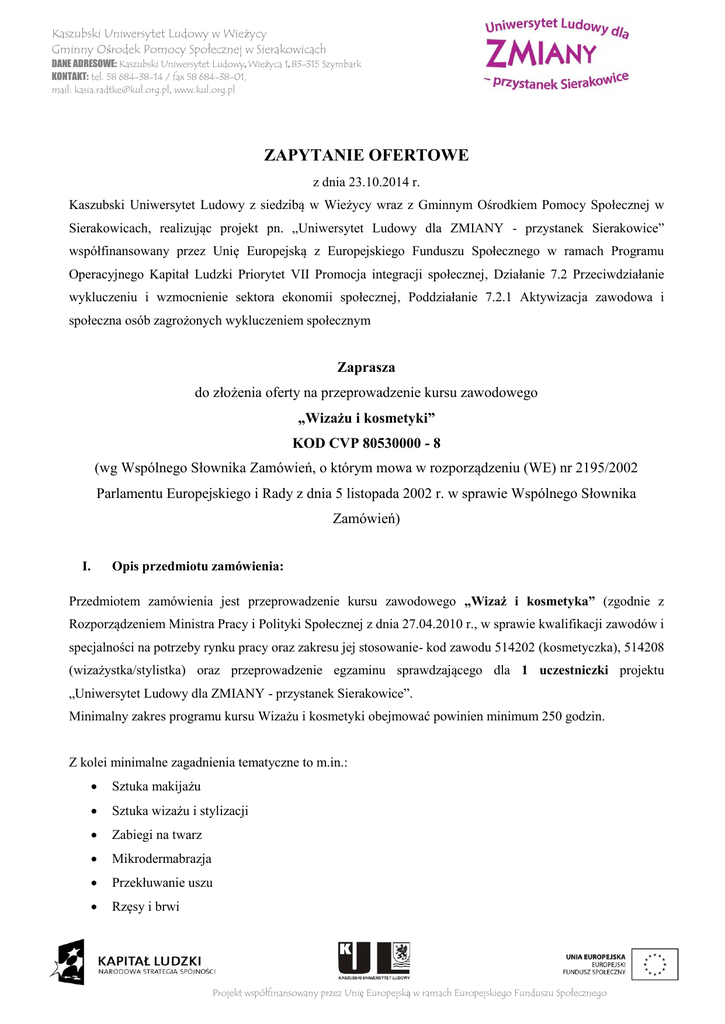 Kaszubski Uniwersytet Ludowy w Wieżycy Gminny Ośrodek Pomocy Społecznej w Sierakowicach DANE ADRESOWE: Kaszubski Uniwersytet Ludowy, Wieżyca 1, 83-315 Szymbark KONTAKT: tel. 58 684-38-14 / fax 58 684-38-01, mail: [email protected], www.kul.org.pl ZAPYTANIE OFERTOWE z dnia 23.10.2014 r. Kaszubski Uniwersytet Ludowy z siedzibą w Wieżycy wraz z Gminnym Ośrodkiem Pomocy Społecznej w Sierakowicach, realizując projekt pn. „Uniwersytet Ludowy dla ZMIANY - przystanek Sierakowice” współfinansowany przez Unię Europejską z Europejskiego Funduszu Społecznego w ramach Programu Operacyjnego Kapitał Ludzki Priorytet VII Promocja integracji społecznej, Działanie 7.2 Przeciwdziałanie wykluczeniu i wzmocnienie sektora ekonomii społecznej, Poddziałanie 7.2.1 Aktywizacja zawodowa i społeczna osób zagrożonych wykluczeniem społecznym Zaprasza do złożenia oferty na przeprowadzenie kursu zawodowego „Wizażu i kosmetyki” KOD CVP 80530000 - 8 (wg Wspólnego Słownika Zamówień, o którym mowa w rozporządzeniu (WE) nr 2195/2002 Parlamentu Europejskiego i Rady z dnia 5 listopada 2002 r. w sprawie Wspólnego Słownika Zamówień) Opis przedmiotu zamówienia: I. Przedmiotem zamówienia jest przeprowadzenie kursu zawodowego „Wizaż i kosmetyka” (zgodnie z Rozporządzeniem Ministra Pracy i Polityki Społecznej z dnia 27.04.2010 r., w sprawie kwalifikacji zawodów i specjalności na potrzeby rynku pracy oraz zakresu jej stosowanie- kod zawodu 514202 (kosmetyczka), 514208 (wizażystka/stylistka) oraz przeprowadzenie egzaminu sprawdzającego dla 1 uczestniczki projektu „Uniwersytet Ludowy dla ZMIANY - przystanek Sierakowice”. Minimalny zakres programu kursu Wizażu i kosmetyki obejmować powinien minimum 250 godzin. Z kolei minimalne zagadnienia tematyczne to m.in.: Sztuka makijażu Sztuka wizażu i stylizacji Zabiegi na twarz Mikrodermabrazja Przekłuwanie uszu Rzęsy i brwi Projekt współfinansowany przez Unię Europejską w ramach Europejskiego Funduszu Społecznego Kaszubski Uniwersytet Ludowy w Wieżycy Gminny Ośrodek Pomocy Społecznej w Sierakowicach DANE ADRESOWE: Kaszubski Uniwersytet Ludowy, Wieżyca 1, 83-315 Szymbark KONTAKT: tel. 58 684-38-14 / fax 58 684-38-01, mail: [email protected], www.kul.org.pl Przedłużanie i dopełnianie paznokci Akryl – tipsy Żel – tipsy Zdobnictwo paznokci Manicure hybrydowy french i kolor Pielęgnacja i masaż dłoni Aromaterapia Pedicure Depilacja pastą cukrową II. Miejsce i termin realizacji zamówienia: Lokalizacja: Powiat kartuski. Dopuszcza się realizację kursu na terenie Trójmiasta, jednakże w programie (godziny realizacji kursu) należy uwzględnić kwestie dojazdu uczestniczek komunikacją publiczną – uczestniczki są mieszkankami Gminy Sierakowice. Przewidywany termin realizacji zamówienia: 12.11.2014 r. - 12.01.2015 r. III. 1. Kryteria jakościowe zamówienia: Instytucja szkoleniowa powinna przeprowadzić kurs zawodowy oraz egzamin zgodnie z wszystkimi aktami prawnymi regulującymi nową edukację zawodową, w tym z Rozporządzeniem MEN z dnia 11 stycznia 2012 r. w sprawie kształcenia ustawicznego w formach pozaszkolnych (Dz. U. poz. 186) (dostępnymi na stronie www.men.gov.pl) oraz wszelkimi obowiązującymi wytycznymi w w/w zakresie. 2. Kurs musi trwać nie mniej niż 250 godzin, w tym 80 % czasu trwania kursu muszą stanowić zajęcia praktyczne w salonie kosmetycznym. 3. Łączna liczba godzin szkolenia zajęć praktycznych i teoretycznych przypadająca na 1 osobę szkoloną musi być wystarczająca do przekazania wiedzy i umiejętności dotyczących przedmiotowego kursu. 4. Wykonawca zobowiązuje się do zapewnienie ciepłego i zimnego napoju podczas zajęć teoretycznych (kawa, herbata, woda). 5. Wykonawca zobowiązuje się do zapewnienia odpowiedniego zaplecza niezbędnego do przeprowadzenia kursu tj.: sala szkoleniowa do przeprowadzenia zajęć teoretycznych z dostępem do WC, wyposażona w stoły i krzesła, sala powinna być wietrzona lub klimatyzowana, w wyposażeniu sali powinien znajdować się rzutnik i ekran lub laptop do wyświetlania prezentacji multimedialnych oraz tablica flipchart; salon kosmetyczny powinien posiadać co najmniej 2 samodzielne stanowiska pracy wyposażone w niezbędny sprzęt i akcesoria kosmetyczne. Zajęcia muszą odbywać się przy użyciu produktów bardzo dobrej jakości, różnorodnych pod względem kolorystycznym jak i rozmiarowym (tipsy, rzęsy, ozdoby). Podczas Projekt współfinansowany przez Unię Europejską w ramach Europejskiego Funduszu Społecznego Kaszubski Uniwersytet Ludowy w Wieżycy Gminny Ośrodek Pomocy Społecznej w Sierakowicach DANE ADRESOWE: Kaszubski Uniwersytet Ludowy, Wieżyca 1, 83-315 Szymbark KONTAKT: tel. 58 684-38-14 / fax 58 684-38-01, mail: [email protected], www.kul.org.pl zajęć uczestnicy powinni korzystać ze sprawnych i bardzo wysokiej jakości narzędzi (w tym pędzli) i urządzeń – sprzęt specjalistyczny (np. frezarka, lampy UV). 6. Wykonawca zapewni uczestniczce kursu badania lekarskie niezbędne do rozpoczęcia kursu oraz ubezpieczenie NNW na okres realizacji kursu. 7. Wykonawca zobowiązuje się do prowadzenia kursu zgodnie z przepisami bezpieczeństwa i higieny pracy oraz zapoznania uczestników z obowiązującymi przepisami BHP. 8. Wykonawca zobowiązuje się zapewnić uczestniczce materiały szkoleniowe i dydaktyczne niezbędne do uczestnictwa w kursie. Uczestniczka kursu powinna otrzymać pakiet startowy (na własność) składający się minimum z pakietu żelów do frenchu + kolor, pakietu akryli do frenchu + kolor. 9. Zajęcia teoretyczne i praktyczne muszą być prowadzone przez uprawnionych instruktorów posiadających kierunkowe wykształcenie/kwalifikacje niezbędne do prowadzenia tego typu szkoleń. 10. Wykonawca zobowiązuje się prowadzić dziennik zajęć, sprawdzać listę obecności uczestników kursu a także dbać o formalności związane z imiennymi potwierdzeniami odbioru materiałów szkoleniowych, z