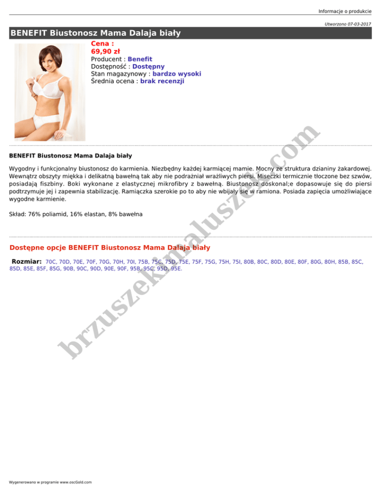 Informacje o produkcie Utworzono 07-03-2017 BENEFIT Biustonosz Mama Dalaja biały Cena : 69,90 zł us ze k. co m Producent : Benefit Dostępność : Dostępny Stan magazynowy : bardzo wysoki Średnia ocena : brak recenzji BENEFIT Biustonosz Mama Dalaja biały Wygodny i funkcjonalny biustonosz do karmienia. Niezbędny każdej karmiącej mamie. Mocny ze struktura dzianiny żakardowej. Wewnątrz obszyty miękka i delikatną bawełną tak aby nie podrażniał wrażliwych piersi. Miseczki termicznie tłoczone bez szwów, posiadają fiszbiny. Boki wykonane z elastycznej mikrofibry z bawełną. Biustonosz doskonal;e dopasowuje się do piersi podtrzymuje jej i zapewnia stabilizację. Ramiączka szerokie po to aby nie wbijały się w ramiona. Posiada zapięcia umożliwiające wygodne karmienie. al Skład: 76% poliamid, 16% elastan, 8% bawełna ze ki m Dostępne opcje BENEFIT Biustonosz Mama Dalaja biały br z us Rozmiar: 70C, 70D, 70E, 70F, 70G, 70H, 70I, 75B, 75C, 75D, 75E, 75F, 75G, 75H, 75I, 80B, 80C, 80D, 80E, 80F, 80G, 80H, 85B, 85C, 85D, 85E, 85F, 85G, 90B, 90C, 90D, 90E, 90F, 95B, 95C, 95D, 95E. Wygenerowano w programie www.oscGold.com