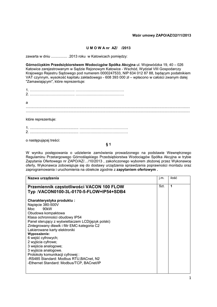 Wzór umowy ZAPO/AZ/32/11/2013 U M O W A nr AZ/ /2013 zawarta w dniu ................ .2013 roku w Katowicach pomiędzy: Górnośląskim Przedsiębiorstwem Wodociągów Spółka Akcyjna ul. Wojewódzka 19, 40 – 026 Katowice zarejestrowanym w Sądzie Rejonowym Katowice - Wschód, Wydział VIII Gospodarczy Krajowego Rejestru Sądowego pod numerem 0000247533, NIP 634 012 87 88, będącym podatnikiem VAT czynnym, wysokość kapitału zakładowego - 608 393 000 zł – wpłacono w całości zwanym dalej "Zamawiającym", które reprezentuje: 1. ………………………………. …………………………………. 2. ………………………………. …………………………………. a .................................................................................................................................................................. .................................................................................................................................................................. które reprezentuje: 1. ................................................ …………………………………. 2. ................................................ …………………………………. o następującej treści: §1 W wyniku postępowania o udzielenie zamówienia prowadzonego na podstawie Wewnętrznego Regulaminu Przetargowego Górnośląskiego Przedsiębiorstwa Wodociągów Spółka Akcyjna w trybie Zapytania Ofertowego nr ZAPO/AZ/…/10/2013 , zakończonego wyborem złoŜonej przez Wykonawcę oferty, Wykonawca zobowiązuje się do dostawy urządzenia sprawdzenia poprawności montaŜu oraz zaprogramowania i uruchomienia na obiekcie zgodnie z zapytaniem ofertowym . Nazwa urządzenia j.m. ilość Przemiennik częstotliwości VACON 100 FLOW Typ :VACON0100-3L-0170-5-FLOW+IP54+SDB4 Szt. 1 Charakterystyka produktu : Napięcie 380-500V Moc 90kW Obudowa kompaktowa Klasa ochronności obudowy IP54 Panel sterujący z wyświetlaczem LCD(język polski) Zintegrowany dławik i filtr EMC-kategoria C2 Lakierowane karty elektroniki WyposaŜenie: 6 wejść cyfrowych; 2 wyjścia cyfrowe; 3 wejścia analogowe; 3 wyjścia analogowe. Protokoły komunikacji cyfrowej : -RS485 Standard: Modbus RTU,BACnet, N2 -Ethernet Standard: Modbus/TCP, BACnet/IP 1 W cenie urządzenia wliczone jest sprawdzenie poprawności montaŜu zaprogramowanie i uruchomienie przez wykonawcę przemiennika w obiekcie. §2 1. Wykonawca zobowiązuje się do dostarczenia własnym transportem, na własny koszt i ryzyko towar stanowiący przedmiot umowy w terminie do 30 dni roboczych od daty podpisania umowy do Górnośląskie Przedsiębiorstwo Wodociągów S.A. ZZUW „Wschód” Stacja Uzdatniania Wody „Łazy” 42-525 Dąbrowa Górnicza , ul. Wypaleniska 11 Tel. 32 264 04 35 2. Wykonawca powiadomi Zamawiającego o planowanym terminie dostawy w terminie nie krótszym niŜ 2 dni przed faktycznym terminem dostawy. 3. Osobą upowaŜnioną ze strony Zamawiającego do odbioru przedmiotu umowy jest Pan Zbigniew Maroszek tel. kontaktowy 32 294 81 35 , 692 441 376 [email protected] lub inna upowaŜniona osoba . 4. Osobą upowaŜnioną ze strony Wykonawcy do przekazania przedmiotu umowy będą Pani/Pan …………………………………………………….. nr telefonu …………………………………………………. 5. Odbiór przedmiotu umowy zostanie potwierdzony w protokole zdawczo-odbiorczym , który będzie stanowił podstawę do wystawienia faktury VAT. 6. Po zamontowaniu i podłączeniu przedmiotu zamówienia , Zamawiający poinformuje o terminie zaprogramowania i uruchomienia urządzenia, faksem lub e-mailem osobę upowaŜnioną ze strony Wykonawcy………………………… Wykonanie usługi zaprogramowania i uruchomienia przetwornicy częstotliwości zostanie potwierdzone w protokole odbiorczym, który będzie stanowił podstawę do wystawienia faktury VAT. 7. Zamawiający, bez jakichkolwiek roszczeń finansowych ze strony Wykonawcy ,moŜe odmówić odbioru przedmiotu umowy w n/w przypadkach: a/ w razie stwierdzenia w czasie odbioru niekompletności lub uszkodzenia po uruchomieniu urządzenia - Wykonawca zobowiązany jest dokonać w terminie 14 dni wymiany na urządzenie sprawne i spełniające nasze wymagania. b/ jeŜeli termin dostawy nie był z nim uprzednio uzgodniony §3 W dniu odbioru przedmiotu umowy Wykonawca zobowiązany jest przekazać Zamawiającemu wszelkie dokumenty w języku polskim, związane z przedmiotem umowy, tj: Kartę gwarancyjną w języku polskim– okres gwarancji 18 m-cy na przedmiot zamówienia liczonej od daty dostawy. Instrukcję obsługi w języku polskim Certyfikat CE Brak wymaganych dokumentów moŜe skutkować odmową podpisania dokumentu odbioru i odmową zapłaty do czasu przedłoŜenia dokumentów. W razie nie przedłoŜenia dokumentów terminie 7 dni Zamawiający ma prawo odstąpić od umowy §4 1. Wartość niniejszej umowy wynosi 2 a. netto ………………………………………….. zł słownie: ………………………………………… b. brutto………………………………………….. zł słownie:…………………………………………. Do wartości netto została doliczona kwota podatku VAT zgodnie z obowiązującymi przepisami. Wartość powyŜsza wynika ze złoŜonej przez Wykonawcę oferty z dnia ……………………………. 2. Zamawiający ma obowiązek dokonania przelewu – zapłaty w terminie 30 dni od daty otrzymania faktury VAT na konto Wykonawcy wskazane w fakturze w wysokości 95% wartości urządzenia po jego dostawie oraz przekazaniu niezbędnej dla przedmiotu umowy dokumentację podanej w § 3 niniejszej umowy. 3. Podstawą wystawienia faktury końcowej w wysokości 5% wartości urządzenia, będzie podpisany przez upowaŜnionych przedstawicieli Zamawiającego i Wykonawcy protokół ze skutecznego przeprowadzenia zaprogramowania i uruchomienia urządzenia. 4. Zamawiający upowaŜnia Wykona