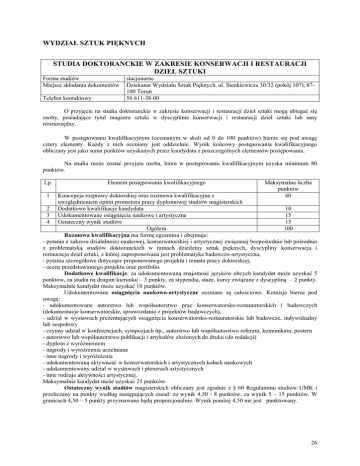 WYDZIAŁ SZTUK PIĘKNYCH STUDIA DOKTORANCKIE W ZAKRESIE KONSERWACJI I RESTAURACJI DZIEŁ SZTUKI Forma studiów Miejsce składania dokumentów Telefon kontaktowy stacjonarne Dziekanat Wydziału Sztuk Pięknych, ul. Sienkiewicza 30/32 (pokój 107), 87100 Toruń 56 611-38-00 O przyjęcie na studia doktoranckie w zakresie konserwacji i restauracji dzieł sztuki mogą ubiegać się osoby, posiadające tytuł magistra sztuki w dyscyplinie konserwacji i restauracji dzieł sztuki lub inny równorzędny. W postępowaniu kwalifikacyjnym (ocenianym w skali od 0 do 100 punktów) bierze się pod uwagę cztery elementy. Każdy z nich oceniany jest oddzielnie. Wynik końcowy postępowania kwalifikacyjnego obliczany jest jako suma punktów uzyskanych przez kandydata z poszczególnych elementów postępowania. Na studia może zostać przyjęta osoba, która w postępowaniu kwalifikacyjnym uzyska minimum 80 punktów. Lp. 1 Element postępowania kwalifikacyjnego Maksymalna liczba punktów 60 Koncepcja rozprawy doktorskiej oraz rozmowa kwalifikacyjna z uwzględnieniem opinii promotora pracy dyplomowej studiów magisterskich 2 Dodatkowe kwalifikacje kandydata 10 3 Udokumentowane osiągnięcia naukowe i artystyczne 15 4 Ostateczny wynik studiów 15 Ogółem 100 Rozmowa kwalifikacyjna ma formę egzaminu i obejmuje: - pytania z zakresu działalności naukowej, konserwatorskiej i artystycznej związanej bezpośrednio lub pośrednio z problematyką studiów doktoranckich w ramach dziedziny sztuk pięknych, dyscypliny konserwacja i restauracja dzieł sztuki, z której zaproponowana jest problematyka badawczo-artystyczna, - pytania szczegółowe dotyczące proponowanego projektu i tematu pracy doktorskiej, - ocenę przedstawionego projektu oraz portfolio. Dodatkowe kwalifikacje: za udokumentowaną znajomość języków obcych kandydat może uzyskać 5 punktów, za studia na drugim kierunku – 3 punkty, za stypendia, staże, kursy związane z dyscypliną – 2 punkty. Maksymalnie kandydat może uzyskać 10 punktów. Udokumentowane osiągnięcia naukowo-artystyczne oceniane są całościowo. Komisja bierze pod uwagę: - udokumentowane autorstwo lub współautorstwo prac konserwatorsko-restauratorskich i badawczych (dokumentacje konserwatorskie, sprawozdania z projektów badawczych), - udział w wystawach prezentujących osiągnięcia konserwatorsko-restauratorskie lub badawcze, indywidualny lub zespołowy - czynny udział w konferencjach, sympozjach itp., autorstwo lub współautorstwo referatu, komunikatu, posteru - autorstwo lub współautorstwo publikacji i artykułów złożonych do druku (do redakcji) - dyplom z wyróżnieniem - nagrody i wyróżnienia uczelniane - inne nagrody i wyróżnienia - udokumentowaną aktywność w konserwatorskich i artystycznych kołach naukowych - udokumentowany udział w wystawach i plenerach artystycznych - inne rodzaje aktywności artystycznej. Maksymalnie kandydat może uzyskać 25 punktów. Ostateczny wynik studiów magisterskich obliczany jest zgodnie z § 60 Regulaminu studiów UMK i przeliczany na punkty według następujących zasad: za wynik 4,50 - 8 punktów, za wynik 5 – 15 punktów. W granicach 4,50 – 5 punkty przyznawane będą proporcjonalnie. Wynik poniżej 4,50 nie jest punktowany. 26