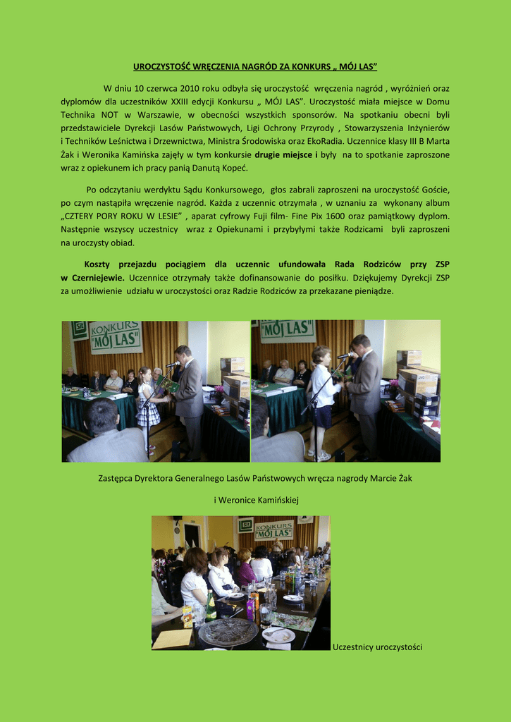 UROCZYSTOŚĆ WRĘCZENIA NAGRÓD ZA KONKURS „ MÓJ LAS” W dniu 10 czerwca 2010 roku odbyła się uroczystośd wręczenia nagród , wyróżnieo oraz dyplomów dla uczestników XXIII edycji Konkursu „ MÓJ LAS”. Uroczystośd miała miejsce w Domu Technika NOT w Warszawie, w obecności wszystkich sponsorów. Na spotkaniu obecni byli przedstawiciele Dyrekcji Lasów Paostwowych, Ligi Ochrony Przyrody , Stowarzyszenia Inżynierów i Techników Leśnictwa i Drzewnictwa, Ministra Środowiska oraz EkoRadia. Uczennice klasy III B Marta Żak i Weronika Kamioska zajęły w tym konkursie drugie miejsce i były na to spotkanie zaproszone wraz z opiekunem ich pracy panią Danutą Koped. Po odczytaniu werdyktu Sądu Konkursowego, głos zabrali zaproszeni na uroczystośd Goście, po czym nastąpiła wręczenie nagród. Każda z uczennic otrzymała , w uznaniu za wykonany album „CZTERY PORY ROKU W LESIE” , aparat cyfrowy Fuji film- Fine Pix 1600 oraz pamiątkowy dyplom. Następnie wszyscy uczestnicy wraz z Opiekunami i przybyłymi także Rodzicami byli zaproszeni na uroczysty obiad. Koszty przejazdu pociągiem dla uczennic ufundowała Rada Rodziców przy ZSP w Czerniejewie. Uczennice otrzymały także dofinansowanie do posiłku. Dziękujemy Dyrekcji ZSP za umożliwienie udziału w uroczystości oraz Radzie Rodziców za przekazane pieniądze. Zastępca Dyrektora Generalnego Lasów Paostwowych wręcza nagrody Marcie Żak i Weronice Kamioskiej Uczestnicy uroczystości