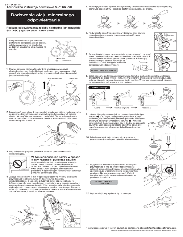SI-0116A-001-03 Techniczna instrukcja serwisowa SI-0116A-001 5. Poziom płynu w lejku spadnie. Dlatego należy kontynuować uzupełnianie lejku olejem, aby zachować poziom płynu i zapobiec dostaniu się powietrza do środka. Dodawanie oleju mineralnego i odpowietrzanie Podczas odpowietrzania zacisku niezbędne jest narzędzie SM-DISC (lejek do oleju i korek oleju). 6. Kiedy bąbelki powietrza przestaną wydostawać się z zaworu odpowietrzającego, należy tymczasowo dokręcić zawór odpowietrzający. Śruba odpowietrzająca Kiedy podkładka do odpowietrzania (żółta) nadal podłączona jest do zacisku, należy ustawić rower na stojaku lub podobnym urządzeniu, jak pokazano na rysunku. 7. Przy wciśniętej dźwigni hamulca należy szybko otworzyć i zamknąć zawór odpowietrzający (na około 0,5 sekundy za każdym razem) w celu uwolnienia wszelkich pęcherzyków powietrza, które mogą znajdować się w zacisku. Powtórzyć tę czynność 2-3 razy. Następnie ponownie dokręcić zawór odpowietrzający. Linka Zacisk hamulca 1. Ustawić dźwignię hamulca tak, aby była umieszczona w pozycji eksploatacyjnej, przy kącie 45 stopni względem ziemi, a następnie zdjąć górną śrubę odpowietrzającą i o-ring oraz włożyć lejek oleju. Nie wkładać jeszcze blokady oleju. Śruba odpowietrzająca Lejek do oleju Moment dokręcania: 4 - 6 Nm 8. Jeżeli następnie zostanie naciśnięta dźwignia hamulca, pęcherzyki powietrza w układzie przedostaną się przez wylot do lejka. Kiedy pęcherzyki przestaną się wydostawać, należy wcisnąć dźwignię hamulca tak mocno, jak to możliwe. W normalnych warunkach dźwignia hamulca powinna być sztywna w tym miejscu. O-ring Działanie dźwigni Luźna Trochę sztywna Sztywna 2. Przygotować klucz płaski 7 mm, napełnić strzykawkę olejem, podłączyć rurkę do zaworu odpowietrzającego i otworzyć zawór, luzując ją o 1/8 pełnego obrotu. Wcisnąć tłoczek strzykawki i dodać olej. Olej zacznie wypływać z lejka. Kontynuować dodawanie oleju, dopóki w wypływającym oleju będą widoczne bąbelki powietrza. 9. Ustawić dźwignię poziomo (jak na rysunku) i przechylić ją w kierunku 1 o 30 stopni. Następnie wykonać krok 8, aby sprawdzić, czy w środku nie pozostało powietrze. Następnie przechylić dźwignię o 30 stopni w kierunku 2 i wykonać ponownie krok 8, aby sprawdzić, czy w środku nie pozostało powietrze. Jeśli pojawią się bąbelki powietrza, powtórzyć powyższą procedurę tyle razy, aż bąbelki przestaną być widoczne. Korek oleju 10. Zablokować lejek oleju korkiem tak, aby strona z przymocowanym o-ringiem była skierowana do dołu. Śruba odpowietrzająca O-ring 3. Gdy z oleju znikną bąbelki powietrza, zamknąć tymczasowo zawór odpowietrzający. W tym momencie nie należy w sposób ciągły naciskać i puszczać dźwigni. Jeżeli zasada ta nie jest przestrzegana, wewnątrz zacisku mogą pozostać pęcherzyki powietrza zmieszane z olejem i proces odpowietrzania może trwać dłużej. (Jeżeli dźwignia jest naciskana i puszczana w sposób ciągły, należy spuścić cały olej i ponownie dodać nieco oleju.) 4. Założyć klucz oczkowy 7 mm w sposób pokazany na rysunku a następnie przymocować torebkę na rurce. Podłączyć rurkę do zaworu odpowietrzającego, a następnie poluzować zawór odpowietrzający. Po krótkim czasie olej wraz z powietrzem przedostaną się w sposób naturalny z zaworu odpowietrzającego do rurki. W ten sposób możliwe będzie usunięcie większej części powietrza pozostającego w układzie hamulcowym. Pomocne może być delikatne potrząsanie przewodem, delikatne stukanie wkrętakiem w zbiornik lub zacisk, a także poruszanie zaciskiem. 11. Wyjąć lejek z zamocowanym korkiem, a następnie przymocować o-ring do śruby odpowietrzającej i dokręcić śrubę odpowietrzającą, aż olej wycieknie, aby upewnić się, że w zbiorniku nie ma już pęcherzyków powietrza. Nie wolno wówczas używać dźwigni hamulca, gdyż może to spowodować dostanie się powietrza do cylindra. O-ring Moment dokręcania: 0,3 - 0,5 Nm 12. Wytrzeć olej, który wydostał się na zewnątrz. Worek Powietrze * Instrukcje serwisowe w innych językach są dostępne na stronie: http://techdocs.shimano.com Uwaga: w razie wprowadzenia ulepszeń dane techniczne mogą ulec zmianie bez powiadomienia. (Polish)