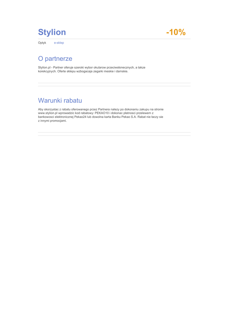 Stylion Optyk e-sklep O partnerze Stylion.pl - Partner oferuje szeroki wybor okularow przeciwsłonecznych, a takze korekcyjnych. Oferte sklepu wzbogacaja zegarki meskie i damskie. Warunki rabatu Aby skorzystac z rabatu oferowanego przez Partnera nalezy po dokonaniu zakupu na stronie www.stylion.pl wprowadzic kod rabatowy: PEKAO10 i dokonac płatnosci przelewem z bankowosci elektronicznej Pekao24 lub dowolna karta Banku Pekao S.A. Rabat nie łaczy sie z innymi promocjami. -10%