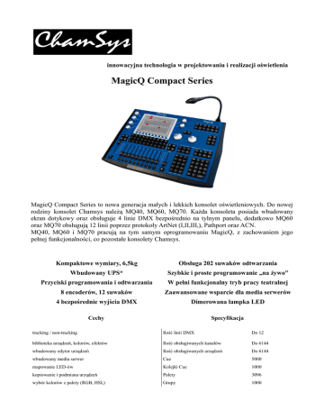 innowacyjna technologia w projektowaniu i realizacji oświetlenia MagicQ Compact Series MagicQ Compact Series to nowa generacja małych i lekkich konsolet oświetleniowych. Do nowej rodziny konsolet Chamsys należą MQ40, MQ60, MQ70. Każda konsoleta posiada wbudowany ekran dotykowy oraz obsługuje 4 linie DMX bezpośrednio na tylnym panelu, dodatkowo MQ60 oraz MQ70 obsługują 12 linii poprzez protokoły ArtNet (I,II,III,), Pathport oraz ACN. MQ40, MQ60 i MQ70 pracują na tym samym oprogramowaniu MagicQ, z zachowaniem jego pełnej funkcjonalności, co pozostałe konsolety Chamsys. Kompaktowe wymiary, 6,5kg Obsługa 202 suwaków odtwarzania Wbudowany UPS* Szybkie i proste programowanie „na żywo” Przyciski programowania i odtwarzania W pełni funkcjonalny tryb pracy teatralnej 8 encoderów, 12 suwaków Zaawansowane wsparcie dla media serwerów 4 bezpośrednie wyjścia DMX Dimerowana lampka LED Cechy Specyfikacja tracking / non-tracking Ilość linii DMX Do 12 biblioteka urządzeń, kolorów, efektów Ilość obsługiwanych kanałów Do 6144 wbudowany edytor urządzeń Ilość obsługiwanych urządzeń Do 6144 wbudowany media serwer Cue 5000 mapowanie LED-ów Kolejki Cue 1000 kopiowanie i podmiana urządzeń Palety 3096 wybór kolorów z palety (RGB, HSI,) Grupy 1000 indywidualne czasy wejścia i opóźnienia dla każdego parametru Współpraca z Media Serwerami 50 (niezależnych) szybki dostęp do funkcji „FAN” dla atrybutów i czasów Enkodery 8 konfigurowalne suwaki – HTP, LTP, master zakresu i szybkości Suwaki 12 tryb pracy teatralnej Przyciski 156 praca w sieci master/slave, backup Ilość bezpośrednich portów DMX512 4 Dimerowana lampka LED 1 jednoczesne odtwarzanie z kilku konsolet Wejście audio 1 wbudowany serwer WWW Kolor obudowy Niebieski wyzwalanie pamięci z zewnątrz Zasilanie 110-240V współpraca z programami do wizualizacji Szerokość 525mm wbudowany kalendarz zadań Głębokość 385mm Wysokość 140mm Waga 6,5kg MIDI & SMPTE (opcja) Zestawienie konsolet MQ40, MQ60, MQ70 Ilość obsługiwanych linii DMX Bezpośrednie porty DMX Sieciowe porty 1GHz port sieci ChamNet Sieciowe porty POE Możliwość podłączenia monitora Gniazda USBna panelu tylnym Gniazda USBna panelu przednim 4 4 4 - 12 4 4 Tak 4 1 12 4 4+1 1 Tak Tak 4 1 Wejście Audio (1 kanał, 7 zakresów) RS232 Przełącznik zdalnego sterowania Gniazdo MIDI wej./wyj. Gniazdo SMPTE wej./wyj. Wbudowane WIFI Tak - Tak Tak Tak Tak - Tak Tak Tak Tak Tak Tak UPS Licznik czasu Lamka LED Dwu kolorowa lampa LED Podświetlane przyciski Pokrowiec ochronny Tak Tak Tak Tak Tak Tak Tak Tak Tak Tak Tak Tak Wyłączny dystrybutor marki Chamsys na terenie Polski: Przesiębiorstwo Specjalistyczne TEATR 05-501 Piaseczno ul.Grabowa 8 Tel: 22 756 26 36 Fax: 22 757 04 54 [email protected] www.teatr.com.pl * Nie dotyczy MQ40