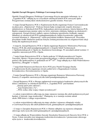 Opolski Zarząd Okręgowy Polskiego Czerwonego Krzyża Opolski Zarząd Okręgowy Polskiego Czerwonego Krzyża uprzejmie informuje, że w „Tygodniu PCK” odbędą się we wszystkich szkolnych kołach PCK uroczyste apele. Przygotowane zostaną także okolicznościowe gazetki ścienne. Poza tym: - 6 maja Zarząd Rejonowy PCK w Kędzierzynie-Koźlu organizuje Festyn Czerwonokrzyski na placu przy „Hipernowej”. Podczas festynu będą występowały zespoły dziecięce i młodzieżowe ze Szkolnych Kół PCK, będą pokazy pierwszej pomocy, loteria fantowa PCK. Będzie zorganizowany pomiar cukru we krwi, mierzenie ciśnienia, badanie na cholesterol i osteoporozę. Zarząd również zadbał o sprawy kulinarne (grochówka, kiełbaski, napoje). Młodzież ze szkolnych kół PCK podangimnazjalnych, będzie kwestowała i pakowała żywność klientom w „Hipernowej” celem pozyskania środków finansowych. Wszystkie pozyskane środki finansowe podczas festynu zostaną przeznaczone na zorganizowanie akcji letniej dla najuboższych dzieci. - 6 maja br. Zarząd Rejonowy PCK w Opolu organizuje Rejonowe Mistrzostwa Pierwszej Pomocy PCK dla szkól ponadgimnazjalnych w Zespole Szkół Technicznych i Ogólnokształcących w Opolu im. Kazimierza Gzowskiego. W zawodach udział weźmie 11 zespołów ratowniczych PCK z Opola. - 7 maja Grupa Ratownictwa PCK w Opolu podczas VI Międzynarodowych Targów Turystyki, Sportu i Wypoczynku przygotowała pokazy z zakresu udzielania pierwszej pomocy dla społeczeństwa w godzinach od 1000-1800. Targi odbędą się w Hali WidowiskowoSportowej „Okrąglak” w Opolu. - 7 maja Klub Honorowych Dawców Krwi PCK przy Parafii Świętego Ducha w Kędzierzynie-Koźlu organizuje otwarty pobór krwi z Regionalnym Centrum Krwiodawstwa i Krwiolecznictwa w Opolu. - 9 maja Zarząd Rejonowy PCK w Brzegu organizuje Rejonowe Mistrzostwa Pierwszej Pomocy (5 zespołów ratowniczych) dla szkół ponadgimnazjalnych. - Zarząd Rejonowy PCK w Brzegu zaplanował rozstrzygnięcie konkursów plastycznych dla dzieci i młodzieży ze szkolnych kół PCK w „Tygodniu PCK” pod hasłami: „Dzisiaj sport jutro zdrowie”, „ Żyje bezpiecznie a Ty”, „ PCK wobec ofiar wojny i klęsk żywiołowych”. - w całym województwie odbywają się etapy rejonowe turnieju dla szkół podstawowych pod hasłem „Człowiek i jego środowisko”. Planujemy że w turnieju weźmie udział około 3000 dzieci z całego województwa. - w całym województwie odbywają się etapy szkolne i rejonowe olimpiady wiedzy o Czerwonym Krzyży dla szkół podstawowych, gimnazjalnych i ponadgimnazjalnych - 12 maja w Zarządzie Rejonowym PCK w Oleśnie odbędzie się rejonowa olimpiada zdrowego stylu życia dla szkół gimnazjalnych i ponadgimnazjalnych. - 13 maja odbędą się Wojewódzkie Zawody Strzeleckie Honorowych Dawców Krwi PCK w Nysie. Celem zawodów jest integracja środowiska krwiodawców i promowanie zdrowego stylu życia w środowisku krwiodawców. - 16 maja odbędzie się akcja pobierania krwi z udziałem młodzieży na terenie miasta Opola. Podczas poboru krwi będą pokazy udzielania pierwszej pomocy, mierzenie ciśnienia, punkt informacyjny, rozdawanie balonów z logiem sponsora Deutsche Bank i znakiem PCK. Podczas akcji będzie kwestowała młodzież czerwonokrzyska na ulicach miasta Opola będą rozdawane cukierki. Wszyscy dawcy zostaną poczęstowani żurkiem z kiełbaską i jajkiem, a na pierwszorazowych czekają dodatkowo upominki. - 17 maja Zarząd Rejonowy PCK w Opolu organizuje etap rejonowy olimpiady promocji zdrowego stylu życia dla szkół gimnazjalnych i ponadgimnazjalinych oraz etap rejonowy turnieju „Człowiek i jego środowisko PCK” oraz olimpiady o Czerwonym Krzyżu. O wszystkich akcjach zostaną poinformowane media lokalne.