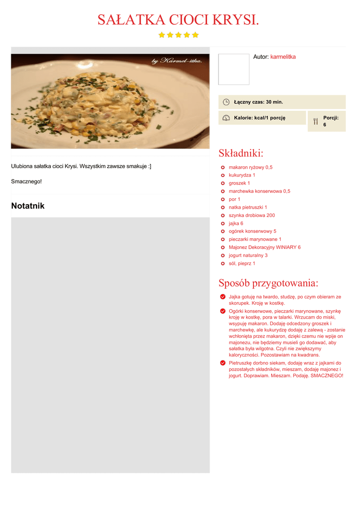 SAŁATKA CIOCI KRYSI. Autor: karmelitka Łączny czas: 30 min. Kalorie: kcal/1 porcję Porcji: 6 Składniki: Ulubiona sałatka cioci Krysi. Wszystkim zawsze smakuje :] makaron ryżowy 0,5 kukurydza 1 Smacznego! groszek 1 marchewka konserwowa 0,5 por 1 Notatnik natka pietruszki 1 szynka drobiowa 200 jajka 6 ogórek konserwowy 5 pieczarki marynowane 1 Majonez Dekoracyjny WINIARY 6 jogurt naturalny 3 sól, pieprz 1 Sposób przygotowania: Jajka gotuję na twardo, studzę, po czym obieram ze skorupek. Kroję w kostkę. Ogórki konserwowe, pieczarki marynowane, szynkę kroję w kostkę, pora w talarki. Wrzucam do miski, wsypuję makaron. Dodaję odcedzony groszek i marchewkę, ale kukurydzę dodaję z zalewą zostanie wchłonięta przez makaron, dzięki czemu nie wpije on majonezu, nie będziemy musieli go dodawać, aby sałatka była wilgotna. Czyli nie zwiększymy kaloryczności. Pozostawiam na kwadrans. Pietruszkę dorbno siekam, dodaję wraz z jajkami do pozostałych składników, mieszam, dodaję majonez i jogurt. Doprawiam. Mieszam. Podaję. SMACZNEGO!