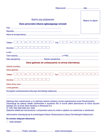 Miejscowość ……………………….. data………………… KARTA ZGŁOSZENIOWA Miejsce na zdjęcie Dane personalne lekarza zgłaszającego wniosek Imię………………………………………………........................................ Nazwisko ……………………………………………………………………… Adres do korespondencji ............................................................................................................ ………………………………………………………………………………………………………………………………...……..… Telefon - Komórka Fax - e-mail................................................................................................................................................................................... Tytuł naukowy...........................................................................................nr PWZ ……………..……..……………..………. Data specjalizacji................................................ Stopień specjalizacji............................................................................... Dane gabinetu do umieszczenia na stronę internetową Gabinet prywatny................................................................................................................................................................. Adres gabinetu ………………………………………………………………………...………………………………………..…… Telefon - Komórka Fax - Adres strony www............................................................................................................................................................... e-mail gabinetu ................................................................................................................................................................... Szczególne zainteresowania dotyczące dermatologii estetycznej .................................................................................... ............................................................................................................................................................................................ ............................................................................................................................................................................................ Deklaruję chęć uczestniczenia, w co najmniej w jednym szkoleniu rocznie organizowanym przez Stowarzyszenie. Zobowiązuję się wpłacać składki członkowskie w wysokości 500 zł rocznie płatne jednorazowo do końca stycznia każdego roku na konto: Bank Handlowy w Warszawie S.A. 37 1030 1654 0000 0000 5431 2000 Opłacenie składki jest równoznaczne z otrzymaniem prawa do zniżek w opłatach za uczestnictwo w szkoleniach. Jednocześnie zobowiązuję się do przestrzegania Statutu Stowarzyszenia Lekarzy Dermatologów Estetycznych. Do wniosku dołączam dokumenty: kartę zabiegów Data........................ Podpis i pieczątka.................................. osoba rekomendująca ................................................ KARTA ZABIEGÓW 1 . Eksfoliacje a) powierzchowne 2. b) średnio głębokie c) głębokie d) dermabrazja od roku.............................. rodzaj preparatu......................................................................... od roku............................... rodzaj preparatu......................................................................... od roku.............................. rodzaj preparatu......................................................................... od roku............................... Wypełnianie zmarszczek od roku............................... rodzaj preparatu......................................................................... ..................................................................................................... ..................................................................................................... 3. Zabiegi z użyciem toksyny botulinowej od roku............................... rodzaj preparatu......................................................................... .................................................................................................... .................................................................................................... 4. Zabiegi mezoterapii od roku................................ rodzaj preparatu.......................................................................... ..................................................................................................... 5. Skleroterapia od roku............................. 6. Kriochirurgia od roku............................. 7. Elektrokoagulacja od roku............................. 9 Chirurgiczne usuwanie zmian skórnych od roku............................. 10 Zabiegi laserowe rodzaj lasera - epilacja od roku..................................... ................................................................................ - usuwanie zmian naczyniowych od roku......................... ................................................................................ - laserbrazja ................................................................................ od roku.......................... 11 Inne zabiegi ........................................................................................................................................................................................................................... ........................................................................................................................................................................................................................... .......................................................................................................................