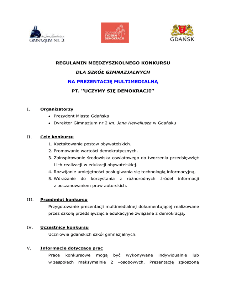 REGULAMIN MIĘDZYSZKOLNEGO KONKURSU DLA SZKÓŁ GIMNAZJALNYCH NA PREZENTACJĘ MULTIMEDIALNĄ PT. ''UCZYMY SIĘ DEMOKRACJI’’ I. Organizatorzy Prezydent Miasta Gdańska Dyrektor Gimnazjum nr 2 im. Jana Heweliusza w Gdańsku II. Cele konkursu 1. Kształtowanie postaw obywatelskich. 2. Promowanie wartości demokratycznych. 3. Zainspirowanie środowiska oświatowego do tworzenia przedsięwzięć i ich realizacji w edukacji obywatelskiej. 4. Rozwijanie umiejętności posługiwania się technologią informacyjną. 5. Wdrażanie do korzystania z różnorodnych źródeł informacji z poszanowaniem praw autorskich. III. Przedmiot konkursu Przygotowanie prezentacji multimedialnej dokumentującej realizowane przez szkołę przedsięwzięcia edukacyjne związane z demokracją. IV. Uczestnicy konkursu Uczniowie gdańskich szkół gimnazjalnych. V. Informacje dotyczące prac Prace konkursowe w zespołach mogą maksymalnie być 2 wykonywane –osobowych. indywidualnie Prezentację lub zgłoszoną do konkursu należy wykonać w programie PowerPoint (pakiet programu Microsoft Office) i zarchiwizować na płycie CD. Prezentacja powinna składać się z 20 – 30 slajdów. Ostatni slajd należy opatrzyć informacjami: imię i nazwisko autora i nauczyciela opiekuna, adres szkoły, telefon kontaktowy. VI. VII. Kryteria oceny zawartość merytoryczna prezentacji, szata graficzna, oryginalność prezentowanego materiału, kreatywność i pomysłowość. Etapy konkursu/terminy ETAP I – złożenie przez szkołę akcesu przystąpienia do Konkursu, nadesłanie Karty zgłoszeniowej (wzór w załączeniu) w terminie do: 30 września 2016r. ETAP II – przesłanie materiału multimedialnego prezentującego realizowane w szkole przedsięwzięcia edukacyjne związane z demokracją w terminie do: 31 października 2016r. na adres: Gimnazjum nr 2 im. Jana Heweliusza ul. Kartuska 32/34 80 – 104 Gdańsk z dopiskiem: KONKURS „Uczymy się demokracji” Kategoria PREZENTACJA MULTIMEDIALNA Praca powinna być opatrzona „Kartą zgłoszeniową" oraz zawierać oświadczenie autora/współautora i zgodę rodziców/prawnych opiekunów dziecka (zgodnie ze wzorem). ETAP III – rozstrzygnięcie konkursu w terminie do: 30 listopada 2016r. VIII. Postanowienia końcowe zgłoszenie udziału w konkursie oznacza pełną i nieodwołalną akceptację niniejszego regulaminu, wyniki konkursu zostaną zamieszczone na stronie Miasta Gdańska oraz Gimnazjum nr 2 im. Jana internetowej Heweliusza w Gdańsku, organizatorzy przewidują nagrody rzeczowe dla zdobywcy I miejsca oraz dwa wyróżnienia, nagrody zostaną wręczone zwycięzcom podczas uroczystej Gali, która odbędzie się w Europejskim Centrum Solidarności w Gdańsku. O terminie Gali laureatów powiadomi organizator. III. Dane kontaktowe organizatora konkursu Gimnazjum nr 2 im. Jana Heweliusza ul. Kartuska 32/34 80 – 104 Gdańsk [email protected] tel. 58 302 22 09 Koordynator kategorii prezentacja multimedialna: Maria Agacińska Formularz zgłoszeniowy Konkurs na prezentację multimedialną ''Uczymy się demokracji’’ Autor/autorzy Imię, nazwisko Klasa Imię, nazwisko, nauczyciela koordynującego pracą konkursową adres e-mail i numer telefonu Tytuł prezentacji Nazwa, adres szkoły miasto, kod, ulica tel. adres e – mail ............................................................. (data) ............................................................. (podpis) OŚWIADCZENIE Oświadczam, że jestem autorem/współautorem*) przesłanej pracy i wyrażam zgodę na jej nieodpłatne wykorzystanie przez organizatora. Materiał jest wolny od roszczeń prawnych i finansowych osób trzecich. Zgodnie z art.. 23 ustawy z dnia 29 sierpnia 1997 O Ochronie Danych Osobowych (Dz. U. 2016 r. poz. 922) wyrażam zgodę na przetwarzanie moich danych osobowych, zawartych w złożonych przeze mnie dokumentach dla potrzeb realizacji do przetwarzania konkursu moich pt. danych „Uczymy osobowych się i demokracji” mojej pracy oraz w celach reklamowych organizatora nie związanych bezpośrednio z konkursem”. _________________________ podpis autora/współautora*) *) niepotrzebne skreślić W przypadku pracy zespołowej, każdy z współautorów wypełnia odrębne oświadczenie ZGODA RODZICÓW/ PRAWNYCH OPIEKUNÓW DZIECKA ……………………………………………………… imię i nazwisko dziecka …………. klasa …………………………………………………….. nazwa i adres szkoły OŚWIADCZENIE Oświadczam, że wyrażam zgodę na udział mojej córki/mojego syna w konkursie organizowanym przez Gimnazjum nr 2 im. Jana Heweliusza w Gdańsku. Znam i akceptuję zapis regulaminu konkursu na prezentację multimedialną pt. ''Uczymy się demokracji’’. W związku z powyższym wyrażam zgodę na publikowanie na stronie internetowej Urzędu Miasta Gdańska oraz Gimnazjum nr 2 im. Jana Heweliusza danych osobowych (imię/nazwisko) oraz wyników uzyskanych przez moją córkę/mojego syna w konkursie. ……….…………………….. (miejscowość, data) ……..….............................…………………………………………. (czytelnie imię i nazwisko rodzica/prawnego opiekuna) Podstawa prawna: Ustawa z dnia 29 sierpnia 1997 r. o ochronie danych osobowych (tekst jednolity: Dz. U. 2016r. poz. 922)