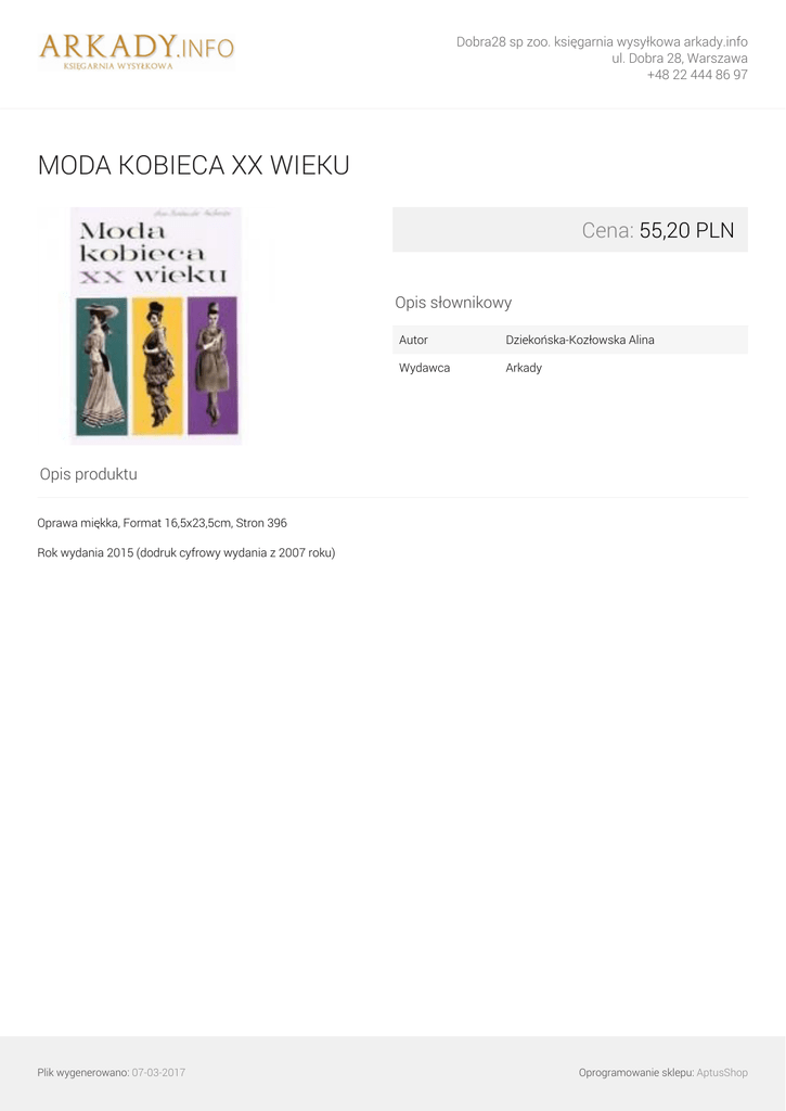 Dobra28 sp zoo. księgarnia wysyłkowa arkady.info ul. Dobra 28, Warszawa +48 22 444 86 97 MODA KOBIECA XX WIEKU Cena: 55,20 PLN Opis słownikowy Autor Dziekońska-Kozłowska Alina Wydawca Arkady Opis produktu Oprawa miękka, Format 16,5x23,5cm, Stron 396 Rok wydania 2015 (dodruk cyfrowy wydania z 2007 roku) Plik wygenerowano: 07-03-2017 Powered by TCPDF (www.tcpdf.org) Oprogramowanie sklepu: AptusShop