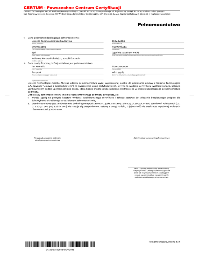 CERTUM - Powszechne Centrum Certyfikacji Unizeto Technologies S.A., ul. Królowej Korony Polskiej 21, 70-486 Szczecin; Korespondencja: ul. Bajeczna 13, 71-838 Szczecin, Infolinia 0-801 540340 Sąd Rejonowy Szczecin-Centrum XIII Wydział Gospodarczy KRS nr 0000233499, NIP: 852-000-64-44, Kapitał zakładowy: 5 600 000 zł (wpłacony w całości) Pełnomocnictwo 1. Dane podmiotu udzielającego pełnomocnictwa: Unizeto Technologies Spółka Akcyjna 810404880 Nazwa podmiotu Numer REGON 0000233499 8520006444 Typ i Nr podstawy prawnej funkcjonowania Numer NIP Sąd Zgodnie z zapisem w KRS Dane organu rejestrowego Imię i nazwisko osoby/osób upoważnionych do reprezentowania podmiotu Królowej Korony Polskiej 21, 70-486 Szczecin Siedziba (adres) 2. Dane osoby fizycznej, której udzielane jest pełnomocnictwo: Jan Kowalski 80010100000 Imię i nazwisko Numer PESEL Paszport AB1234567 Dokument potwierdzający tożsamość Seria i nr dokumentu potwierdzjącego tożsamość Zajmowane stanowisko Unizeto Technologies Spółka Akcyjna udziela pełnomocnictwa wyżej wymienionej osobie do podpisania umowy z Unizeto Technologies S.A., (zwanej "Umową z Subskrybentem") na świadczenie usług certyfikacyjnych, w tym na wydanie certyfikatu kwalifikowanego, którego użytkownikiem będzie upełnomocniona osoba, która będzie mogła składać podpisy elektroniczne w imieniu udzielającego pełnomocnictwa podmiotu. Udzielający pełnomocnictwa w imieniu reprezentowanego podmiotu oświadcza, że: 1. wyraża zgodę na pokrycie kosztów wydania kwalifikowanego certyfikatu i zakupu zestawu do składania bezpiecznego podpisu dla Subskrybenta określonego w udzielanym pełnomocnictwie, 2. przedmiot umowy jest zamówieniem, do którego na podstawie art. 4 pkt. 8 ustawy z dnia 29.01.2004 r. Prawo Zamówień Publicznych (Dz. U. z 2013r. poz. 907 z późn. zm.) nie stosuje się przepisów ww. ustawy z uwagi na fakt, iż jej wartość nie przekracza wyrażonej w złotych równowartości 30000 euro. Pieczęć lub oznaczenie podmiotu udzielającego pełnomocnictwa Data i miejsce wystawienia pełnomocnictwa Data i czytelny podpis osoby upoważnionej lub podpis wraz z pieczątką imienną (zgodnie z KRS lub innym dokumentem określającym zasady reprezentacji) do reprezentowania podmiotu udzielającego pełnomocnictwa. Pełnomocnictwo, strona 1 z 1 01/ 22/ 0/ 592088/ CCK/ 2015