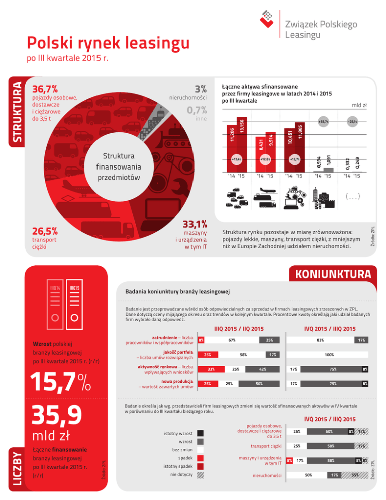 Polski rynek leasingu maszyny i urządzenia w tym IT transport ciężki -25,1% '14 '15 '14 '15 '14 '15 '14 '15 0,249 +13,7% 0,332 +12,8 % '14 '15 Struktura rynku pozostaje w miarę zrównoważona: pojazdy lekkie, maszyny, transport ciężki, z mniejszym niż w Europie Zachodniej udziałem nieruchomości. Źródło: ZPL 33,1% 26,5% +17,4 % 1,091 Struktura finansowania przedmiotów +83,7% 0,594 inne mld zł 11, 885 0,7% 10,451 nieruchomości 9,514 pojazdy osobowe, dostawcze i ciężarowe do 3,5 t Łączne aktywa sfinansowane przez firmy leasingowe w latach 2014 i 2015 po III kwartale 8,431 3% 13,156 36,7% 11,206 STRUKTURA po III kwartale 2015 r. KONIUNKTURA IIIQ’I4 IIIQ’I5 Badania koniunktury branży leasingowej Badanie jest przeprowadzane wśród osób odpowiedzialnych za sprzedaż w firmach leasingowych zrzeszonych w ZPL. Dane dotyczą oceny mijającego okresu oraz trendów w kolejnym kwartale. Procentowe kwoty określają jaki udział badanych firm wybrało daną odpowiedź. IIIQ 2015 / IIQ 2015 zatrudnienie – liczba pracowników i współpracowników Wzrost polskiej branży leasingowej po III kwartale 2015 r. (r/r) jakość portfela – liczba umów rozwiązanych 15,7% 35,9 aktywność rynkowa – liczba wpływających wniosków nowa produkcja – wartość zawartych umów Badanie określa jak wg. przedstawicieli firm leasingowych zmieni się wartość sfinansowanych aktywów w IV kwartale w porównaniu do III kwartału bieżącego roku. wzrost bez zmian spadek istotny spadek nie dotyczy pojazdy osobowe, dostawcze i ciężarowe do 3,5 t IVQ 2015 / IIIQ 2015 transport ciężki maszyny i urządzenia w tym IT nieruchomości Źródło: ZPL istotny wzrost Źródło: ZPL LICZBY mld zł Łączne finansowanie branży leasingowej po III kwartale 2015 r. (r/r) IVQ 2015 / IIIQ 2015
