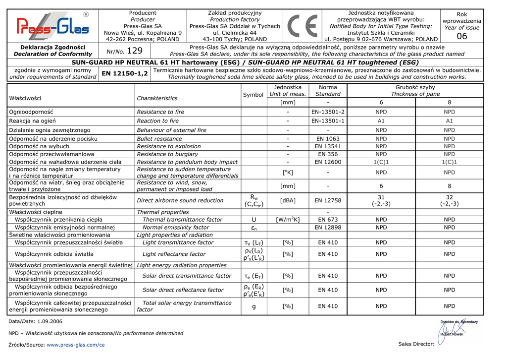 Producent Producer Press-Glas SA Nowa Wieś, ul. Kopalniana 9 42-262 Poczesna; POLAND Deklaracja Zgodności Declaration of Conformity Nr/No. 129 Jednostka notyfikowana Zakład produkcyjny Rok przeprowadzająca WBT wyrobu: Production factory wprowadzenia Notified Body for Initial Type Testing: Press-Glas SA Oddział w Tychach Year of issue Instytut Szkła i Ceramiki ul. Cielmicka 44 06 43-100 Tychy; POLAND ul. Postępu 9 02-676 Warszawa; POLAND Press-Glas SA deklaruje na wyłączną odpowiedzialność, poniŜsze parametry wyrobu o nazwie Press-Glas SA declare, under its sole responsibility, the following characteristics of the glass product named SUN-GUARD HP NEUTRAL 61 HT hartowany (ESG) / SUN-GUARD HP NEUTRAL 61 HT toughtened (ESG) zgodnie z wymogami normy EN 12150-1,2 under requirements of standard Termicznie hartowane bezpieczne szkło sodowo-wapniowo-krzemianowe, przeznaczone do zastosowań w budownictwie. Thermally toughened soda lime silicate safety glass, intended to be used in buildings and construction works. Symbol Jednostka Unit of meas. Norma Standard Grubość szyby Thickness of pane [mm] - 6 8 Właściwości Charakteristics Ognioodporność Resistance to fire - EN-13501-2 NPD NPD Reakcja na ogień Reaction to fire - EN-13501-1 A1 A1 Działanie ognia zewnętrznego Behaviour of external fire - - NPD NPD Odporność na uderzenie pocisku Odporność na wybuch Odporność przeciwwłamaniowa Odporność na wahadłowe uderzenie ciała Odporność na nagle zmiany temperatury i na róŜnice temperatur Odporność na wiatr, śnieg oraz obciąŜenie trwałe i przyłoŜone Bezpośrednia izolacyjność od dźwięków powietrznych Bullet resistance Resistance to explosion Resistance to burglary Resistance to pendulum body impact Resistance to sudden temperature change and temperature differentials Resistance to wind, snow, permanent or imposed load - EN 1063 EN 13541 EN 356 EN 12600 NPD NPD NPD 1(C)1 NPD NPD NPD 1(C)1 [oK] - NPD NPD [mm] - 6 8 [dBA] EN 12758 31 (-2,-3) 32 (-2,-3) Właściwości cieplne Współczynnik przenikania ciepła Współczynnik emisyjności normalnej Świetlne właściwości promieniowania Współczynnik przepuszczalności światła Thermal properties Thermal transmittance factor Normal emissivity factor Light properties of radiation Light transmittance factor U εn [W/m2K] EN 673 EN 12898 NPD NPD NPD NPD τV (LT) ρV(LR) ρ’V(L’R) [%] EN 410 NPD NPD [%] EN 410 NPD NPD τe (ET) [%] EN 410 NPD NPD ρe (ER) ρ’e(E’R) [%] EN 410 NPD NPD g [%] EN 410 NPD NPD Współczynnik odbicia światła Direct airborne sound reduction Light reflectance factor Właściwości promieniowania energii świetlnej Light energy radiation properties Współczynnik przepuszczalności Solar direct transmittance factor bezpośredniej promieniowania słonecznego Współczynnik odbicia bezpośredniego Solar direct reflectance factor promieniowania słonecznego Współczynnik całkowitej przepuszczalności energii promieniowania słonecznego Total solar energy transmittance factor Rw (C,Ctr) Data/Date: 1.09.2006 NPD – Właściwość uŜytkowa nie oznaczona/No performance determined Źródło/Source: www.press-glas.com/ce Sales Director: Producent Producer Press-Glas SA Nowa Wieś, ul. Kopalniana 9 42-262 Poczesna; POLAND Deklaracja Zgodności Declaration of Conformity Nr/No. Jednostka notyfikowana Zakład produkcyjny Rok przeprowadzająca WBT wyrobu: Production factory wprowadzenia Notified Body for Initial Type Testing: Press-Glas SA Oddział w Tychach Year of issue Instytut Szkła i Ceramiki ul. Cielmicka 44 06 43-100 Tychy; POLAND ul. Postępu 9 02-676 Warszawa; POLAND Press-Glas SA deklaruje na wyłączną odpowiedzialność, poniŜsze parametry wyrobu o nazwie Press-Glas SA declare, under its sole responsibility, the following characteristics of the glass product named 130 SUN-GUARD HP NEUTRAL 61 HT hartowany (ESG) i emaliowany / SUN-GUARD HP NEUTRAL 61 HT toughtened (ESG) and enamelled zgodnie z wymogami normy EN 12150-1,2 under requirements of standard Termicznie hartowane bezpieczne szkło sodowo-wapniowo-krzemianowe, przeznaczone do zastosowań w budownictwie. Thermally toughened soda lime silicate safety glass, intended to be used in buildings and construction works. Symbol Jednostka Unit of meas. Norma Standard Grubość szyby Thickness of pane [mm] - 6 8 Właściwości Charakteristics Ognioodporność Resistance to fire - EN-13501-2 NPD NPD Reakcja na ogień Reaction to fire - EN-13501-1 A1 A1 Działanie ognia zewnętrznego Behaviour of external fire - - NPD NPD Odporność na uderzenie pocisku Odporność na wybuch Odporność przeciwwłamaniowa Odporność na wahadłowe uderzenie ciała Odporność na nagle zmiany temperatury i na róŜnice temperatur Odporność na wiatr, śnieg oraz obciąŜenie trwałe i przyłoŜone Bezpośrednia izolacyjność od dźwięków powietrznych Bullet resistance Resistance to explosion Resistance to burglary Resistance to pendulum body impact Resistance to sudden temperature change and temperature differentials Resistance to wind, snow, permanent or imposed load - EN 1063 EN 13541 EN 356 EN 12600 NPD NPD NPD 1(C)2 NPD NPD NPD 1(C)2 [oK] - NPD NPD [mm] - 6 8 [dBA] EN 12758 NPD NPD Właściwości cieplne Współczynnik przenikania ciepła Współczynnik emisyjności normalnej Świetlne właściwości promieniowania Współczynnik przepuszczalności światła Thermal properties Thermal transmittance factor Normal emissivity factor Light properties of radiation Light transmittance factor U εn [W/m2K] EN 673 EN 12898 NPD NPD NPD NPD τV (LT) ρV(LR) ρ’V(L’R) [%] EN 410 NPD NPD [%] EN 410 NPD NPD τe (ET) [%] EN 410 NPD NPD ρe (ER) ρ’e(E’R) [%] EN 410 NPD NPD g [%] EN 410 NPD NPD Współczynnik odbicia światła Direct airborne sound reduction Light reflectance factor Właściwości promieniowania energii świetlnej Light energy radiation properties Współczynnik przepuszczalności Solar direct transmittance factor bezpośredniej pro