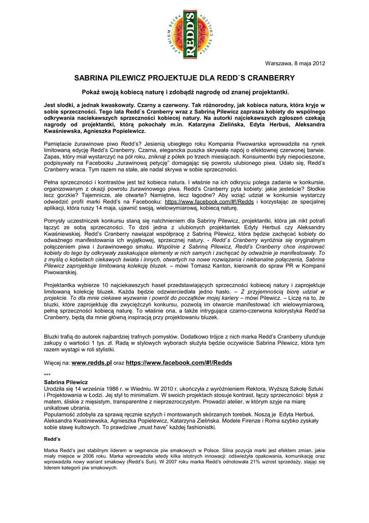 Warszawa, 8 maja 2012 SABRINA PILEWICZ PROJEKTUJE DLA REDD`S CRANBERRY Pokaż swoją kobiecą naturę i zdobądź nagrodę od znanej projektantki. Jest słodki, a jednak kwaskowaty. Czarny a czerwony. Tak różnorodny, jak kobieca natura, która kryje w sobie sprzeczności. Tego lata Redd`s Cranberry wraz z Sabriną Pilewicz zaprasza kobiety do wspólnego odkrywania naciekawszych sprzeczności kobiecej natury. Na autorki najciekawszych zgłoszeń czekają nagrody od projektantki, którą pokochały m.in. Katarzyna Zielińska, Edyta Herbuś, Aleksandra Kwaśniewska, Agnieszka Popielewicz. Pamiętacie żurawinowe piwo Redd’s? Jesienią ubiegłego roku Kompania Piwowarska wprowadziła na rynek limitowaną edycję Redd’s Cranberry. Czarna, elegancka puszka skrywała napój o efektownej czerwonej barwie. Zapas, który miał wystarczyć na pół roku, zniknął z półek po trzech miesiącach. Konsumentki były niepocieszone, podpisywały na Facebooku „żurawinową petycję” domagając się powrotu ulubionego piwa. Udało się, Redd’s Cranberry wraca. Tym razem na stałe, ale nadal skrywa w sobie sprzeczności. Pełna sprzeczności i kontrastów jest też kobieca natura. I właśnie na ich odkryciu polega zadanie w konkursie, organizowanym z okazji powrotu żurawinowego piwa. Redd’s Cranberry pyta kobiety: jakie jesteście? Słodkie lecz gorzkie? Tajemnicze, ale otwarte? Namiętne, lecz łagodne? Aby wziąć udział w konkursie wystarczy odwiedzić profil marki Redd’s na Facebooku: https://www.facebook.com/#!/Redds i korzystając ze specjalnej aplikacji, która ruszy 14 maja, ujawnić swoją, wielowymiarową, kobiecą naturę. Pomysły uczestniczek konkursu staną się natchnieniem dla Sabriny Pilewicz, projektantki, która jak nikt potrafi łączyć ze sobą sprzeczności. To dziś jedna z ulubionych projektantek Edyty Herbuś czy Aleksandry Kwaśniewskiej. Redd’s Cranberry nawiązał współpracę z Sabriną Pilewicz, która będzie zachęcać kobiety do odważnego manifestowania ich wyjątkowej, sprzecznej natury. - Redd`s Cranberry wyróżnia się oryginalnym połączeniem piwa i żurawinowego smaku. Wspólnie z Sabriną Pilewicz, Redd’s Cranberry chce inspirować kobiety do tego by odkrywały zaskakujące elementy w nich samych i zachęcać by odważnie je manifestowały. To z myślą o kobietach ciekawych świata i innych, otwartych na nowe rozwiązania i niebanalne połączenia, Sabrina Pilewicz zaprojektuje limitowaną kolekcję bluzek. – mówi Tomasz Kanton, kierownik do spraw PR w Kompanii Piwowarskiej. Projektantka wybierze 10 najciekawszych haseł przedstawiających sprzeczności kobiecej natury i zaprojektuje limitowaną kolekcję bluzek. Każda będzie odzwierciedlała jedno hasło. – Z przyjemnością biorę udział w projekcie. To dla mnie ciekawe wyzwanie i powrót do początków mojej kariery – mówi Pilewicz. – Liczę na to, że bluzki, które zaprojektuję dla zwyciężczyń konkursu, pozwolą im otwarcie manifestować ich wielowymiarową, pełną sprzeczności kobiecą naturę. To właśnie ona, a także intrygująca czarno-czerwona kolorystyka Redd’sa Cranberry, będą dla mnie główną inspiracją przy projektowaniu bluzek. Bluzki trafią do autorek najbardziej trafnych pomysłów. Dodatkowo trójce z nich marka Redd’s Cranberry ufunduje zakupy o wartości 1 tys. zł. Radą w stylowych wyborach służyła będzie oczywiście Sabrina Pilewicz, która tym razem wystąpi w roli stylistki. Więcej na: www.redds.pl oraz https://www.facebook.com/#!/Redds *** Sabrina Pilewicz Urodziła się 14 września 1986 r. w Wiedniu. W 2010 r. ukończyła z wyróżnieniem Rektora, Wyższą Szkołę Sztuki i Projektowania w Łodzi. Jej styl to minimalizm. W swoich projektach stosuje kontrast, łączy sprzeczności: błysk z matem, śliskie z mięsistym, transparentne z nieprzezroczystym. Prowadzi atelier, w którym szyje na miarę unikatowe ubrania. Popularność zdobyła za sprawą ręcznie szytych i montowanych skórzanych torebek. Noszą je Edyta Herbuś, Aleksandra Kwaśniewska, Agnieszka Popielewicz, Katarzyna Zielińska. Modele Firenze i Roma szybko zyskały sobie sławę kultowych. To prawdziwe „must have” każdej fashionistki. Redd’s Marka Redd’s jest stabilnym liderem w segmencie piw smakowych w Polsce. Silna pozycja marki jest efektem zmian, jakie miały miejsce w 2006 roku. Marka wprowadziła wtedy kilka istotnych innowacji: odświeżyła opakowania, komunikację oraz wprowadziła nowy wariant smakowy (Redd’s Sun). W 2007 roku marka Redd’s odnotowała 21% wzrost sprzedaży, stając się liderem kategorii piw smakowych. Redd’s dostępny jest w trzech wariantach smakowych trafiających w różne potrzeby i gusty odbiorców: • • • • Redd's Apple: wprowadzony do portfela Kompanii Piwowarskiej w lipcu 2000. Wywodzi się z Republiki Południowej Afryki, gdzie piwa z aromatem owocowym są produktami wysoko cenionymi ze względu na swoje głęboko orzeźwiające właściwości. Redd`s Apple to wyjątkowo orzeźwiający smak zielonych jabłek. Redd's Red: wprowadzony do portfela Kompanii Piwowarskiej w październiku 2004. To połączenie tradycyjnego piwa z sokiem malinowym. Jest to doskonała alternatywa dla osób lubiących piwo z sokiem. Redd's Red to wyjątkowe piwo o klarownym, delikatnie czerwonym zabarwieniu i malinowym zapachu, produkowane z naturalnie warzonej bazy piwnej z dodatkiem specjalnie przygotowanej zaprawy malinowej. Redd`s Red to wyjątkowa kombinacja charakterystycznej piwnej goryczki z kuszącym smakiem malin. Redd's Sun: wprowadzony do portfela Kompanii Piwowarskiej w kwietniu 2006. To piwo o smaku cytrusowym. Redd`s Sun to promienie słońca ukryte w butelce. Doskonale orzeźwia i gasi pragnienie. To piwo o smaku cytrusowym jest doskonałą oferta dla amatorów egzotycznych owoców i niebanalnych wrażeń smakowych. To kombinacja piwa (97%) i cytrusowej owocowej zaprawy (3%). Redd`s Cranberry: wprowadzony do port
