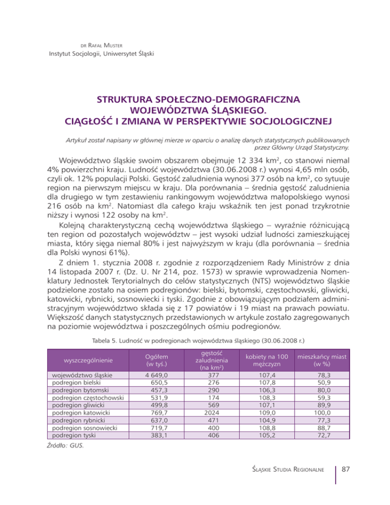DR RAFAŁ MUSTER Instytut Socjologii, Uniwersytet Śląski STRUKTURA SPOŁECZNO-DEMOGRAFICZNA WOJEWÓDZTWA ŚLĄSKIEGO. CIĄGŁOŚĆ I ZMIANA W PERSPEKTYWIE SOCJOLOGICZNEJ Artykuł został napisany w głównej mierze w oparciu o analizę danych statystycznych publikowanych przez Główny Urząd Statystyczny. Województwo śląskie swoim obszarem obejmuje 12 334 km2, co stanowi niemal 4% powierzchni kraju. Ludność województwa (30.06.2008 r.) wynosi 4,65 mln osób, czyli ok. 12% populacji Polski. Gęstość zaludnienia wynosi 377 osób na km2, co sytuuje region na pierwszym miejscu w kraju. Dla porównania – średnia gęstość zaludnienia dla drugiego w tym zestawieniu rankingowym województwa małopolskiego wynosi 216 osób na km2. Natomiast dla całego kraju wskaźnik ten jest ponad trzykrotnie niższy i wynosi 122 osoby na km2. Kolejną charakterystyczną cechą województwa śląskiego – wyraźnie różnicującą ten region od pozostałych województw – jest wysoki udział ludności zamieszkującej miasta, który sięga niemal 80% i jest najwyższym w kraju (dla porównania – średnia dla Polski wynosi 61%). Z dniem 1. stycznia 2008 r. zgodnie z rozporządzeniem Rady Ministrów z dnia 14 listopada 2007 r. (Dz. U. Nr 214, poz. 1573) w sprawie wprowadzenia Nomenklatury Jednostek Terytorialnych do celów statystycznych (NTS) województwo śląskie podzielone zostało na osiem podregionów: bielski, bytomski, częstochowski, gliwicki, katowicki, rybnicki, sosnowiecki i tyski. Zgodnie z obowiązującym podziałem administracyjnym województwo składa się z 17 powiatów i 19 miast na prawach powiatu. Większość danych statystycznych przedstawionych w artykule zostało zagregowanych na poziomie województwa i poszczególnych ośmiu podregionów. Tabela 5. Ludność w podregionach województwa śląskiego (30.06.2008 r.) wyszczególnienie Ogółem (w tyś.) województwo śląskie podregion bielski podregion bytomski podregion częstochowski podregion gliwicki podregion katowicki podregion rybnicki podregion sosnowiecki podregion tyski 4 649,0 650,5 457,3 531,9 499,8 769,7 637,0 719,7 383,1 gęstość zaludnienia (na km2) 377 276 290 174 569 2024 471 400 406 kobiety na 100 mężczyzn mieszkańcy miast (w %) 107,4 107,8 106,3 108,3 107,1 109,0 104,9 108,8 105,2 78,3 50,9 80,0 59,3 89,9 100,0 77,3 88,7 72,7 Źródło: GUS. ŚLĄSKIE STUDIA REGIONALNE 87 Analizując gęstość zaludnienia na poziom powiatów, okazuje się, że największe wartości wskaźnik ten osiąga w Świętochłowicach (4 091 osób/km2), Chorzowie (3 414 osób/km2) oraz Siemianowicach Śląskich (2 801 osób/km2) – czyli w powiatach usytuowanych w centralnej części aglomeracji śląskiej. Średnie zagęszczenie ludności dla podregionu katowickiego wynosi 2 024 osoby/km2. Natomiast najmniejsza gęstość zaludnienia jest odnotowywana w powiatach położonych w północnej części regionu: częstochowskim (88 osób/km2) i lublinieckim (93 osoby/km2), dla całego podregionu częstochowskiego liczba ludności na km2 wynosi 174 i – na co należy zwrócić uwagę – jest blisko dwunastokrotnie mniejsza w porównaniu do podregionu katowickiego. Jak zaznaczono wcześniej – województwo jest silnie zurbanizowane, wskaźnikiem czego jest fakt, że niemal 80% jego ludności stanowią mieszkańcy miast. Jednak na poziomie podregionów odnotowuje się istotne różnice w zakresie udziału mieszkańców miast w ogólnej liczbie ludności. Otóż w podregionie bielskim, odsetek mieszkańców obszarów miejskich wynosi 50,9%, podczas gdy w podregionie gliwickim osiąga wartość niemal 90%, a w katowickim wynosi 100%. Biorąc pod uwagę kryterium płci można stwierdzić, że wśród mieszkańców województwa śląskiego przeważają kobiety, które stanowią ok. 52% populacji regionu. Współczynnik feminizacji (liczba kobiet przypadająca na 100 mężczyzn) dla województwa wg stanu na koniec czerwca 2008 r. wynosił 107,4 i – jak podaje GUS – był wyższy w miastach niż na wsi (108,4 wobec 103,8). Przyglądając się współczynnikowi feminizacji na poziomie ośmiu podregionów, można stwierdzić, że najniższą wartość osiąga on w podregionie rybnickim (104,9), a najwyższą w katowickim (109). Istotniejsze różnice w zakresie feminizacji społeczeństwa widać, jeżeli analizie poddamy dane pochodzące z poziomu powiatów. Najwyższe wartości wskaźniki feminizacji odnotowywane są w największych miastach regionu: Częstochowie (112,8), BielskuBiałej (112,1) i Katowicach (111,5). Z kolei najniższy poziom feminizacji mieszkańców występuje w tych częściach województwa śląskiego, które branżowo zdominowane są przez przemysł wydobywczy: Jastrzębie Zdrój (103), powiat rybnicki (102,8) i Żory (102,3). Dane statystyczne ukazują postępujący proces demograficznego starzenia się społeczeństwa woj. śląskiego. O ile w 2000 roku 14,2% populacji województwa stanowiły osoby w wieku poprodukcyjnym, to siedem lat później ich udział wzrósł już do poziomu 16,5%. W liczbach bezwzględnych (od 2000 r. do 2007 r.) przyrost ludności w wieku poprodukcyjnym przekroczył 91 tys. osób. Pod koniec 2007 r. udział ludności w wieku przedprodukcyjnym kształtował się na poziomie 18%, natomiast 65,5% populacji województwa stanowiły osoby w wieku produkcyjnym. Spośród 65,6% populacji województwa w wieku produkcyjnym 40% stanowią osoby w tzw. wieku mobilnym (18-44 lata), a 25,6% – w wieku niemobilnym (45-59 lat dla kobiet i 45-64 lat dla mężczyzn). Aktualnie mediana wieku (wartość środkowa) dla województwa wynosi 39,1 lat. Oznacza to, że jedna połowa ludności nie osiągnęła tego wieku, a druga połowa – przekroczyła. Dla mieszkańców miast wartość ta kształtuje się na poziomie 39,6 lat, natomiast dla mieszkańców wsi mediana wieku jest o ponad dwa lata niższa. 88 R. MUSTER – STRUKTURA SPOŁECZNO-DEMOGRAFICZNA WOJEWÓDZTWA ŚLĄSKIEGO... Tabela 6. Dynamika zmiany