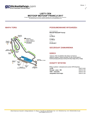 Strona 1 5 LISTY CEN MOTOGP MOTOGP FRANCJI 2017 Ta lista została utworzona na 07.03.2017 (19:08) i pokazuje ceny i towar dostępny w tym momencie. Na aktualną listę cen proszę odwiedź naszą stronę na www.gpticketshop.com MAPA TORU PODSUMOWANIE WYDARZEń WYDARZENIE: MotoGP MotoGP Francji TOR: Le Mans BLISKO: Le Mans DATA: 21.05.2017 SZCZEGółY ZAMóWIENIA DZIECI Trybuny: Nie ma biletów dla dzieci na trybuny Miejsca stojące: Dzieci poniżej 16 roku życia jeżeli z towarzyszącą płacącą osobą dorosłą mają wolny wstęp KOSZTY WYSYłKI Bilety wysłane i ubezpieczone przez UPS Express w UE: EUR 15,00 Europe poza UE: EUR 21,00 USA i Kanada: EUR 21,00 wszystkie inne kraje: EUR 31,00 Alfred Ostermann GesmbH. | Heiligenstädterstr. 31, Stiege 1, Top 702 | A-1190 Wiedeń | Tel: + 43 1 796 94 90 | Fax: +43 1 796 94 90 88 | E-mail: [email protected] z Strona 2 5 BILETY NA TRYBUNę T3 Suzuki La Chapelle Weekend EUR 165,00 wysprzedane T4 Fan Club Honda Marquez Weekend EUR 165,00 wysprzedane T5 Dunlop Weekend EUR 165,00 wysprzedane T11 Privilege Weekend EUR 200,00 wysprzedane T12 Fan Club Rossi Weekend EUR 165,00 wysprzedane T14 Yamaha Weekend EUR 165,00 wysprzedane T15 Mutuelle des Motards Weekend EUR 165,00 wysprzedane T16 Johann Zarzo Weekend EUR 142,00 wysprzedane T23 Moto Journal Raccordement Weekend EUR 165,00 wysprzedane T32 Ducati Weekend EUR 165,00 wysprzedane T40 Eurosport Garage Vert Weekend EUR 155,00 wysprzedane T52 Quest France Weekend EUR 155,00 wysprzedane Wszystkie ceny dodatkowo 5% opłaty manipulacyjnej BILETY NA MIEJSCA STOJąCE General Admission Weekend General Admission Ndz. EUR 89,00 EUR 72,00 Wszystkie ceny dodatkowo 5% opłaty manipulacyjnej MOTOGP VIP VILLAGE ™ VIP Village Ndz. EUR VIP Village Sob./Ndz. EUR 880,00 1.115,00 Wszystkie ceny dodatkowo 5% opłaty manipulacyjnej Alfred Ostermann GesmbH. | Heiligenstädterstr. 31, Stiege 1, Top 702 | A-1190 Wiedeń | Tel: + 43 1 796 94 90 | Fax: +43 1 796 94 90 88 | E-mail: [email protected] z Strona 3 5 Wszystkie ceny dodatkowo 5% opłaty manipulacyjnej MOTOGP VIP VILLAGE ™ Przyjedź i zasmakuj szybkości, hałasu i emocji MotoGP z najlpeszych miejsc widokowych na wyścigi i akcje. Naljepsze miejsce, niepobity widok, wyłączne przywileje… Sytuacja w samym sercu VIP Village daje ci możliwość być tak blisko jak to tylko możliwe, aby kibicować motocyklowemu Grand Prix. Komfortowa i luksusowa atmosfera ekskluzywnego serwisu, oferująca unikalną i uprzywilejowaną lokację. Wyborowa kuchnia, darmowy bar, najlepsza jakość… Kluczem do sukcesu jest “nieporównywalna uwaga do szczególów”. Wyrafinowany catering z doskonałą kuchnią, zawste świeżo przygotowaną pomysłem na show z gotowania, da tobie i twoim gościom maksymalną satysfakcę cały dzień. Możesz zarezerwować VIP Village Private Area (obszar prywatny) z minimalną liczbą wejść na każde GP, włacznie z wszystkimi usługami i możliwością wybrania koloru dywanu, nakrycia stołu i kwiatów za dodatkową opłatą. Mniejsze grupy będą umiejscowione przy stole z nazwą firmy w obszarze loży VIP Village Lounge Area. OPIS WLICZONYCH USłUG Parking VIP Village Wyłączne miejsca parkingowe są ulokowane w pobliżu. Samochody: Ratio Parking Pass na gości 1:4 (parking 1 : bilety VIP Village 4) Doskonałe widoki Zależnie od ulokowania VIP Village, albo z tarasu na dachu Pitu albo z prywatnej trybuny. Luksusowe Markizy Markizy i suity VIP Village są wyposażone w pasujący dywan, pościel, komfortowe meble i klimatyzację. Buffet breakfast on Saturday & Sunday Szeroki wybów rogalików, pieczywa, płatków do mleka, zimnego mięsa, różnych dań jajecznych, kawy, herbaty i soków owocowych jest serwowanych w bufecie. Gourmet lunch on Saturday & Sunday Specjalnie wybrany starter będzie serwowany przy stołach. Wybór różnych gorących dań głównych jest przygotowany w trakcie pokazowego gotowania w postaci bufetu. Następnie podany do stołu zostanie smakowity deser. Wyśmietnity bufet popołudniowy Bufet owoców, ciast, Petit Fours i sera będzie przygotowany po lunchu. Darmowy bar z kawą i napojami Bar czynny jest cały dzień i oferuje doskonały wybór rozmaitych napoi, jak drinki, napoje bezalkoholowe oraz szeroka oferta kaw i herbat. Legends Bar Legends bar, ulokowany jest w obszarze open bar. Jest to miejsce gdzie legendy MotoGP powracają, aby zabrać Cię w krainę niesamowitych, prawdziwych opowieści o motocyklach i wyścigach. Legends bar nie będzie dostępny przy wszystkich torach. Wyłączna Telewizja Toru Wyjątkowe obrazy wyścigu na ekranach TV, przez które niemożliwością jest ominąć ekscytujące momenty. Bilety do VIP Village Wszystkie ceny dodatkowo 5% opłaty manipulacyjnej Alfred Ostermann GesmbH. | Heiligenstädterstr. 31, Stiege 1, Top 702 | A-1190 Wiedeń | Tel: + 43 1 796 94 90 | Fax: +43 1 796 94 90 88 | E-mail: [email protected] z Strona 4 5 Wszystkie ceny dodatkowo 5% opłaty manipulacyjnej FORMULARZ ZAMóWIENIA FAX FAX NR: +43 1 7969490-88 Proszę wypełnij ten formularz w całości i DRUKOWANYMI LITERAMI. Imię i nazwisko: firma: adres: Kraj / Kod pocztowy / Miasto: E-Mail: Tel: Zamawiam bilety na MotoGP MotoGP Francji (2017-05-21) Przeczytałem i zaakceptowałem ogólne warunki firmy Ilość Cena za sztukę EUR Total EUR plus 5% opłaty manipulacyjne z kosztami wysyłki Suma Metoda płatności Przelew bankowy Karta kredytowa: VISA | Mastercard | Diners Club Posiadacz karty: Numer karty: Ważna do: Kod CVV: OGóLNE WARUNKI FIRMY Ważne od: 01. 01. 2010 1.Ogólne Warunki Sprzedaży Ogólne warunki firmy są ważne na sprzedaż przez przedsiębiorstwo A. Ostermann Gmbh (dalej określone jako gpticketshop.com). Wszelkie różniące się warunki klientów mogą być tylko ustalone na piśmie. Zaznaczając pole przy końcu zamówienia “Z moim zamówieniem akceptuję warunki sprzedaży firmy gpticketshop.com”, kupujący akceptuje nasze warunki sprzedaży i jest do nich zobowiązany. Kupując 