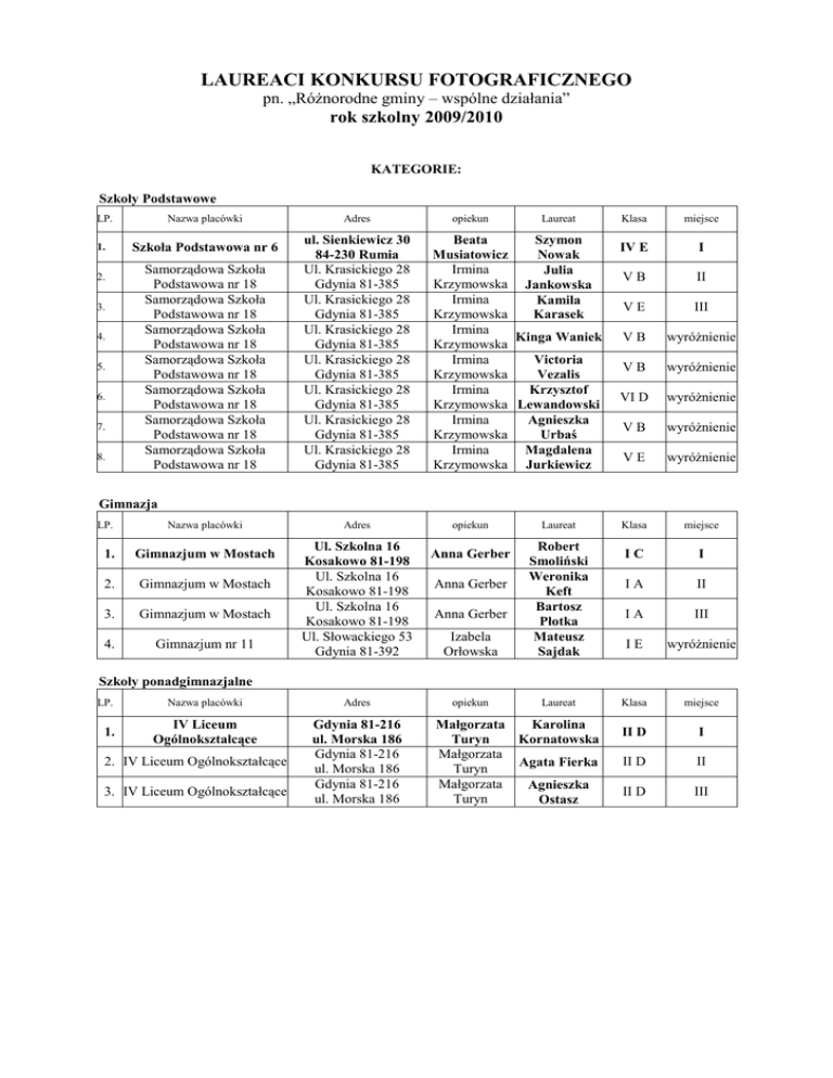 LAUREACI KONKURSU FOTOGRAFICZNEGO pn. „RóŜnorodne gminy – wspólne działania” rok szkolny 2009/2010 KATEGORIE: Szkoły Podstawowe LP. 1. 2. 3. 4. 5. 6. 7. 8. Nazwa placówki Szkoła Podstawowa nr 6 Samorządowa Szkoła Podstawowa nr 18 Samorządowa Szkoła Podstawowa nr 18 Samorządowa Szkoła Podstawowa nr 18 Samorządowa Szkoła Podstawowa nr 18 Samorządowa Szkoła Podstawowa nr 18 Samorządowa Szkoła Podstawowa nr 18 Samorządowa Szkoła Podstawowa nr 18 Adres ul. Sienkiewicz 30 84-230 Rumia Ul. Krasickiego 28 Gdynia 81-385 Ul. Krasickiego 28 Gdynia 81-385 Ul. Krasickiego 28 Gdynia 81-385 Ul. Krasickiego 28 Gdynia 81-385 Ul. Krasickiego 28 Gdynia 81-385 Ul. Krasickiego 28 Gdynia 81-385 Ul. Krasickiego 28 Gdynia 81-385 opiekun Laureat Beata Szymon Musiatowicz Nowak Irmina Julia Krzymowska Jankowska Irmina Kamila Krzymowska Karasek Irmina Kinga Waniek Krzymowska Irmina Victoria Krzymowska Vezalis Irmina Krzysztof Krzymowska Lewandowski Irmina Agnieszka Krzymowska Urbaś Irmina Magdalena Krzymowska Jurkiewicz Klasa miejsce IV E I VB II VE III VB wyróŜnienie VB wyróŜnienie VI D wyróŜnienie VB wyróŜnienie VE wyróŜnienie Klasa miejsce IC I IA II IA III IE wyróŜnienie Klasa miejsce II D I II D II II D III Gimnazja LP. Nazwa placówki 1. Gimnazjum w Mostach 2. Gimnazjum w Mostach 3. Gimnazjum w Mostach 4. Gimnazjum nr 11 Adres Ul. Szkolna 16 Kosakowo 81-198 Ul. Szkolna 16 Kosakowo 81-198 Ul. Szkolna 16 Kosakowo 81-198 Ul. Słowackiego 53 Gdynia 81-392 opiekun Laureat Izabela Orłowska Robert Smoliński Weronika Keft Bartosz Płotka Mateusz Sajdak opiekun Laureat Anna Gerber Anna Gerber Anna Gerber Szkoły ponadgimnazjalne LP. 1. Nazwa placówki Adres IV Liceum Ogólnokształcące Gdynia 81-216 ul. Morska 186 Gdynia 81-216 ul. Morska 186 Gdynia 81-216 ul. Morska 186 2. IV Liceum Ogólnokształcące 3. IV Liceum Ogólnokształcące Małgorzata Karolina Turyn Kornatowska Małgorzata Agata Fierka Turyn Małgorzata Agnieszka Turyn Ostasz