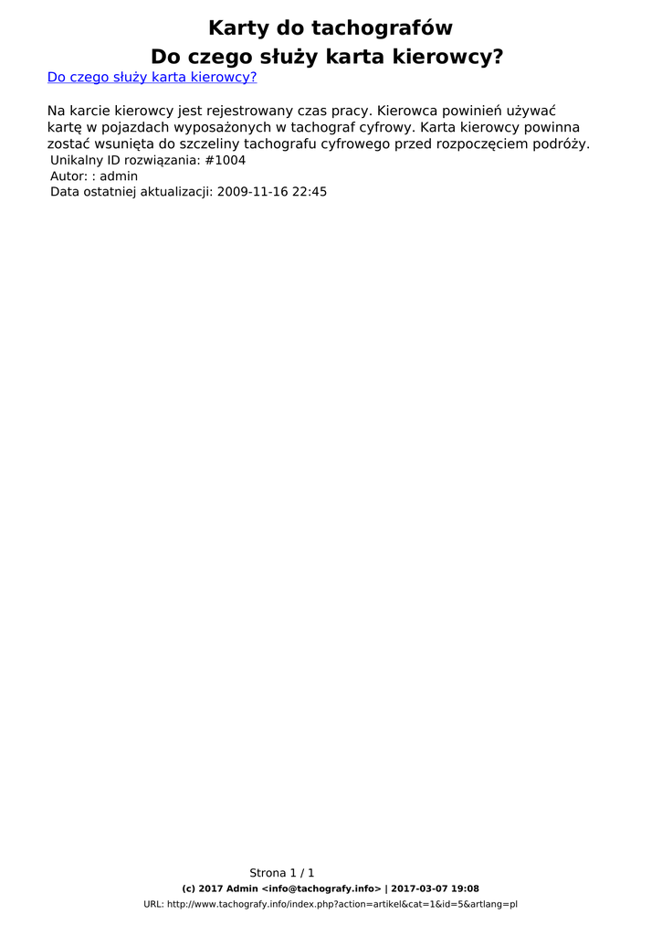 Karty do tachografów Do czego służy karta kierowcy? Do czego służy karta kierowcy? Na karcie kierowcy jest rejestrowany czas pracy. Kierowca powinień używać kartę w pojazdach wyposażonych w tachograf cyfrowy. Karta kierowcy powinna zostać wsunięta do szczeliny tachografu cyfrowego przed rozpoczęciem podróży. Unikalny ID rozwiązania: #1004 Autor: : admin Data ostatniej aktualizacji: 2009-11-16 22:45 Strona 1 / 1 (c) 2017 Admin <[email protected]> | 2017-03-07 19:08 URL: http://www.tachografy.info/index.php?action=artikel&cat=1&id=5&artlang=pl Powered by TCPDF (www.tcpdf.org)