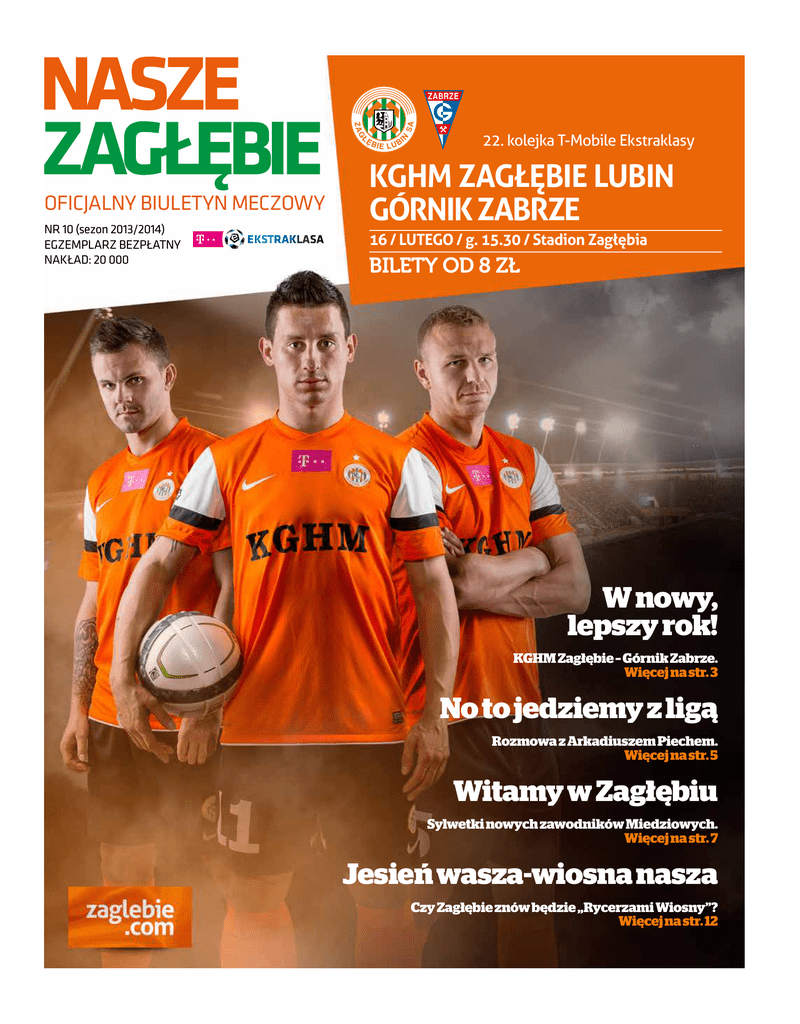22. kolejka T-Mobile Ekstraklasy OFICJALNY BIULETYN MECZOWY NR 10 (sezon 2013/2014) EGZEMPLARZ BEZPŁATNY NAKŁAD: 20 000 KGHM ZAGŁĘBIE LUBIN GÓRNIK ZABRZE 16 / LUTEGO / g. 15.30 / Stadion Zagłębia BILETY OD 8 ZŁ W nowy, lepszy rok! KGHM Zagłębie – Górnik Zabrze. Więcej na str. 3 No to jedziemy z ligą Rozmowa z Arkadiuszem Piechem. Więcej na str. 5 Witamy w Zagłębiu Sylwetki nowych zawodników Miedziowych. Więcej na str. 7 Jesień wasza-wiosna nasza Czy Zagłębie znów będzie „Rycerzami Wiosny”? Więcej na str. 12 R E K L A M A R E K L A M A NASZEZAGŁĘBIE 3 KGHM ZAGŁĘBIE LUBIN - GÓRNIK ZABRZE | 16 LUTEGO 2014 KGHM ZAGŁĘBIE LUBIN PRZEWIDYWANE USTAWIENIE TABELA EKSTRAKLASY lpdrużyna 1 m pktbr 1. Legia Warszawa 21 2. Górnik Zabrze 21 3. Wisła Kraków 21 4. Lech Poznań 21 5. Ruch Chorzów 21 6. Pogoń Szczecin 21 7. Cracovia 21 8. Jagiellonia Białystok 21 9. Zawisza Bydgoszcz 21 10. Lechia Gdańsk 21 11. Piast Gliwice 21 12. Korona Kielce 21 13. Śląsk Wrocław 21 14. KGHM Zagłębie 21 15. Podbeskidzie 21 16. Widzew Łódź 21 43 38 37 34 32 30 30 29 29 27 27 26 24 17 17 15 44-22 36-27 30-19 34-22 27-29 30-29 31-34 34-28 34-23 25-28 21-33 29-33 26-27 17-29 17-31 19-40 RYMANIAK 14 15:30 18:00 Poniedziałek, 17 lutego Piast Gliwice Wisła Kraków KWIEK 4 KOSZNIK 18 81 14 MADEJ JEž NAKOULMA 6 SOBOLEWSKI KGHM ZAGŁĘBIE LUBIN KADRA WIOSNA 2014 17.09.95 190/77 09.02.92 194/84 25.07.87 198/94 obrońcy: 5. Adam Banaś 3. Đorđe Čotra 37. Boris Godál 33. Ľubomír Guldan 22. Paweł Oleksy 21. Bartosz Rymaniak 4. Pavel Vidanov 25.12.82 13.09.84 27.05.87 30.01.83 01.04.91 13.11.89 08.01.88 185/79 184/81 188/88 183/82 182/77 189/80 185/79 10.05.86 21.04.95 15.02.88 04.11.83 16.04.91 13.02.95 08.08.97 18.03.87 13.01.83 09.07.86 21.09.85 02.01.91 07.10.90 25.04.94 170/70 183/67 177/68 185/80 165/62 180/72 180/70 181/76 176/70 187/83 180/71 176/66 180/70 184/78 38. Damian Kowalczyk 03.08.95 27. Michal Papadopulos 14.04.85 11. Arkadiusz Piech 07.06.85 9. Arkadiusz Woźniak 01.06.90 185/70 183/79 171/72 184/73 pomocnicy: 20. David Abwo 23. Piotr Azikiewicz 31. Johan Bertilsson 7. Jiří Bílek 15. Adrian Błąd 8. Sebastian Bonecki 19. Filip Jagiełło 18. Łukasz Janoszka 6. Aleksander Kwiek 58. Manuel Curto 28. Łukasz Piątek 14. Miłosz Przybecki 17. Adrian Rakowski 13. Jan Wojciechowski napastnicy: NASZEZAGŁĘBIE Adres korespondencyjny: ul. Marii Skłodowskiej Curie 98, 59-301 Lubin Reklama: Krzysztof Mularczyk - tel. 0 792 61 49 94 [email protected] Redaktor Naczelny: Zygmunt Kogut Teksty: Zygmunt Kogut, Jakub Ceglarz, Kolegium Redakcyjne Zdjęcia: Tomasz Folta Skład, grafika, makieta: ultramaryna Górnik to jedna z rewelacji tego sezonu. Zabrzanie po przedłużonej rundzie jesiennej zajmują drugą pozycję w tabeli, ustępując tylko Legii Warszawa. Drużyna z Górnego Śląska przez całą rundę jesienną zachwycała widowiskową grą, strzelając w 21 spotkaniach aż 36 goli. Więcej udało się zgromadzić tylko wspomnianej już Legii. Podopieczni Ryszarda Wieczorka swoje 22. spotkanie w sezonie rozegrają w Lubinie. Już bez Nawałki Osoba trenera to bardzo istotna kwestia, gdy mowa o drużynie z Zabrza. Ryszard Wieczorek zastąpił w tej roli Adama Nawałkę, który na przełomie października i listopada został wybrany selekcjonerem reprezentacji Polski. To właśnie były piłkarz Wisły Kraków i szkoleniowiec m. in. Zagłębia Lubin był ojcem sukcesu Górnika. To on zostawił go na wysokim miejscu w tabeli, dając przy tym wiele radości zabrzańskim kibicom. Znakiem rozpoznawczym ekipy Nawałki była walka do końca – w efekcie nie raz zdarzało się, że Górnik potrafił wygrywać mecze, w którym tracił gola jako pierwszy, a w przypadku meczów ze Śląskiem czy Wisłą – nawet mimo już dwubramkowej straty inkasowali komplet punktów, będąc panami swojego boiska. Jak na złość, jedyną porażkę u siebie w rundzie zabrzanie ponieśli w pożegnalnym meczu Nawałki przeciwko Cracovii. Po przejęciu zespołu Ryszard Wieczorek poprowadził go w pięciu meczach, notując niezbyt imponujący bilans – dwa zwycięstwa (z Podbeskidziem i Widzewem), jeden remis i dwie bolesne porażki z Piastem i Ruchem. Czy Wieczorek będzie w stanie udźwignąć ciężar odpowiedzialności, który świetnymi wynikami nałożył na niego Nawałka? Być może częściową odpowiedź poznamy już w niedzielę w Lubinie. Transferowa zawierucha Zimą w Górniku doszło do kilku interesujących transferów. Najciekawsze z nich to były te „wychodzące”. Szerokim echem odbiło się odejście kapitana zespołu – Krzysztofa Mączyńskiego. Pomocnik reprezentacji Polski podpisał kontrakt życia w chińskim Guizhou Renhe. Z kolei Paweł Olkowski już parafował umowę z niemieckim FC Koln, ale wejdzie ona w życie dopiero od lipca. Ponadto bohaterem spekulacji transferowych był Mateusz Zachara, ale najlepszy strzelec Górnika raczej zostanie w Zabrzu na wiosnę. Zupełnie inna historia to Prejuce Nakoulma. „Prezes” miał już tyle razy odchodzić, że spekulacje z tego okienka nikogo już nie dziwiły, a jego perypetie stały się najpopularniejszą transferową telenowelą w polskiej lidze. Niemcy, Francja, Rosja, Włochy, Turcja, Grecja – w tych krajach reprezentant Burkina Faso miał już „na pewno” grać, a Przegląd Sportowy naliczył aż 40 (!) klubów, które wyrażały w ostatnich latach mniejsze lub większe zainteresowanie Burkińczykiem. Jako ostatnia do gry włączyła się również Legia Warszawa. A nikogo nie powinno też zdziwić, jeśli Nakoulma wybiegnie jednak w niedziele na Stadion Zagłębia w barwach Górnika. Tyle transfery „z”, ale odbyło się również kilka tych z kategorii „do”. Górnika wzmocnili m. in. bramkarz Termaliki Nieciecza Grzegorz Kasprzik, wypożyczony z Lecha Poznań Szymon Drewniak oraz były gracz Zagłębia – Robert Jeż. Powtórzyć 2012 rok Miedziowi w ten nowy rok wchodzą z wielkimi nadziej