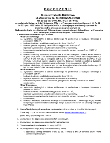OGŁOSZENIE Burmistrz Miasta Działdowo ul. Zamkowa 12, 13-200 DZIAŁDOWO tel. (0-23) 697-0400, fax. (0-23) 697-0402 na podstawie Ustawy z dnia 29 stycznia 2004 r. – Prawo zamówień publicznych (tj. Dz. U. nr 223 poz. 1655 z dnia 29 listopada 2007 r. z późniejszymi zmianami) zaprasza do złożenia ofert w przetargu nieograniczonym na: Wykonanie dzieła pn. „Budowa ul. Chlebowskiego oraz odcinków ul. Orłowskiego i ul. Pronaszko wraz z niezbędną infrastrukturą drogową ” w Działdowie 1. Przedmiotem zamówienia jest budowa: Ulica Chlebowskiego a/. wykonania nawierzchni z betonu asfaltowego na podbudowie z kruszywa łamanego o powierzchni 4040 m2 , − budowa chodnika z kostki betonowej grubości 6 cm 1528,5 m2, − budowa zjazdów do posesji z kostki betonowej grubości 8 cm 9,8 m2, − regulacja wysokościowa urządzeń zlokalizowanych w jezdni ulicy, − humusowanie pasów zieleni z obsianiem, przy grubości warstwy humusu 5 cm 1138,7 m2 − oznakowanie, b/. budowa kanalizacji deszczowej z rur PP SN8 Φ 400mm o długości L=153 m, PP Φ 200mm o długości L=26,50 m, z rur betonowych i żelbetowych „WIPRO” Φ 400 mm o dłogości118 m, z rur PCV Φ 315 mm typu S o długości 224 m, z rur PCV Φ 250mm typu N, z rur PCV Φ 200 mm typu N, budowa studni i wpustów ulicznych, dostawa i montaż separatora z bypasem, humusowanie skarp z obsianiem warstwy humusu 10 cm o powierzchni 90 m 2 . c/.- budowa oświetlenia ulicznego w tym, budowa kompletnych latarni oświetlenia ulicznego 16 kpl. budowa linii nN 0,4 kV kablowej o długości trasy 580mb Ulica Pronaszko a/. wykonania nawierzchni z betonu asfaltowego na podbudowie z kruszywa łamanego o powierzchni 534 m2 , − budowa chodnika z kostki betonowej grubości 6 cm 178 m2, − regulacja wysokościowa urządzeń zlokalizowanych w jezdni ulicy, − humusowanie pasów zieleni z obsianiem, przy grubości warstwy humusu 5 cm 360 m2 − oznakowanie, Ulica Orłowskiego a/. wykonania nawierzchni z betonu asfaltowego na podbudowie z kruszywa łamanego o powierzchni 2273 m2 , − budowa chodnika z kostki betonowej grubości 6 cm 1071 m2, − regulacja wysokościowa urządzeń zlokalizowanych w jezdni ulicy, − humusowanie pasów zieleni z obsianiem, przy grubości warstwy humusu 5 cm 745 m2 − oznakowanie, b/. budowa i dobudowa oświetlenia ulicznego w ulicach Pronaszko i Orłowskiego w tym, budowa kompletnych latarni oświetlenia ulicznego 12 kpl. budowa linii nN 0,4 kV kablowej o długości trasy 419mb. 2. Specyfikację istotnych warunków zamówienia można uzyskać w Urzędzie Miasta przy ul. Zamkowej 12 pok. Nr 20, oraz na stronie internetowej www.dzialdowo.um.gov.pl. (cena wersji papierowej siwz - 500 zł) 3. Zamawiający nie dopuszcza składania ofert częściowych. 4. Zamawiający nie dopuszcza składnia ofert wariantowych. 5. Termin realizacji zamówienia : 31 sierpnia 2010. 6. W postępowaniu mogą wziąć udział wykonawcy, którzy: 1) spełniający wymogi określone w art. 22 ust. 1 ustawy z dnia 29 stycznia 2004r. Prawo zamówień publicznych; 2) złożą wymagane dokumenty zgodnie z wymogami SIWZ 3) Warunkiem przyjęcia oferty Wykonawcy jest złożenie przez wykonawcę wadium przetargowego równowartości 60 000,00 zł 7. Kryteria oceny ofert i ich znaczenia - cena 100% 8. Miejsce i termin składania ofert - Urząd Miasta Działdowo ul. Zamkowa 12 (Punkt Obsługi interesanta) do 23 października 2009r. godz. 1000 . 9. Otwarcia ofert – nastąpi 23 października 2009r. o godz. 1030 w Urzędzie Miasta w Działdowie ul.Zamkowa 12 pokój nr 7 sala konferencyjna. 10. Termin związania ofertą: 30 dni od upływu składania ofert. Burmistrz Miasta mgr Bronisław Mazurkiewicz