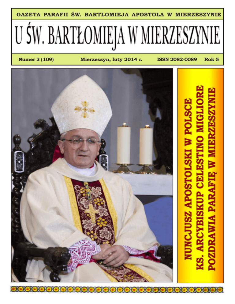 GAZETA PARAFII ŚW. BARTŁOMIEJA APOSTOŁA W MIERZESZYNIE Numer 3 (109) Mierzeszyn, luty 2014 r. ISSN 2082-0089 Rok 5 U ŒW. BART£OMIEJA W MIERZESZYNIE - nr 3 (109) luty 2014 2 U ŒW. BART£OMIEJA W MIERZESZYNIE - nr 3 (109) luty 2014 3 ORĘDZIE PAPIEŻA FRANCISZKA NA XXII ŚWIATOWY DZIEŃ CHOREGO 11 lutego 2014 roku 1. Z okazji XXII Światowego Dnia Chorego, którego temat w tym roku brzmi ,,Wiara i miłosierdzie: «My także winniśmy oddać życie za braci»”(1 J 3,16), zwracam się szczególnie do chorych i tych wszystkich, którzy zapewniają ich opiekę i leczenie. Kościół widzi w was, drodzy chorzy szczególną obecność cierpiącego Chrystusa. Tak się dzieje: obok, a w rzeczywistości w obrębie naszego cierpienia jest cierpienie Chrystusa, który wraz z nami niesie jego ciężar i objawia jego sens. Kiedy Syn Boży wstąpił na krzyż, zniszczył samotność cierpienia i oświecił jego ciemności. W ten sposób stajemy przed tajemnicą miłości Boga względem nas, która napełnia nas nadzieją i odwagą: nadzieją, ponieważ w Bożym planie miłości, także noc cierpienia otwiera się na światło paschalne; a odwagą, by stawiać czoło wszelkim przeciwnościom w Jego towarzystwie, zjednoczeni z Nim. 2. Syn Boży, który stał się człowiekiem nie usunął z ludzkiego doświadczenia choroby i cierpienia, ale przyjmując je w sobie, przekształcił je i przywrócił im właściwy wymiar. Właściwy wymiar, ponieważ, nie mają już one ostatniego słowa, którym od tej pory jest nowe życie w pełni; przekształcił, bo w jedności z Chrystusem z negatywnych mogą stać się pozytywnymi. Jezus jest drogą, i wspierani Jego Duchem możemy Go naśladować. Tak jak Ojciec dał Syna z miłości, a Syn oddał siebie z tej samej miłości, podobnie i my możemy miłować innych tak, jak Bóg nas umiłował, dając swoje życie za braci. Wiara w dobrego Boga staje się skutecznością, wiara w Chrystusa Ukrzyżowanego staje się siłą miłości aż do końca, i to nawet naszych nieprzyjaciół. Dowodem prawdziwej wiary w Chrystusa jest dar z samego siebie, pokrywający się z miłością bliźniego, zwłaszcza tych, którzy na nią nie zasługują, osób cierpiących, czy usuniętych na margines. 3. Na mocy chrztu i bierzmowania jesteśmy powołani, by upodabniać się do Chrystusa, Miłosiernego Samarytanina wszystkich cierpiących. ,,Po tym poznaliśmy miłość, że On oddał za nas życie swoje. My także winniśmy oddać życie za braci”(1 J 3,16). Kiedy z czułością podchodzimy do osób potrzebujących leczenia, to niesiemy nadzieję i uśmiech Boga w przeciwieństwa świata. Kiedy stylem naszego działania staje się wielkoduszne poświęcenie dla innych, to tworzymy przestrzeń dla Serca Chrystusa i jesteśmy nim rozpaleni, wnosząc w ten sposób nasz wkład do przyjścia Królestwa Bożego. 4. Naszemu rozwojowi w czułości, w miłosierdziu naznaczonym szacunkiem i delikatnością, pomaga wzór chrześcijański, ku któremu pewnie trzeba kierować nasze spojrzenie. Jest to Matka Jezusa i nasza Matka, bacznie wsłuchująca się w głos Boga oraz potrzeby i trudności swych dzieci. Maryja, pobudzona Bożym miłosierdziem, które w niej staje się ciałem, zapomina o sobie i pospiesznie wyrusza w drogę z Galilei do Judei, aby zobaczyć się z swoją krewną Elżbietą, wstawia się u swego Syna na weselu w Kanie, gdy widzi, że brakuje wina na godach, niesie w swoim sercu przez całą swoją pielgrzymkę życiową słowa starca Symeona, który zapowiedział, że miecz przeniknie Jej duszę i mężnie trwa u stóp Jezusowego krzyża. Ona wie, jak pokonuje się tę drogę i dlatego jest Matką wszystkich chorych i cierpiących. Ufnie możemy się do Niej uciekać z synowskim oddaniem, będąc pewnymi, że będzie nam pomagać, wspierać nas i że nas nie opuści. Ona jest Matką Chrystusa zmartwychwstałego: trwa przy naszych krzyżach i towarzyszy nam na naszej drodze ku zmartwychwstaniu i życiu w pełni. 5. Święty Jan, uczeń, który wraz z Maryją stał u stóp krzyża, prowadzi nas z powrotem do źródeł wiary i miłości, do serca Boga, który ,,jest miłością” (1 J 4,8.16), i przypomina nam, że nie możemy kochać Boga jeśli nie miłujemy braci. Kto stoi pod krzyżem z Maryją, uczy się kochać tak, jak Jezus. Krzyż jest ,,pewnością wiernej miłości Boga do nas. Miłości tak wielkiej, że wchodzi w nasz grzech i go przebacza, wchodzi w nasze cierpienie i daje nam siłę, aby je znosić, wchodzi także w śmierć, aby ją zwyciężyć i nas zbawić... Krzyż Chrystusa zachęca także, abyśmy dali się zarazić tą miłością, uczy nas zatem patrzeć na bliźniego zawsze z miłosierdziem i miłością, zwłaszcza na tych, którzy cierpią, którzy potrzebują pomocy” (Droga Krzyżowa z młodzieżą, Rio de Janeiro, 26 lipca 2013). Zawierzam ten XXII Światowy Dzień Chorego wstawiennictwu Maryi, aby pomogła ludziom chorym przeżywać swoje cierpienie w jedności z Jezusem Chrystusem i wspierała tych, którzy się nimi opiekują. Wszystkim chorym, pracownikom służby zdrowia i wolontariuszom z serca udzielam Apostolskiego Błogosławieństwa. papież FRANCISZEK Watykan, 6 grudnia 2013 roku U ŒW. BART£OMIEJA W MIERZESZYNIE - nr 3 (109) luty 2014 4 SYLWETKI NOWYCH KARDYNAŁÓW 22 lutego 2014 roku ABP PIETRO PAROLIN, arcybiskup tytularny Acquapendente, sekretarz stanu Stolicy Apostolskiej. Urodzony 17 stycznia 1955 w Schiavon koło Vicenzy w północnych Włoszech. Abp Parolin jest, mimo stosunkowo młodego wieku, jednym z najbardziej doświadczonych dyplomatów watykańskich. Po święceniach kapłańskich studiował w Rzymie prawo kanoniczne i dyplomację, a w 1986 rozpoczął służbę w dyplomacji Stolicy Apostolskiej. Pracował w przedstawicielstwach papieskich w Nigerii (1986-1989) i Meksyku (1989-1992). Po powrocie do Watykanu był odpowiedzialny w kierowanym przez kard. Angelo Sodano Sekretariacie Stanu za Hiszpanię, Andorę, za