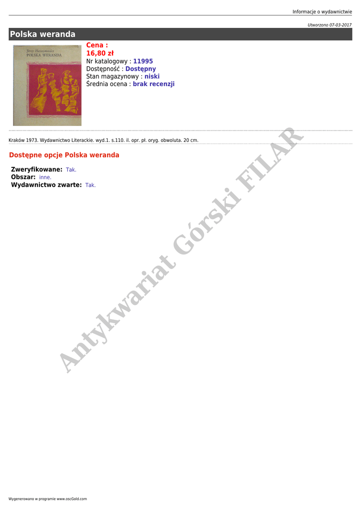 Informacje o wydawnictwie Utworzono 07-03-2017 Polska weranda Cena : 16,80 zł R Nr katalogowy : 11995 Dostępność : Dostępny Stan magazynowy : niski Średnia ocena : brak recenzji LA Kraków 1973. Wydawnictwo Literackie. wyd.1. s.110. il. opr. pł. oryg. obwoluta. 20 cm. Dostępne opcje Polska weranda An ty k w ar ia t G ór sk i FI Zweryfikowane: Tak. Obszar: inne. Wydawnictwo zwarte: Tak. Wygenerowano w programie www.oscGold.com