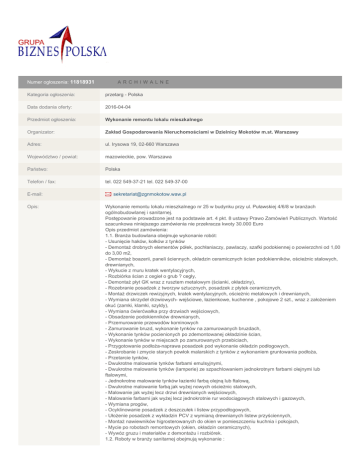 Numer ogłoszenia: 11818931 A RCHI WA L N E Kategoria ogłoszenia: przetarg - Polska Data dodania oferty: 2016-04-04 Przedmiot ogłoszenia: Wykonanie remontu lokalu mieszkalnego Organizator: Zakład Gospodarowania Nieruchomościami w Dzielnicy Mokotów m.st. Warszawy Adres: ul. Irysowa 19, 02-660 Warszawa Województwo / powiat: mazowieckie, pow. Warszawa Państwo: Polska Telefon / fax: tel. 022 549-37-21 tel. 022 549-37-00 E-mail: Opis: [email protected] Wykonanie remontu lokalu mieszkalnego nr 25 w budynku przy ul. Puławskiej 4/6/8 w branżach ogólnobudowlanej i sanitarnej. Postępowanie prowadzone jest na podstawie art. 4 pkt. 8 ustawy Prawo Zamówień Publicznych. Wartość szacunkowa niniejszego zamówienia nie przekracza kwoty 30.000 Euro Opis przedmiot zamówienia: 1.1. Branża budowlana obejmuje wykonanie robót: - Usunięcie haków, kołków z tynków - Demontaż drobnych elementów półek, pochłaniaczy, pawlaczy, szafki podokiennej o powierzchni od 1,00 do 3,00 m2, - Demontaż boazerii, paneli ściennych, okładzin ceramicznych ścian podokienników, ościeżnic stalowych, drewnianych, - Wykucie z muru kratek wentylacyjnych, - Rozbiórka ścian z cegieł o grub ? cegły, - Demontaż płyt GK wraz z rusztem metalowym (ścianki, okładziny), - Rozebranie posadzek z tworzyw sztucznych, posadzek z płytek ceramicznych, - Montaż drzwiczek rewizyjnych, kratek wentylacyjnych, ościeżnic metalowych i drewnianych, - Wymiana skrzydeł drzwiowych- wejściowe, łazienkowe, kuchenne , pokojowe 2 szt., wraz z założeniem okuć (zamki, klamki, szyldy), - Wymiana ćwierćwałka przy drzwiach wejściowych, - Obsadzenie podokienników drewnianych, - Przemurowanie przewodów kominowych - Zamurowanie bruzd, wykonanie tynków na zamurowanych bruzdach, - Wykonanie tynków pocienionych po zdemontowanej okładzinie ścian, - Wykonanie tynków w miejscach po zamurowanych przebiciach, - Przygotowanie podłoża-naprawa posadzek pod wykonanie okładzin podłogowych, - Zeskrobanie i zmycie starych powłok malarskich z tynków z wykonaniem gruntowania podłoża, - Przetarcie tynków, - Dwukrotne malowanie tynków farbami emulsyjnymi, - Dwukrotne malowanie tynków (lamperie) ze szpachlowaniem jednokrotnym farbami olejnymi lub ftalowymi, - Jednokrotne malowanie tynków łazienki farbą olejną lub ftalową, - Dwukrotne malowanie farbą jak wyżej nowych ościeżnic stalowych, - Malowanie jak wyżej lecz drzwi drewnianych wejściowych, - Malowanie farbami jak wyżej lecz jednokrotnie rur wodociągowych stalowych i gazowych, - Wymiana progów, - Ocyklinowanie posadzek z deszczułek i listew przypodłogowych, - Ułożenie posadzek z wykładzin PCV z wymianą drewnianych listew przyściennych, - Montaż nawiewników higrosterowanych do okien w pomieszczeniu kuchnia i pokojach, - Mycie po robotach remontowych (okien, okładzin ceramicznych), - Wywóz gruzu i materiałów z demontażu i rozbiórek. 1.2. Roboty w branży sanitarnej obejmują wykonanie : - Umycie brodzika i kabiny natryskowej, - Wymiana prowadnicy dolnej drzwi kabiny, - Wymiana baterii natryskowej ściennej , - Umycie umywalki i baterii umywalkowej przy użyciu środków chemicznych, - Wymiana perlatora baterii umywlkowej, - Demontaż zlewozmywaka z blachy oraz baterii zlewozmywakowej, - Montaż szafki kuchennej zlewozmywakowej, - Montaż zlewozmywaka na szafce wraz z syfonem, - Montaż baterii zmywakowej stojącej, - Umycie miski ustępowej i płuczki przy użyciu środków czyszczących, - Próba instalacji gazowej na ciśnienie dla dostawcy gazu, - Wymiana kuchni gazowej 4p z piekarnikiem, - Wywiezienie na złom zdemontowanych urządzeń, Licznik energii elektrycznej - lokal nie posiada zasilania z sieci energetycznej RWE Stoen Operator. Wykonawca zobowiązany jest dokonać formalności związanych z zakupem energii elektrycznej oraz pokryć koszty z tym związane (brak licznika w pustostanie). Miejsce i termin składania ofert: Data składania ofert: 2016-04-12 3. Termin składania ofert i ich otwarcia: Oferty należy składać w siedzibie Zamawiającego przy ul. Irysowej 19, pokój 21 (sekretariat) w Warszawie do dnia 12 kwietnia 2016 r. do godziny 10.00 Otwarcie ofert: Otwarcie ofert nastąpi w dniu 12 kwietnia 2016 r. o godzinie 10.10 w siedzibie Zamawiającego pok.34. Termin składania: 2016-04-12 Numer dokumentu: ZGN/TZ/KO/114/16 Źródło: Internet i własne Załączniki: ZIP załącznik
