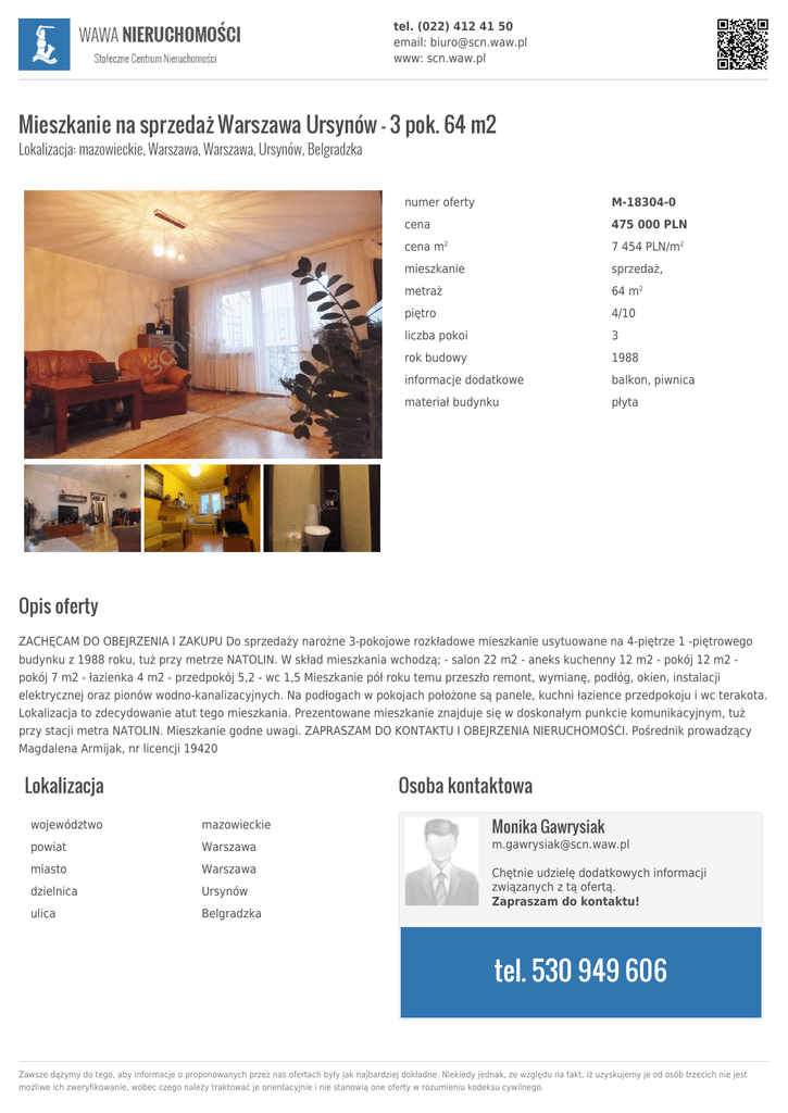 tel. (022) 412 41 50 email: [email protected] www: scn.waw.pl Mieszkanie na sprzedaż Warszawa Ursynów - 3 pok. 64 m2 Lokalizacja: mazowieckie, Warszawa, Warszawa, Ursynów, Belgradzka numer oferty M-18304-0 cena 475 000 PLN cena m 7 454 PLN/m2 mieszkanie sprzedaż, metraż 64 m2 piętro 4/10 liczba pokoi 3 rok budowy 1988 informacje dodatkowe balkon, piwnica materiał budynku płyta 2 Opis oferty ZACHĘCAM DO OBEJRZENIA I ZAKUPU Do sprzedaży narożne 3-pokojowe rozkładowe mieszkanie usytuowane na 4-piętrze 1 -piętrowego budynku z 1988 roku, tuż przy metrze NATOLIN. W skład mieszkania wchodzą; - salon 22 m2 - aneks kuchenny 12 m2 - pokój 12 m2 pokój 7 m2 - łazienka 4 m2 - przedpokój 5,2 - wc 1,5 Mieszkanie pół roku temu przeszło remont, wymianę, podłóg, okien, instalacji elektrycznej oraz pionów wodno-kanalizacyjnych. Na podłogach w pokojach położone są panele, kuchni łazience przedpokoju i wc terakota. Lokalizacja to zdecydowanie atut tego mieszkania. Prezentowane mieszkanie znajduje się w doskonałym punkcie komunikacyjnym, tuż przy stacji metra NATOLIN. Mieszkanie godne uwagi. ZAPRASZAM DO KONTAKTU I OBEJRZENIA NIERUCHOMOŚĆI. Pośrednik prowadzący Magdalena Armijak, nr licencji 19420 Lokalizacja Osoba kontaktowa Monika Gawrysiak województwo mazowieckie powiat Warszawa [email protected] miasto Warszawa dzielnica Ursynów ulica Belgradzka Chętnie udzielę dodatkowych informacji związanych z tą ofertą. Zapraszam do kontaktu! tel. 530 949 606 Zawsze dążymy do tego, aby informacje o proponowanych przez nas ofertach były jak najbardziej dokładne. Niekiedy jednak, ze względu na fakt, iż uzyskujemy je od osób trzecich nie jest możliwe ich zweryfikowanie, wobec czego należy traktować je orientacyjnie i nie stanowią one oferty w rozumieniu kodeksu cywilnego.