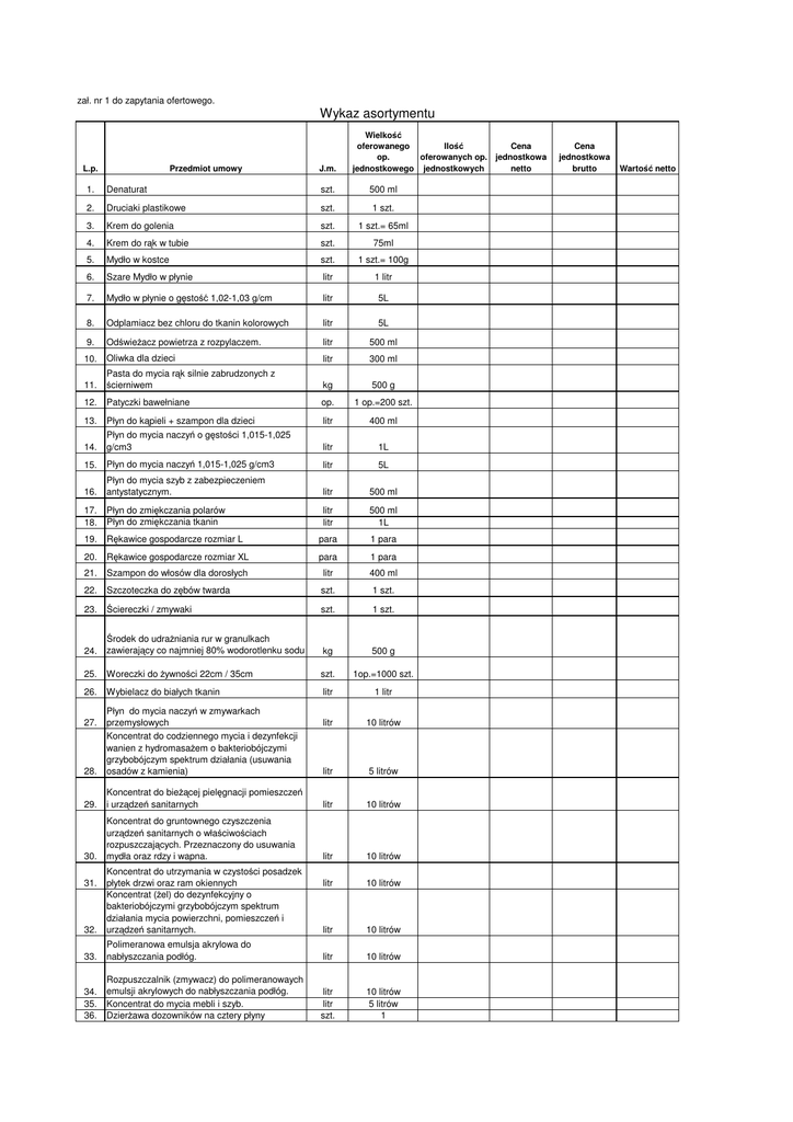 zał. nr 1 do zapytania ofertowego. Wykaz asortymentu L.p. Przedmiot umowy J.m. Wielkość Cena Ilość oferowanego op. oferowanych op. jednostkowa netto jednostkowego jednostkowych 1. Denaturat szt. 2. Druciaki plastikowe szt. 500 ml 1 szt. 3. Krem do golenia szt. 1 szt.= 65ml 4. Krem do rąk w tubie szt. 75ml 5. Mydło w kostce szt. 1 szt.= 100g 6. Szare Mydło w płynie litr 1 litr 7. Mydło w płynie o gęstość 1,02-1,03 g/cm litr 5L 8. Odplamiacz bez chloru do tkanin kolorowych litr 5L 9. Odświeżacz powietrza z rozpylaczem. litr 500 ml 10. Oliwka dla dzieci litr 300 ml 11. Pasta do mycia rąk silnie zabrudzonych z ścierniwem kg 500 g 12. Patyczki bawełniane op. 1 op.=200 szt. 13. Płyn do kąpieli + szampon dla dzieci litr 400 ml 14. Płyn do mycia naczyń o gęstości 1,015-1,025 g/cm3 litr 1L 15. Płyn do mycia naczyń 1,015-1,025 g/cm3 litr 5L 16. Płyn do mycia szyb z zabezpieczeniem antystatycznym. litr 500 ml 17. 18. Płyn do zmiękczania polarów Płyn do zmiękczania tkanin litr litr 500 ml 1L 19. Rękawice gospodarcze rozmiar L para 1 para 20. Rękawice gospodarcze rozmiar XL para 1 para 21. Szampon do włosów dla dorosłych litr 400 ml 22. Szczoteczka do zębów twarda szt. 1 szt. 23. Ściereczki / zmywaki szt. 1 szt. 24. Środek do udrażniania rur w granulkach zawierający co najmniej 80% wodorotlenku sodu kg 500 g 25. Woreczki do żywności 22cm / 35cm szt. 1op.=1000 szt. 26. Wybielacz do białych tkanin litr 1 litr litr 10 litrów 28. Płyn do mycia naczyń w zmywarkach przemysłowych Koncentrat do codziennego mycia i dezynfekcji wanien z hydromasażem o bakteriobójczymi grzybobójczym spektrum działania (usuwania osadów z kamienia) litr 5 litrów 29. Koncentrat do bieżącej pielęgnacji pomieszczeń i urządzeń sanitarnych litr 10 litrów 30. Koncentrat do gruntownego czyszczenia urządzeń sanitarnych o właściwościach rozpuszczających. Przeznaczony do usuwania mydła oraz rdzy i wapna. litr 10 litrów litr 10 litrów 27. 32. Koncentrat do utrzymania w czystości posadzek płytek drzwi oraz ram okiennych Koncentrat (żel) do dezynfekcyjny o bakteriobójczymi grzybobójczym spektrum działania mycia powierzchni, pomieszczeń i urządzeń sanitarnych. litr 10 litrów 33. Polimeranowa emulsja akrylowa do nabłyszczania podłóg. litr 10 litrów 34. 35. 36. Rozpuszczalnik (zmywacz) do polimeranowaych emulsji akrylowych do nabłyszczania podłóg. Koncentrat do mycia mebli i szyb. Dzierżawa dozowników na cztery płyny litr litr szt. 10 litrów 5 litrów 1 31. Cena jednostkowa brutto Wartość netto Razem 0,00 zł