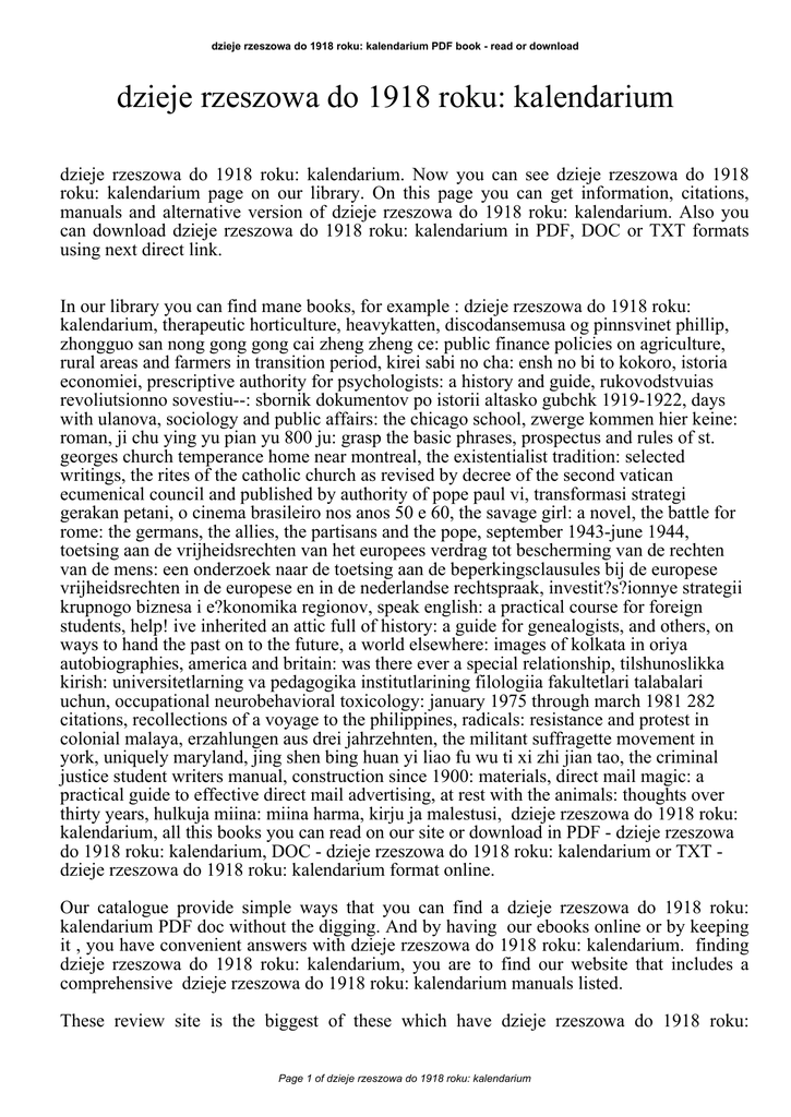 dzieje rzeszowa do 1918 roku: kalendarium PDF book - read or download dzieje rzeszowa do 1918 roku: kalendarium dzieje rzeszowa do 1918 roku: kalendarium. Now you can see dzieje rzeszowa do 1918 roku: kalendarium page on our library. On this page you can get information, citations, manuals and alternative version of dzieje rzeszowa do 1918 roku: kalendarium. Also you can download dzieje rzeszowa do 1918 roku: kalendarium in PDF, DOC or TXT formats using next direct link. In our library you can find mane books, for example : dzieje rzeszowa do 1918 roku: kalendarium, therapeutic horticulture, heavykatten, discodansemusa og pinnsvinet phillip, zhongguo san nong gong gong cai zheng zheng ce: public finance policies on agriculture, rural areas and farmers in transition period, kirei sabi no cha: ensh no bi to kokoro, istoria economiei, prescriptive authority for psychologists: a history and guide, rukovodstvuias revoliutsionno sovestiu--: sbornik dokumentov po istorii altasko gubchk 1919-1922, days with ulanova, sociology and public affairs: the chicago school, zwerge kommen hier keine: roman, ji chu ying yu pian yu 800 ju: grasp the basic phrases, prospectus and rules of st. georges church temperance home near montreal, the existentialist tradition: selected writings, the rites of the catholic church as revised by decree of the second vatican ecumenical council and published by authority of pope paul vi, transformasi strategi gerakan petani, o cinema brasileiro nos anos 50 e 60, the savage girl: a novel, the battle for rome: the germans, the allies, the partisans and the pope, september 1943-june 1944, toetsing aan de vrijheidsrechten van het europees verdrag tot bescherming van de rechten van de mens: een onderzoek naar de toetsing aan de beperkingsclausules bij de europese vrijheidsrechten in de europese en in de nederlandse rechtspraak, investit?s?ionnye strategii krupnogo biznesa i e?konomika regionov, speak english: a practical course for foreign students, help! ive inherited an attic full of history: a guide for genealogists, and others, on ways to hand the past on to the future, a world elsewhere: images of kolkata in oriya autobiographies, america and britain: was there ever a special relationship, tilshunoslikka kirish: universitetlarning va pedagogika institutlarining filologiia fakultetlari talabalari uchun, occupational neurobehavioral toxicology: january 1975 through march 1981 282 citations, recollections of a voyage to the philippines, radicals: resistance and protest in colonial malaya, erzahlungen aus drei jahrzehnten, the militant suffragette movement in york, uniquely maryland, jing shen bing huan yi liao fu wu ti xi zhi jian tao, the criminal justice student writers manual, construction since 1900: materials, direct mail magic: a practical guide to effective direct mail advertising, at rest with the animals: thoughts over thirty years, hulkuja miina: miina harma, kirju ja malestusi, dzieje rzeszowa do 1918 roku: kalendarium, all this books you can read on our site or download in PDF - dzieje rzeszowa do 1918 roku: kalendarium, DOC - dzieje rzeszowa do 1918 roku: kalendarium or TXT dzieje rzeszowa do 1918 roku: kalendarium format online. Our catalogue provide simple ways that you can find a dzieje rzeszowa do 1918 roku: kalendarium PDF doc without the digging. And by having our ebooks online or by keeping it , you have convenient answers with dzieje rzeszowa do 1918 roku: kalendarium. finding dzieje rzeszowa do 1918 roku: kalendarium, you are to find our website that includes a comprehensive dzieje rzeszowa do 1918 roku: kalendarium manuals listed. These review site is the biggest of these which have dzieje rzeszowa do 1918 roku: Page 1 of dzieje rzeszowa do 1918 roku: kalendarium dzieje rzeszowa do 1918 roku: kalendarium PDF book - read or download kalendarium, literally hundreds of thousands of different products represented. So as to there are particular sites catered to different product also categories or types, brands or niches related to dzieje rzeszowa do 1918 roku: kalendarium. So depending on just what you are searching, you will be able to choose ebooks dzieje rzeszowa do 1918 roku: kalendarium to suit your own needs, dzieje rzeszowa do 1918 roku: kalendarium. Page 2 of dzieje rzeszowa do 1918 roku: kalendarium