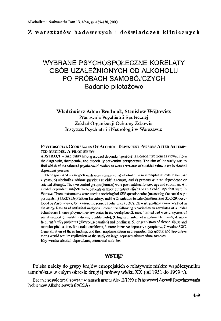 Alkoholizm i Narkomania Tom 13, Nr 4, ss. 459-470, 2000 Z warsztatów badawczych i doświadczeń klinicznych WYBRANE PSYCHOSPOŁECZNE KORELATY OSÓB UZALEŻNIONYCH OD ALKOHOLU PO PRÓBACH SAMOBÓJCZYCH Badanie pilotażowe Włodzimierz Adam Brodniak, Stanisław Wójtowicz Pracownia Psychiatrii Społecznej Zakład Organizacji Ochrony Zdrowia Instytutu Psychiatrii i Neurologii w Warszawie PSYCHOSOCIAL CORRELATES Or ALCOIłOL DEPENDENT PERSONS AFTER ATTEMP~ TED SmclDEs. A PILOT STUDY ABSTRACT - Suicidality among aleohoł dependent persons is a erucial problem as vicwcd from the diagnostic, therapcutic, and especially preventive perspeetives. The aim of the study was to find whieh ofthe sc\cctcd psychosoeial variabies were correlatcs ofsuicidal beltaviours in aleohal dependent persons, Three groups of 3D subjeets eaeh wcrc eompared: a) alcoholies who attempted suicidc in the past 4 years, b) aleoholies without prcvious suicidal auempts, and c) persons with no dcpendenec or suicidal aUempts. The two eontroi groups (b and c) werc pair matehcd for sex, agc and edueation. AU alcohol dependent subjeets were patients of three outpatient elinies or au aleohol inpatient ward in Warsaw. Thrcc instrumcnts wcrc used: a sociologieal SSS questionnairc (mcasuring the sodal support system), Beck's Dcpression Invcntory, and the Orientation to Life Qucstionnaire SOC-29, dcvelopcd by Antonovsky, to rneaSUre thc sensc of eohcrenec (SOC). Elevcn hypothcses werc vcrified in the słudy. Results of statistical ana\yses indicate thc following 7 variabies as eorrclatcs of suicidal bchaviours: 1. unemploymcnt or law status in the workplace, 2. morc Iimited and weakcr system of sodał support (quantitatively and qualitativc\y), 3. higher number of ncgative life events, 4. morc frequent family problems (divorec, separation) and lonclincss, 5. łongcr history ofa1cohol abuse and morc hospitalisations for alcohol problcms, 6. morc intensivc dcprcssive symptoms. 7. wcaker SOC. Gcneralisation of these findings and thcir implcmentation in diagnostic, thcrapeutic and prcvcntivc tenns would rcquirc Tcplieation of the sludy on largc, rcprcsentativc random sampies. Key words: aleohol dcpcndenee, attemptcd suicidcs. WSTĘP Polska należy do grupy krajów europejskich o relatywnie niskim współczynniku samobójstw w całym okresie drugiej polowy wieku XX (od 1951 do 1999 r.). Badanie zostało zrealizowane w ramach grantu Alc-12/1999 z Problemów Alkoholowych (PARPA). Państwowej Agencji Rozwiązywania 459 Włodzimierz Współczynniki samobójstw na 100 tys. Kraj Litwa Estonia Federacja Rosyjska Węgry Ukraina Białoruś Finlandia Dania Republika Czech Niemcy Polska Szwecja WIochy Wielka Brytania Rok 1996 1996 1998 1997 1996 1993 1995 1996 1996 1997 1996 1996 1993 1997 Adam Brodniak, Stanisław Wójtowicz TABELA! w Polsce i w innych krajach europejskich. ludności Mężczyźni 79,3 64,3 62,2 49,2 53,8 48,7 43,4 24,3 24,0 22,1 24,1 20,0 12,7 11,0 Kobiety 17,1 14,1 11,6 15,8 9,9 9,6 11,8 9,8 6,8 8,1 4,6 8,5 4,0 3,2 Ogółem 48,2 39,2 35,3 32,4 30,3 28,0 27,2 17,5 15,4 15,1 14,3 14,2 9,3 7,1 W dwu pierwszych dekadach do końca lat 60. współczynniki samobójstw W Polsce wynosiły od 5 do 10 przypadków na 100 tys. ludności. W latach 70. od 11 do maksymalnie 14,1 w 1977 r. (najwyższy współczynnik do 1992 r.), a w latach 80. były notowane w granicach od 9,1 w 1981 i 11,3 w 1989 (najniższe) do 13,9 w 1984 (najwyższy). W 1990 r. współczynnik samobójstw wyniósł 13,0 na 100 tys. mieszkańców i następnie wzrósł do 13,9 (1991), by w 1992 r. osiągnąć najwyższy dotychczas notowany poziom 14,9. Potem następował stopniowy spadek w latach 1993-96 do 14,2 i w latach 1997-98 osiągnął wielkość I3,1 przypadków na 100 tys. ludności. Dane na temat samobójstw w latach 1997-98, między innymi z powodu wprowadzenia nowej wersji klasyfikacji chorób - leo 10 są co najmniej (według szacunków GUS) o 10% zaniżone. Można więc ostrożnie szacować, że w latach 1997-98 współczynniki samobójstw w Polsce także osiągały wielkości między 14, a 15 przypadków na 100 tys. mieszkańców. W całym powyżej przedstawionym okresie wielkość współczynników samobójstw najbardziej była uzależniona od płci, gdyż mę,żczyźni popełniają w Polsce przecięt nie cztery do pię,ć razy czę,ściej samobójstwa niż kobiety. W latach 90. dla mę,żczyzn współczynniki te wynosiły od 20 do 25 przypadków na 100 tys., a wśród kobiet od 4 do 5 przypadków na 100 tys. Ta prawidłowość dotyczy samobójstw zakończonych śmiercią, gdyż w przypadku prób samobójczych proporcja ta jest znacznie mniejsza i czę,stość podejmowania przez kobiety prób samobójczych jest w zależności od grupy wiekowej wię,ksza, zbliżona lub niewiele mniejsza od liczby prób samobójczych podejmowanych przez mę,źczyzn (Jarosz, 1997). Uzależnienie od alkoholu powszechnie jest uznane za jeden z czynników zwię,k szających ryzyko podjęcia próby samobójczej lub skutecznego popełnienia samobójstwa. Na podstawie przeglądu światowej literatury przedmiotu (A. Roy 1995) można 460 Wybrane psychospoleczne korelaty osób uzależnionych od alkoholu po próbach samobójczych oszaCOwać ryzyko dokonania samobójstwa przez osoby uzależnione od alkoholu w okresie całego ich życia w granicach od 2,2% dla osób z historią odwykowego leczenia ambulatoryjnego, do 3,4% dla osób z historią odwykowego leczenia szpitalnego. Badania nad samobójstwami w populacjach generalnych w wielu krajach wykazują, że od 15 do 27% ich ofiar stanowią osoby Z problemami alkoholowymi (Roy, 1995). Według niepełnych danych (w dużej części przypadków brak danych) Komendy Głównej Policji, także w Polsce w latach 90. na przeciętnie notowanych rocznie od 5 do 5,5 tysiąca samobójstw od 18 do 22% jest popełniane przez osoby z problemami alkoholowymi, co nie oznacza uzależnionymi od alkoholu. Według wielu badaczy tego problemu liczba prób samobójczych