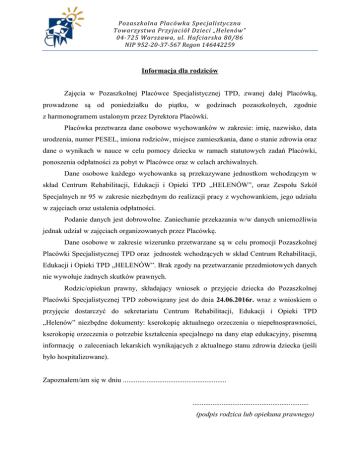 Pozaszkolna Placówka Specjalistyczna Towarzystwa Przyjaciół Dzieci „Helenów” 04-725 Warszawa, ul. Hafciarska 80/86 NIP 952-20-37-567 Regon 146442259 Informacja dla rodziców Zajęcia w Pozaszkolnej Placówce Specjalistycznej TPD, zwanej dalej Placówką, prowadzone są od poniedziałku do piątku, w godzinach pozaszkolnych, zgodnie z harmonogramem ustalonym przez Dyrektora Placówki. Placówka przetwarza dane osobowe wychowanków w zakresie: imię, nazwisko, data urodzenia, numer PESEL, imiona rodziców, miejsce zamieszkania, dane o stanie zdrowia oraz dane o wynikach w nauce w celu pomocy dziecku w ramach statutowych zadań Placówki, ponoszenia odpłatności za pobyt w Placówce oraz w celach archiwalnych. Dane osobowe każdego wychowanka są przekazywane jednostkom wchodzącym w skład Centrum Rehabilitacji, Edukacji i Opieki TPD „HELENÓW”, oraz Zespołu Szkół Specjalnych nr 95 w zakresie niezbędnym do realizacji pracy z wychowankiem, jego udziału w zajęciach oraz ustalenia odpłatności. Podanie danych jest dobrowolne. Zaniechanie przekazania w/w danych uniemożliwia jednak udział w zajęciach organizowanych przez Placówkę. Dane osobowe w zakresie wizerunku przetwarzane są w celu promocji Pozaszkolnej Placówki Specjalistycznej TPD oraz jednostek wchodzących w skład Centrum Rehabilitacji, Edukacji i Opieki TPD „HELENÓW”. Brak zgody na przetwarzanie przedmiotowych danych nie wywołuje żadnych skutków prawnych. Rodzic/opiekun prawny, składający wniosek o przyjęcie dziecka do Pozaszkolnej Placówki Specjalistycznej TPD zobowiązany jest do dnia 24.06.2016r. wraz z wnioskiem o przyjęcie dostarczyć do sekretariatu Centrum Rehabilitacji, Edukacji i Opieki TPD „Helenów” niezbędne dokumenty: kserokopię aktualnego orzeczenia o niepełnosprawności, kserokopię orzeczenia o potrzebie kształcenia specjalnego na dany etap edukacyjny, pisemną informację o zaleceniach lekarskich wynikających z aktualnego stanu zdrowia dziecka (jeśli było hospitalizowane). Zapoznałem/am się w dniu ......................................................... ................................................................ (podpis rodzica lub opiekuna prawnego)