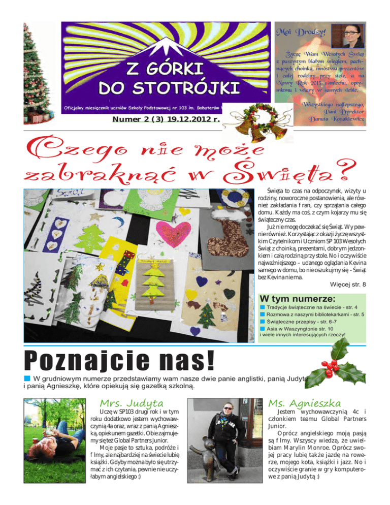 Moi Drodzy! Życzę Wam Wesołych Świąt z puszystym białym śniegiem, pachnących choinką, mnóstwa prezentów i całej rodziny przy stole, a na Nowy Rok 2013 uśmiechu, optymizmu i wiary w samych siebie. Numer 2 (3) 19.12.2012 r. Wszystkiego najlepszego, Pani Dyrektor Danuta Kozakiewicz Czego nie może zabraknąć w Święta? Święta to czas na odpoczynek, wizyty u rodziny, noworoczne postanowienia, ale również zakładania firan, czy sprzątania całego domu. Każdy ma coś, z czym kojarzy mu się świąteczny czas. Już nie mogę doczekać się Świąt. Wy pewnie również. Korzystając z okazji życzę wszystkim Czytelnikom i Uczniom SP 103 Wesołych Świąt z choinką, prezentami, dobrym jedzonkiem i całą rodziną przy stole. No i oczywiście najważniejszego – udanego oglądania Kevina samego w domu, bo nie oszukujmy się - Świąt bez Kevina nie ma. Więcej str. 8 W tym numerze: ■■ Tradycje świąteczne na świecie - str. 4 ■■ Rozmowa z naszymi bibliotekarkami - str. 5 ■■ Świąteczne przepisy - str. 6-7 ■■ Asia w Waszyngtonie str. 10 i wiele innych interesujących rzeczy! Poznajcie nas! ■■ W grudniowym numerze przedstawiamy wam nasze dwie panie anglistki, panią Judytę i panią Agnieszkę, które opiekują się gazetką szkolną. Mrs. Judyta Uczę w SP103 drugi rok i w tym roku dodatkowo jestem wychowawczynią 4a oraz, wraz z panią Agnieszką, opiekunem gazetki. Obie zajmujemy się też Global Partners Junior. Moje pasje to sztuka, podróże i filmy, ale najbardziej na świecie lubię książki. Gdyby można było się utrzymać z ich czytania, pewnie nie uczyłabym angielskiego :) Ms. Agnieszka Jestem wychowawczynią 4c i członkiem teamu Global Partners Junior. Oprócz angielskiego moją pasją są filmy. Wszyscy wiedzą, że uwielbiam Marylin Monroe. Oprócz swojej pracy lubię także jazdę na rowerze, mojego kota, książki i jazz. No i oczywiście granie w gry komputerowe z panią Judytą :) 2 Z górki do Stotrójki nr 2 (3) 19.12.2012r. Historie i opowieści Witajcie! W numerze jesiennym napisaliśmy wam o tym, co robiliśmy w części pierwszej naszego tegorocznego projektu. Teatralna mapa Warszawy oraz filmik na youtubie zostały bardzo dobrze ocenione przez dzieci z innych szkół z naszej grupy. Z nową energią wzięliśmy się do pracy nad częścią drugą! ■■Rozdział drugi poświęcony jest scenariuszom i opowieściom - mamy nauczyć się tego, jak przekształcać opowieści z naszych społeczności na język teatru i jak pisać scenariusze. Judyta Stępień Opowieści będziemy musieli ‘zdobyć’ sami mamy w planach mini-wycieczkę po Sadybie, podczas której będziemy prosić napotkane osoby, aby opowiedziały nam trochę o historii okolicy i zwyczajach mieszkańców. Nie możemy się też doczekać opowieści, które zbiorą nasi koledzy i koleżanki z partnerskich miast i scenariuszy, które powstaną na ich podstawie. The Monkey and the Crocodile Jedno z zadań, które mieliśmy do wykonania w tym rozdziale, było oparte na historyjce ‘The Monkey and the Crocodile’, Jest to opowieść pochodząca ze starożytnego hinduskiego zbioru historii o zwierzętach, zatytułowanego ‘The Panchatantra’. Bohaterem opowieści jest szczęśliwa małpka, która żyła nad rzeką w środku lasu i miała dom na szczycie jabłoni. Jeśli chcecie poznać całą historię, możecie ją przeczytać tutaj: http://db.tt/Xk4qvfMw. My, na podstawie historyjki, mieliśmy stworzyć mini-komiks, w którym rysowaliśmy, co wydarzyło się w historyjce i dopisywaliśmy, co powiedzieli bohaterowie. Było to pierwsze zadanie, które wymagało rysowania i sprawiło nam wiele frajdy. Jedną z prac możecie zobaczyć na zdjęciu. i polegało na tym, że mieliśmy być odbiciem lustrzanym swojego kolegi/ koleżanki i naśladować ich ruchy. Energia i entuzjazm pani Patrycji sprawiły, że była to niesamowita lekcja i na pewno dużo się nauczyliśmy. Acting lessons Jako że ten rok poświęcony jest teatrowi, nie mogło zabraknąć warsztatów aktorskich! Odwiedziła nas pani Patrycja Trzoch, która na sali gimnastycznej zrobiła z nami kilka ćwiczeń. Najpierw biegaliśmy w kółko w taki sposób, żebyśmy nauczyli się kontrolować naszą przestrzeń. Potem biegaliśmy, wyobrażając sobie, że jesteśmy na statku. Nagle pani Patrycja krzyknęła: ‘Toniemy!’ i znowu musieliśmy znaleźć miejsce dla siebie i stanąć w taki sposób, żeby statek nie zatonął. Była też zabawa w ‘Bombę i schron’ - kiedy pani Patrycja klaskała, musieliśmy przestać biegać i znaleźć sobie schronienie. Kolejne ćwiczenia dotyczyły emocji. Jedno z nich nazywało się ‘lustro’ Skype conference Najbardziej niezapomnianym wydarzeniem ostatniego miesiąca była jednak na pewno konferencja na skypie z naszymi kolegami i koleżankami z Nowego Jorku! W środę, 12 grudnia, mieliśmy możliwość porozmawiania z uczniami szkoły 160 William T. Sampson z Brooklynu. Przed spotkaniem przygotowaliśmy pytania, które chcieliśmy zadać naszym rówieśnikom i przed godziną 15 zasiedliśmy przed komputerem. Najpierw Ola i Tosia opowiedziały o naszej szkole, a następnie zadawaliśmy pytania i odpowiadaliśmy na pytania dzieci z Nowego Jorku. Na początku trochę się stresowaliśmy, ale potem wszystko poszło świetnie. Dodatkową niespodzianką było to, że gościem specjalnym zaproszonym przez koordynatorów programu w Nowym Jorku była Konsul Generalna Polski! Po rozmowie podziękowała nam i powiedziała, że jest dumna z warszawskich dzieci :) Redaktor naczelny: Michał Maksymiuk Dziennikarze: Weronika Krystecka, Ela Kuchta, Zuzia Woźniak, Julia Pyc, Asia Saczuk Fotoreporterzy: Klaudia Pytlińska, Asia Pastuszek, Bartek Korzeniewski Korekta: Bartek Grzebalski Komiks The Monkey and the Crocodile Warsztaty aktorskie z panią Patrycją Rozmawiamy na skypie z uczniami z NY Graficy: Michał Czech, Mateusz Iwaniuk Opieka nad redakcją: pani Judyta Stępie