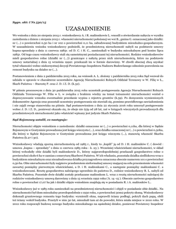 Sygn. akt: I Ns 530/15 UZASADNIENIE We wniosku z dnia 20 sierpnia 2015 r. wnioskodawcy A. i R. małżonkowie L. wnosili o stwierdzenie nabycia w wyniku zasiedzenia z dniem 1 sierpnia 2015 r. własności nieruchomości położonej we wsi B., gmina G. oznaczonej jako działki: nr (...) o powierzchni 0,50 ha i nr 102 o powierzchni 0,11 ha, zabudowanej budynkiem mieszkalno-gospodarczym. W uzasadnieniu wniosku wnioskodawcy podnieśli, że przedmiotową nieruchomość nabyli na podstawie umowy kupna-sprzedaży z dnia 11 czerwca 1985r. od D. C. i H. C., zamieszkali w budynku mieszkalnym pod koniec lipca 1985r. Od tego czasu wnioskodawcy stali się samoistnymi posiadaczami tej nieruchomości. Rodzice wnioskodawców mieli gospodarstwo rolne (działki nr (...)) graniczące z nabytą przez nich nieruchomością, które na podstawie umowy notarialnej z dnia 15 września 1992r. przekazali im w formie darowizny. W chwili obecnej chcą uzyskać tytuł własności wobec niekorzystnej decyzji Powiatowego Inspektora Nadzoru Budowlanego odnośnie pozwolenia na remont budynku na działce nr (...). Postanowieniem z dnia 2 października 2015 roku, na wniosek A. L. złożony 1 października 2015 roku Sąd wezwał do udziału w sprawie w charakterze uczestników Agencję Nieruchomości Rolnych Oddział Terenowy w W. Filię w Ł., Skarb Państwa – Starostę P. oraz J. D. i Z. D. (k.32). W piśmie procesowym z dnia 30 października 2015 roku uczestnik postępowania Agencja Nieruchomości Rolnych Oddziału Terenowego W. Filia w Ł. w związku z brakiem wiedzy na temat tożsamości nieruchomości wniósł o doprecyzowanie wniosku ewentualnie przesłanie wypisu z rejestru gruntów (k.59). Po doręczeniu wymienionych dokumentów Agencja oraz pozostali uczestnicy postępowania nie stawiali się, pomimo prawidłowego zawiadomienia i nie zajęli swego stanowiska na piśmie. Sąd postanowieniem z dnia 22 stycznia 2016 roku umorzył postępowanie wobec J. D. i Z. D., ponieważ okazało się, że oboje nie żyją od 28 lat, zaś w księgach wieczystych prowadzonych dla przedmiotowych nieruchomości jako właściciel wpisany jest jedynie Skarb Państwa. Sąd Rejonowy ustalił, co następuje: Nieruchomości objęte wnioskiem o zasiedzenie: działki oznaczone nr (...) o powierzchni 0,11ha, dla której w Sądzie Rejonowym w Gostyninie prowadzona jest księga wieczysta (...), oraz działka oznaczonej nr (...) o powierzchni 0,50ha, dla której w Sądzie Rejonowym w Gostyninie prowadzona jest księga wieczysta (...), stanowią własność Skarbu Państwa (k.27 i 30). Wnioskodawcy władają sporną nieruchomością od 1985 r., kiedy to „kupili” ją od D. i H. małżonków C. ( dowód : umowa „kupna – sprzedaży” z dnia 11 czerwca 1985 roku - k. 23 ). Wcześniej właścicielami nieruchomości, w skład której wchodziły obie działki byli małżonkowie D., którzy najprawdopodobniej przekazali gospodarstwo rolne o powierzchni około 6 ha w zamian z emeryturę Skarbowi Państwa. W ich władaniu, pozostała działka siedliskowa wraz z budynkiem mieszkalnym oraz niezabudowana działka przyzagrodowa oznaczona obecnie numerem 101 o powierzchni 0,50 ha. Obie nieruchomości były najpierw przedmiotem nieformalnej umowy mającej na celu przeniesienie własności zawartej pomiędzy pierwotnym właścicielami, a D. i H. małżonkami C., a następnie pomiędzy małżonkami C. a wnioskodawcami. Resztę gospodarstwa należącego uprzednio do państwa D., rodzice wnioskodawcy R. L. nabyli od Skarbu Państwa. Pozostałe dwie działki zostały przekazane małżonkom L. wraz z resztą nieruchomości należącej do rodziców wnioskodawcy umową darowizny z dnia 15 września 1992 roku ( k. 14 -15 ). Obecnie zarówno gospodarstwo rolne o powierzchni 17,07 ha jak i działki objęte wnioskiem znajdują się w posiadaniu R. i A. małżonków L.. Wnioskodawcy już w 1985 roku zamieszkali na przedmiotowej nieruchomości i objęli w posiadanie obie działki.. Na nieruchomości był dom mieszkalny prawdopodobnie z 1930 roku, o powierzchni 30m2 pokryty słomą. Wnioskodawcy dokonali gruntownego remontu tego budynku: wymienili okna, naprawili ściany podłogi, pokryli dach papą, obili też ściany wokół budynku. Przeżyli w nim 30 lat, mieszkali tam aż do powodzi, która miała miejsce w 2010 roku. W 2012 roku rozpoczęli budowę nowego budynku mieszkalnego na sąsiedniej działce, ponieważ Powiatowy Inspektor Nadzoru Budowlanego orzekł, że stary budynek nie daje się do użytku ( k. 17 – 18 decyzja (...) , k. 19 – 22 decyzja o pozwoleniu na budowę). Również od 1985 roku wnioskodawcy objęli w posiadanie grunt wokół siedliska, obejmujący zarówno działkę (...) jak i 102, na którym był ogród, w którym rosły tam drzewa owocowe, uprawiali tam również ziemniaki, truskawki i warzywa. W budynku, który został wyłączony z użytkowania po powodzi obecnie jest magazyn na zboże i siano. Po raz drugi budynek został wyremontowany i od 2013 roku wykorzystywany jest w celach gospodarczych. Wnioskodawcy opłacali podatek za budynek i grunty przedmiotowych działek i czuli się właścicielem tej nieruchomości. Przez okolicznych sąsiadów również postrzegani są jako właściciele nieruchomości ponieważ przez tyle lat o nią dbali, a nikt nigdy nie zgłaszał wobec nich roszczeń odnośnie przedmiotowych nieruchomości. Powyższy stan faktyczny Sąd ustalił na podstawi wskazanych dokumentów oraz dowodu z zeznań świadków: W. K. i A. D. ( k. 89) oraz relacji wnioskodawczyni A. L. ( k. 89 – 90 ). Dowody te Sąd uznał za w pełni wiarygodne, zwłaszcza, że uczestnicy postępowania nie oponowali wnioskowi o zasiedzenie i nie przedstawili żadnych wniosków dowodowych zmierzających do zaprzeczenia ustalonym faktom i twierdzeniom wnioskodawców. Sąd zważył, co następuje: Zasiedzenie jest sposobem nabycia własności lub ograniczonego prawa rzeczowego przez nieuprawnionego posiadacza w wyniku długotrwałego, nieprzerwan