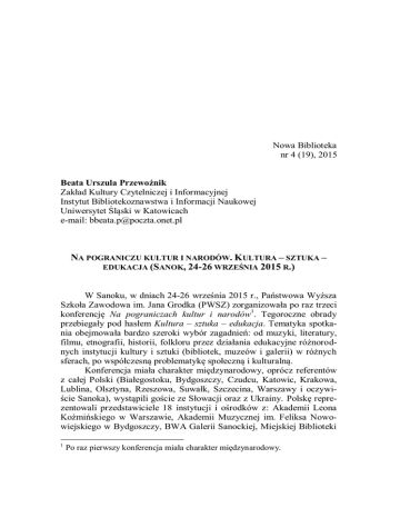 Nowa Biblioteka nr 4 (19), 2015 Beata Urszula Przewoźnik Zakład Kultury Czytelniczej i Informacyjnej Instytut Bibliotekoznawstwa i Informacji Naukowej Uniwersytet Śląski w Katowicach e-mail: [email protected] NA POGRANICZU KULTUR I NARODÓW. KULTURA – SZTUKA – EDUKACJA (SANOK, 24-26 WRZEŚNIA 2015 R.) W Sanoku, w dniach 24-26 września 2015 r., Państwowa Wyższa Szkoła Zawodowa im. Jana Grodka (PWSZ) zorganizowała po raz trzeci konferencję Na pograniczach kultur i narodów1. Tegoroczne obrady przebiegały pod hasłem Kultura – sztuka – edukacja. Tematyka spotkania obejmowała bardzo szeroki wybór zagadnień: od muzyki, literatury, filmu, etnografii, historii, folkloru przez działania edukacyjne różnorodnych instytucji kultury i sztuki (bibliotek, muzeów i galerii) w różnych sferach, po współczesną problematykę społeczną i kulturalną. Konferencja miała charakter międzynarodowy, oprócz referentów z całej Polski (Białegostoku, Bydgoszczy, Czudcu, Katowic, Krakowa, Lublina, Olsztyna, Rzeszowa, Suwałk, Szczecina, Warszawy i oczywiście Sanoka), wystąpili goście ze Słowacji oraz z Ukrainy. Polskę reprezentowali przedstawiciele 18 instytucji i ośrodków z: Akademii Leona Koźmińskiego w Warszawie, Akademii Muzycznej im. Feliksa Nowowiejskiego w Bydgoszczy, BWA Galerii Sanockiej, Miejskiej Biblioteki 1 Po raz pierwszy konferencja miała charakter międzynarodowy. 125 Na pograniczu kultur i narodów… Publicznej im. Grzegorza z Sanoka w Sanoku, Muzeum Budownictwa Ludowego w Sanoku, Państwowej Wyższej Szkoły Zawodowej im. Edwarda F. Szczepanika w Suwałkach, Państwowej Wyższej Szkoły Zawodowej im. Jana Grodka w Sanoku, Pedagogium Wyższej Szkoły Nauk Społecznych w Warszawie, Uniwersytetu Jagiellońskiego w Krakowie, Uniwersytetu Marii Curie-Skłodowskiej w Lublinie, Uniwersytetu Pedagogicznego im. Komisji Edukacji Narodowej w Krakowie, Uniwersytetu Rzeszowskiego, Uniwersytetu Szczecińskiego, Uniwersytetu Śląskiego w Katowicach, Uniwersytetu w Białymstoku, Uniwersytetu Warmińsko-Mazurskiego w Olsztynie, Uniwersytetu Warszawskiego, Zespołu Szkół w Czudcu. Goście zagraniczni przyjechali z 12 ośrodków: Akademii Ostrogskiej, Charkowskiego Uniwersytetu Narodowego im. Wasyla Karazina, Dyplomatycznej Akademii Ukrainy w Kijowie, Lwowskiego Narodowego Uniwersytetu Agrarnego, Lwowskiego Uniwersytetu Narodowego im. Iwana Franki, NGO Ukraińskiego Stowarzyszenia Badań Wspólnoty Europejskiej, Państwowego Uniwersytetu Pedagogiczny im. I. Franki w Drohobyczu, Rówieńskiego Państwowego Uniwersytetu Humanistycznego, Uniwersytetu Katolickiego w Rużomberku, Uniwersytetu Mateji Beli w Bańskiej Bystrzycy, Uniwersytetu Narodowego im. Lesi Ukrainki w Łucku, Uniwersytetu w Preszowie. Konferencję otworzył rektor PWSZ w Sanoku, przypominając o inicjatywie, jaka już od trzech lat łączy ludzi z różnych dyscyplin, a interdyscyplinarność staje się podstawą do różnorodnych dyskusji i wniosków. Obrady plenarne rozpoczął Jerzy Nikitorowicz z Uniwersytetu w Białymstoku referatem Nacjonalizm – patriotyzm – obywatelstwo. Wyzwania edukacji międzykulturowej, w którym zanalizował paradygmat współistnienia różnorodnych kultur w kontekście narodów, gdyż właśnie na pograniczu sprawdza się powiedzenie „żaden człowiek nie jest dla drugiego człowieka całkiem obcy”. Kolejna referentka Irena Medňanská z Uniwersytetu w Preszowie, kierownik Instytutu Muzyki i Plastyki, w referacie System ustawicznego kształcenia nauczycieli na Słowacji dokonała analizy systemu kształcenia, stopni, oceny i możliwości specjalizacji na Słowacji. Switłana Szczudłoz Uniwersytetu Pedagogicznego im. I. Franki w Drohobyczu, w referacie o Możliwościach i zagrożeniach młodzieży z zachodniego pogranicza Ukrainy w ramach reformy edukacyjnej, przedstawiła reformę edukacji oraz scharakteryzowała projekt badawczy, jaki realizowała w wybranych ośrodkach (Zielona Góra, Rzeszów, Przemyśl, Drohobycz, Nyiregyhaza (Rumunia)). W ostatnim referacie tej sesji, dotyczącym Edukacji pracowników socjalnych w Polsce i Republice Słowackiej, Beata Szluz, reprezentująca PWSZ w Sanoku, omówiła system szkolenia, podstawy 126 Beata Urszula Przewoźnik prawne, etykę pracowników socjalnych, regulacje zawodu w Polsce i w Słowacji po 1990 r., odwołując się równocześnie do systemów kształcenia na Ukrainie i w Kanadzie. Pierwsza sesja tematyczna została poświęcona w całości problematyce muzycznej, zdominowały ją wystąpienia prelegentów ze Słowacji. Zaprezentowano 6 referatów: Karola Medňanský'ego z Uniwersytetu w Preszowie o Słowackim kompozytorze Juliuszu Kowalskim i jego pedagogiczno-instrumentalnej twórczości; Renáty Kočišovej z Uniwersytetu w Preszowie o Kompendiach muzycznych Mikuláša Moyzesa w kontekście życia kulturalnego; Tatiany Švajkovej z Uniwersytetu w Preszowie, która omówiła Akademické zborové hnutie východoslovenského regiónu v kontexte celoslovenskej akademickej zborovej kultury; Iwony Bodziak z PWSZ w Sanoku, mówiącej o Powszechnej edukacji muzycznej w perspektywie przeszłości i przyszłości; Marii Karalus z Uniwersytetu Pedagogicznego im. I. Franki w Drohobyczu, poruszającej zagadnienie Wydarzeń muzycznych Festiwali Brunona Schulza w Drohobyczu: praktyka dialogu międzykulturowego; oraz ostatni, Izabeli Piekarczyk z Uniwersytetu Katolickiego w Rużomberku pt. Amatorska opera czynnikiem kulturotwórczym miasta Dębica. Druga sesja tematyczna dotyczyła problematyki pogranicza polsko-ukraińskiego i silnej roli Brunona Schulza w tym zakresie. Jako pierwsza wystąpiła Wiera Meniok z Uniwersytetu Pedagogicznego im. I. Franki w Drohobyczu prezentując referat Budowanie ukraińskiej recepcji Brunona Schulza jako narzędzie edukacji kulturowej, w którym podkreśliła rolę poety bez ojczyzny. Aleksandra Smusz z Uniwersytetu Rzeszowskiego, kontynuując tematykę obrad, w referacie Tematy tabu w opowiad