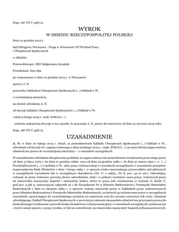 Sygn. akt VII U 458/15 WYROK W IMIENIU RZECZYPOSPOLITEJ POLSKIEJ Dnia 10 grudnia 2015 r. Sąd Okręgowy Warszawa - Praga w Warszawie VII Wydział Pracy i Ubezpieczeń Społecznych w składzie: Przewodniczący: SSO Małgorzata Jarząbek Protokolant: Ewa Sęk po rozpoznaniu w dniu 10 grudnia 2015 r. w Warszawie sprawy A. N. przeciwko Zakładowi Ubezpieczeń Społecznych (...) Oddział w W. o wcześniejszą emeryturę na skutek odwołania A. N. od decyzji Zakładu Ubezpieczeń Społecznych (...) Oddział w W. z dnia 9 lutego 2015 r. znak: ENS/6/(...) - zmienia zaskarżoną decyzję w ten sposób, że przyznaje A. N. prawo do emerytury od dnia 31 stycznia 2015 roku. Sygn. akt VII U 458/15 UZASADNIENIE A. N. w dniu 20 lutego 2015 r. złożył, za pośrednictwem Zakładu Ubezpieczeń Społecznych (...) Oddział w W., odwołanie od decyzji ww. organu rentowego z dnia 09 lutego 2015 r., znak: ENS/6/(...), na mocy której organ rentowy odmówił mu prawa do wcześniejszej emerytury – z warunków szczególnych. W uzasadnieniu odwołania ubezpieczony podniósł, że organ rentowy nie uznał okresów świadczenia przez niego pracy od dnia 13 lipca 1979 r. do dnia 21 grudnia 1982r. oraz od dnia 25 grudnia 1982 r. do dnia 31 marca 1992 r. w (...) Przedsiębiorstwie (...) z siedzibą w W., jako pracy wykonywanej w warunkach szczególnych w rozumieniu przepisów rozporządzenia Rady Ministrów z dnia 7 lutego 1983 r. w sprawie wieku emerytalnego pracowników zatrudnionych w szczególnych warunkach lub w szczególnym charakterze (Dz. U. z 1983r., Nr 8, poz. 43 ze zm.). Odwołujący wskazał, że przez wskazane powyżej okresy zatrudnienia, stale i w pełnym wymiarze czasu pracy, wykonywał pracę na stanowisku maszynisty koparki i maszynisty kafara, która to praca jest wymieniona w wykazie A, dziale V, pod poz. 3 pkt 3, stanowiącym załącznik nr 1 do Zarządzenia Nr 9 Ministra Budownictwa i Przemysłu Materiałów Budowlanych z dnia 01 sierpnia 1983 r. w sprawie wykazu stanowisk pracy w Zakładach pracy nadzorowanych przez Ministra Budownictwa i Przemysłu Materiałów Budowlanych, na których są wykonywane prace w szczególnych warunkach, uprawniające do wcześniejszego przejścia na emeryturę oraz do wzrostu emerytury lub renty. Zdaniem odwołującego, Zakład Ubezpieczeń Społecznych w powyższym zakresie niezasadnie odmówił mu przyznania prawa do dochodzonego świadczenia z powodu braku świadectwa wykonywania pracy w warunkach szczególnych, ponieważ już z treści samej umowy o pracę wynika, że był on zatrudniony na stanowisku maszynisty koparek jednonaczyniowych. Jednocześnie na potwierdzenie ww. okoliczności odwołujący zawnioskował o przeprowadzenie dowodu z zeznań świadków, tj. kolegów z którymi razem pracował ww. zakładzie pracy w spornych okresach czasu. W konkluzji odwołania, ubezpieczony zwrócił się o przyznanie na jego rzecz prawa do wcześniejszej emerytury wskazując, że na dzień 01 stycznia 1999r. osiągnął okres składkowy i nieskładkowy, wynoszący 25 lat, w tym posiada wymagany 15-letni okres pracy w warunkach szczególnych (odwołanie z dnia 20 lutego 2015 r. k. 2-3, pismo procesowe odwołującego z dnia 25 marca 2015 r. k. 9-10 a.s.). Zakład Ubezpieczeń Społecznych (...) Oddział w W., w odpowiedzi na odwołanie z dnia 23 marca 2015 r., wniósł o jego oddalenie na podstawie art. 477 14 § 1 k.p.c. Organ rentowy w uzasadnieniu odpowiedzi na odwołanie podniósł między innymi, że ubezpieczony nie spełnia przesłanek z art. 32 ustawy z dnia 17 grudnia 1998 r. o emeryturach i rentach z Funduszu Ubezpieczeń Społecznych, albowiem nie legitymuje się wymaganym 15-letnim stażem pracy w warunkach szczególnych lub w szczególnym charakterze, warunkującym prawo do świadczenia. Wskazał, że nie uwzględnił do stażu pracy w warunkach szczególnych okresów zatrudnienia ubezpieczonego od dnia 13 lipca 1979 r. do dnia 21 grudnia 1982 r. oraz od dnia 25 grudnia 1982 r. do dnia 31 marca 1992 r. w (...) Przedsiębiorstwie (...) z siedzibą w W. z uwagi na brak świadectwa pracy w szczególnych warunkach, w którym pracodawca powinien podać charakter wykonywanej pracy i stanowisko ściśle według wykazu, działu, pozycji oraz punktu załącznika do zarządzenia ministra, któremu podlegał zakład pracy. Organ rentowy wskazał, że w tym zakresie odwołujący przedłożył jedynie zaświadczenie z Archiwum (...) Usługowej Spółdzielni (...), jednakże archiwa nie są jednostkami uprawnionymi do wystawiania dokumentów potwierdzających pracę w warunkach szczególnych. Jednocześnie na podstawie załączonych dokumentów organ rentowy wskazał, że aktualny staż pracy odwołującego na dzień 01 stycznia 1999 r. wynosi 26 lat, 9 miesięcy i 4 dni, w tym 6 lat, 6 miesięcy i 23 dni wynosi jego staż pracy w warunkach szczególnych. Z powyższych względów organ rentowy odmówił ubezpieczonemu prawa do dochodzonego świadczenia (odpowiedź na odwołanie z dnia 23 marca 2015 r. k. 4 a.s.). Sąd Okręgowy ustalił następujący stan faktyczny: Ubezpieczony A. N., urodzony w dniu (...), w dniu 31 grudnia 2014 r. złożył w Zakładzie Ubezpieczeń Społecznych (...) Oddział w W., wniosek o wcześniejszą emeryturę z tytułu wykonywania pracy w warunkach szczególnych. Do powyższego wniosku ubezpieczony załączył kwestionariusz dotyczący okresów składkowych i nieskładkowych wraz z dokumentacją potwierdzającą te okresy (wniosek o emeryturę z dnia 31 grudnia 2014 r. wraz z załącznikami k. 1-35, tom II a.r.). Organ rentowy po przeprowadzeniu postępowania wyjaśniającego ustalił, że ubezpieczony nie spełnia warunku dotyczącego stażu pracy w szczególnych warunkach (tj.15 lat pracy w warunkach szczególnych), gdyż na dzień 01 stycznia 1999 r. nie udowodnił wymaganego okresu takiej pracy. Z tych względów organ rentowy na gruncie decyzji z dnia 09 lutego 2015 r., znak: ENS/6/(...)odmówił ubezpieczonemu prawa do dochodzonej eme