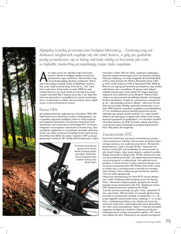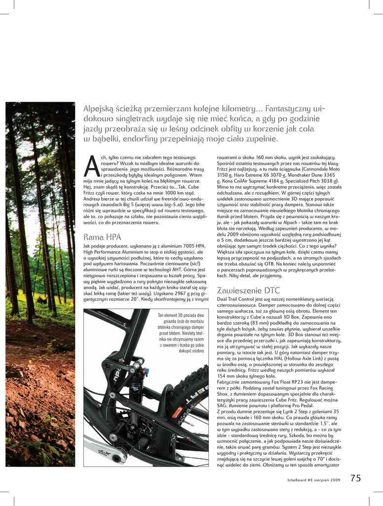 Alpejską ścieżką przemierzam kolejne kilometry... Fantastyczny widokowo singletrack wydaje się nie mieć końca, a gdy po godzinie jazdy przeobraża się w leśny odcinek obfity w korzenie jak cola w bąbelki, endorfiny przepełniają moje ciało zupełnie. A ch, tylko czemu nie zabrałem tego testowego roweru? Wszak tu miałbym idealne warunki do sprawdzenia jego możliwości. Różnorodne trasy i przeszkody byłyby idealnym poligonem. Wtem mija mnie jadący na tylnym koleś na błękitnym rowerze. Hej, znam skądś tę konstrukcję. Przecież to...Tak, Cube Fritzz czyli rower, który czeka na mnie 1000 km stąd. Andrew bierze w tej chwili udział we freeride’owo-endurowych zawodach Big 5 (więcej www.big-5.at). Jego bike różni się wprawdzie w specyfikacji od roweru testowego, ale to, co pokazuje na szlaku, nie pozostawia cienia wątpliwości, co do przeznaczenia roweru. Rama HPA Jak podaje producent, wykonano ją z aluminium 7005 HPA. High Performance Aluminium to stop o niskiej gęstości, ale o wysokiej sztywności podłużnej, które to cechy uzyskano pod wpływem hartowania. Poczwórnie cieniowane (sic!) aluminiowe rurki są tłoczone w technologii AHT. Górna jest nietypowo rozszczepiona i zespawana w kształt procy. Spawy pięknie wygładzono a rury pokryto niezwykle seksowną anodą. Jak widać, producent na każdym kroku starał się uzyskać lekką ramę (lakier też waży). Uzyskano 2967 g przy gigantycznym rozmiarze 20”. Kiedy skonfrontujemy ją z innymi Ten element 3D posiada dwa gniazda śrub do montażu błotnika chroniącego damper przed błotem. Niestety błotnika nie otrzymujemy razem z rowerem i trzeba go sobie dokupić osobno rowerami o skoku 160 mm skoku, wynik jest zaskakujący. Spośród ostatnio testowanych przez nas rowerów tej klasy Fritzz jest najlżejszy, a tu mała ściągawka (Cannondale Moto 3150 g, Haro Extreme X6 3070 g, Mondraker Dune 3365 g, Kona CoilAir Supreme 4184 g, Specialized Pitch 3038 g). Mimo to ma wytrzymać konkretne przeciążenia, więc została odchudzana, ale z rozsądkiem. W górnej części tylnych widełek zastosowano wzmocnienie 3D mające poprawić sztywność oraz stabilność pracy dampera. Stanowi także miejsce na zamocowanie niewielkiego błotnika chroniącego tłumik przed błotem. Przyda się z pewnością w naszym kraju, ale - jak pokazały warunki w Alpach - także tam na brak błota nie narzekają. Według zapewnień producenta, w modelu 2009 obniżono wysokość względną rury podsiodłowej o 5 cm, dodatkowo jeszcze bardziej wyostrzono jej kąt obniżając tym samym środek ciężkości. Co z tego wynika? Większa siła spoczywa na tylnym kole, dzięki czemu mamy lepszą przyczepność na podjazdach, a na stromych zjazdach nie trzeba obawiać się OTB. Na koniec należy wspomnieć o pancerzach poprowadzonych w przykręcanych przelotkach. Niby detal, ale przyjemny. Zawieszenie DTC Dual Trail Control jest wg naszej nomenklatury wariacją czterozawiasowca. Damper zamocowano do dolnej części samego wahacza, tuż za główną osią obrotu. Element ten konstruktorzy z Cube’a nazwali 3D Box. Zapewnia ono bardzo szeroką (83 mm) podkładkę do zamocowania na tyle dużych łożysk, żeby zawias płynnie, wybierał wszelkie drgania powstałe na tylnym kole. 3D Box stanowi też miejsce dla przedniej przerzutki i, jak zapewniają konstruktorzy, ma ją utrzymywać w stałej pozycji. Jak wykazały nasze pomiary, w istocie tak jest. U góry natomiast damper trzyma się za pomocą łącznika HAL (Hollow Axle Link) z pustą w środku osią, o powiększonej w stosunku do zeszłego roku średnicy. Fritzz według naszych pomiarów wykazał 154 mm skoku tylnego koła. Fabrycznie zamontowany Fox Float RP23 nie jest damperem z półki. Poddany został tuningowi przez Fox Racing Shox, z tłumieniem dopasowanym specjalnie dla charakterystyki pracy zawieszenia Cube Fritz. Regulować można SAG, tłumienie powrotu i platformę Pro Pedal. Z przodu dumnie prezentuje się Lyrik 2 Step z goleniami 35 mm, osią maxle i 160 mm skoku. Co prawda główka ramy pozwala na zastosowanie sterówki w standardzie 1,5”, ale w tym wypadku zastosowano stery z redukcją, a - co za tym idzie - standardową średnicę rury. Szkoda, bo można by wzmocnić połączenie, a jak podpowiada nasze doświadczenie, także urwać parę gramów. System 2 Step jest niezwykle wygodny i praktyczny w działaniu. Wystarczy przekręcić znajdującą się na szczycie lewej goleni wajchę o 70° i docisnąć widelec do ziemi. Obniżamy w ten sposób amortyzator bi ke Boa r d # 8 s i er p i eń 2 0 0 9 75