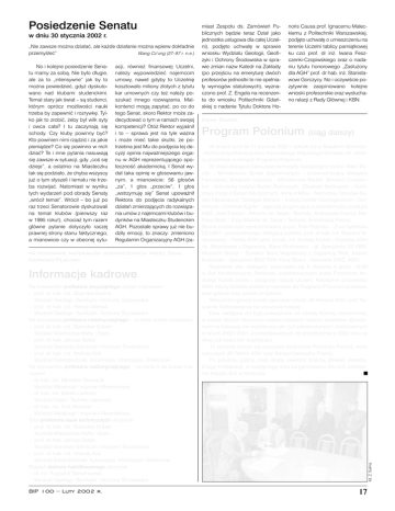 w dniu 30 stycznia 2002 r. „Nie zawsze mo¿na dzia³aæ, ale ka¿de dzia³anie mo¿na wpierw dok³adnie przemyœleæ” Wang Cz’ung (27–97 r. n.e.) No i kolejne posiedzenie Senatu mamy za sob¹. Nie by³o d³ugie, ale za to „intensywne” jak by to mo¿na powiedzieæ, gdy¿ dyskutowano nad klubami studenckimi. Temat stary jak œwiat – s¹ studenci, którym oprócz mo¿liwoœci nauki trzeba by zapewniæ i rozrywkê. Tylko jak to zrobiæ, ¿eby by³ wilk syty i owca ca³a? I tu zaczynaj¹ siê schody. Czy kluby powinny byæ? Kto powinien nimi rz¹dziæ i za jakie pieni¹dze? Co siê powinno w nich dziaæ? Te i inne pytania nasuwaj¹ siê zawsze w sytuacji, gdy „coœ siê dzieje”, a ostatnio na Miasteczku tak siê podzia³o, ¿e chyba wszyscy ju¿ o tym s³yszeli i tematu nie trzeba rozwijaæ. Natomiast w wyniku tych wydarzeñ pod obrady Senaty „wróci³ temat”. Wróci³ – bo ju¿ po raz trzeci Senatorowie dyskutowali na temat klubów (pierwszy raz w 1995 roku!), chocia¿ tym razem g³ówne pytanie dotyczy³o raczej prawnej strony stanu faktycznego, a mianowicie czy w obecnej sytu- acji, równie¿ finansowej Uczelni, nale¿y wypowiedzieæ najemcom umowy, nawet gdyby to Uczelniê kosztowa³o miliony z³otych z tytu³u kar umownych czy te¿ nale¿y poszukaæ innego rozwi¹zania. Malkontenci mog¹ zapytaæ, po co do tego Senat, skoro Rektor mo¿e zadecydowaæ o tym w ramach swojej kompetencji? Otó¿ Rektor wyjaœni³ i to – sprawa jest na tyle wa¿na i mo¿e mieæ takie skutki, ¿e potrzebna jest Mu do podjêcia tej decyzji opinia najwa¿niejszego organu w AGH reprezentuj¹cego spo³ecznoœæ akademick¹. I Senat wyda³ taka opiniê w g³osowaniu jawnym, a mianowicie: 56 g³osów „za”, 1 g³os „przeciw”, 1 g³os „wstrzymujê siê” Senat upowa¿ni³ Rektora do podjêcia radykalnych dzia³añ zmierzaj¹cych do rozwi¹zania umów z najemcami klubów i budynków na Miasteczku Studenckim AGH. Pozosta³e sprawy ju¿ nie budzi³y emocji, to znaczy: zmieniono Regulamin Organizacyjny AGH (za- Na podstawie materia³ów dostarczonych przez Dzia³ Kadrowo-P³acowy Informacje kadrowe Na stanowisko profesora zwyczajnego zostali mianowani: – prof. dr hab. in¿. Zbigniew Kasina Wydzia³ Geologii, Geofizyki i Ochrony Œrodowiska – prof. dr hab. in¿. Henryk Marcak Wydzia³ Geologii, Geofizyki i Ochrony Œrodowiska Na stanowisko profesora nadzwyczajnego – na sta³e zostali mianowani: – prof. dr hab. in¿. Stanis³aw Dubiel Wydzia³ Wiertnictwa Nafty i Gazu – prof. dr hab. Janusz Go³aœ Wydzia³ Geodezji Górniczej i In¿ynierii Œrodowiska – prof. dr hab. in¿. Andrzej Kos Wydzia³ Elektrotechniki, Automatyki, Informatyki i Elektroniki Na stanowisko profesora nadzwyczajnego – na okres 5 lat zostali mianowani: – dr hab. in¿. Miros³aw G³owacki Wydzia³ Metalurgii i In¿ynierii Materia³owej – dr hab. in¿. Marek Lankosz Wydzia³ Fizyki i Techniki J¹drowej – dr hab. in¿. Kurt Wiencek Wydzia³ Metalurgii i In¿ynierii Materia³owej Tytu³ profesora nauk technicznych otrzymali: – prof. dr hab. in¿. Stanis³aw Dubiel Wydzia³ Wiertnictwa Nafty i Gazu – prof. dr hab. Janusz Go³aœ Wydzia³ Geodezji Górniczej i In¿ynierii Œrodowiska – prof. dr hab. in¿. Andrzej Kos Wydzia³ Elektrotechniki, Automatyki, Informatyki i Elektroniki Stopieñ doktora habilitowanego otrzymali: – dr in¿. Krzysztof Bahranowski Wydzia³ Geologii, Geofizyki i Ochrony Œrodowiska BIP 100 – Luty 2002 r. miast Zespo³u ds. Zamówieñ Publicznych bêdzie teraz Dzia³ jako jednostka us³ugowa dla ca³ej Uczelni), podjêto uchwa³ê w sprawie wniosku Wydzia³u Geologii, Geofizyki i Ochrony Œrodowiska w sprawie zmian nazw Katedr na Zak³ady (po przejœciu na emeryturê dwóch profesorów jednostki te nie spe³nia³y wymogów statutowych), wyznaczono prof. Z. Engela na recenzenta do wniosku Politechniki Gdañskiej o nadanie Tytu³u Doktora Ho- noris Causa prof. Ignacemu Maleckiemu z Politechniki Warszawskiej, podjêto uchwa³ê o umieszczeniu na terenie Uczelni tablicy pami¹tkowej ku czci prof. dr in¿. Iwana Feszczenki-Czopiwskiego oraz o nadaniu tytu³u honorowego „Zas³u¿ony dla AGH” prof. dr hab. in¿. Stanis³awowi Gorczycy. No i oczywiœcie pozytywnie zaopiniowano kolejne wnioski profesorskie oraz wys³uchano relacji z Rady G³ównej i KBN. Irena Sikora Program Polonium (ci¹g dalszy) W dniach od 9 do 11 stycznia 2002 r. odby³o siê w Akademii Górniczo-Hutniczej spotkanie polsko-francuskiego Wspólnego Komitetu ds. selekcji projektów w ramach Programu Polonium. W sk³ad delegacji francuskiej wchodzi³y nastêpuj¹ce osoby: Alain Troulet – Ministerstwo Spraw Zagranicznych – przewodnicz¹cy delegacji francuskiej; Elisabeth Legrand – Ministerstwo Badañ; Bernard Charpentier – Narodowy Instytut Badañ Rolniczych; Elisabeth Beningsen – Narodowy Instytut Badañ Medycznych; Anne d’Albis – Narodowy Oœrodek Badañ Naukowych; Georges Morizot – Instytut badañ Geologicznych i Górniczych; Chantran Egide – agencja przyjmuj¹ca cudzoziemców, podleg³a MSZ; Jean Favero – Attache ds. Nauki i Techniki, Ambasada Francji; Mathieu Moal – Z-ca Attache ds. Nauki i Techniki, Ambasada Francji. Strona polska by³a reprezentowana przez: Piotr Pajestka – Z-ca Dyrektora DZ KBN – przewodnicz¹cy delegacji polskiej; prof. dr hab. in¿. Ryszard Tadeusiewicz – Rektor AGH; prof. dr hab. in¿. Andrzej Korbel – Prorektor AGH ds. Wspó³pracy z Zagranic¹; Maria Klimkiewicz – g³. Specjalista DZ KBN; Wojciech Brzost – Dyrektor Biura Wspó³pracy z Zagranic¹ PAN; Jolanta Krzeœniak – specjalista BWZ PAN; Irena Sikora – Kierownik DWZ, AGH. Spotkanie obu delegacji rozpoczê³o siê 9 stycznia o godz. 16.00 w Sali Konferencyjnej Rektoratu przedstawieniem przez Prorektora Andrzeja Korbla profilu i osi¹gniêæ naszej Uczelni. Nastêpnie pracownicy AGH, którzy sk³adali wnioski projektowe do Programu Polonium przedstawiali g³ówne tezy swoich projektów. Wiecz