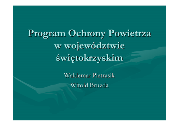 Program Ochrony Powietrza w województwie świętokrzyskim Waldemar Pietrasik Witold Bruzda Ocena poziomu substancji w powietrzu • Obowiązek sporządzenia corocznej oceny poziomu substancji w powietrzu wynika z art. 89 Poś • WIOŚ dokonuje co roku (w terminie do 31 maja za poprzedni rok) oceny poziomu substancji w powietrzu w danej strefie oraz dokonuje klasyfikacji stref w których – Choćby jednej substancji przekracza poziom dopuszczalny powiększony o margines tolerancji – choćby jednej substancji mieści się pomiędzy poziomem dopuszczalnym a poziomem dopuszczalnym powiększonym o margines tolerancji – substancji nie przekracza poziomu dopuszczalnego Cel rocznej oceny jakości powietrza • Dokonanie klasyfikacji stref w oparciu o przyjęte kryteria określone w rozp. Ministra Środowiska z 6 czerwca 2002 r. • Klasyfikacja ta stanowi podstawę do podjęcia decyzji o potrzebie zaplanowania działań na rzecz poprawy jakości powietrza w danej strefie (opracowania programów ochrony powietrza). Cel rocznej oceny jakości powietrza cd. • Uzyskanie informacji o stężeniach zanieczyszczeń na obszarze aglomeracji lub innej strefy. • Wskazanie prawdopodobnych przyczyn występowania ponadnormatywnych stężeń zanieczyszczeń w określonych rejonach. • Wskazanie potrzeb w zakresie wzmocnienia istniejącego systemu monitoringu i oceny. Ocena jakości powietrza w 2005 r. • 14 stref - odpowiadających podziałowi administracyjnemu w województwa świętokrzyskiego (13 powiatów ziemskich i 1 miasto na prawach powiatu – Kielce). • Brak aglomeracji będących strefą – woj. świętokrzyskie nie posiada miasta o liczbie mieszkańców większej niż 250 tyś. Ocena jakości powietrza w 2005 r. • Ocena jakości powietrza w 2005 r. • Zgodnie z art. 89 Poś dokonano oceny poziomu substancji w powietrzu w poszczególnych strefach i sporządzono klasyfikację stref dla dwóch kryteriów z uwagi na : – ochronę zdrowia ludzi, – ochronę roślin. Ocena jakości powietrza w 2005 r. • Klasyfikacja ogólna wg kryterium ochrony zdrowia obejmowała SO2, NO2, PM10, Pb, C6H6, CO, O3. • Klasa A - 11 stref • Klasa C – 3 strefy ( miasto Kielce, powiat ostrowiecki, powiat starachowicki – przekroczenia stężeń 24 godz. PM10) • Klasa C – opracowanie przez wojewodę POP Ocena jakości powietrza w 2005 r. Ocena jakości powietrza w 2005 r. • Klasyfikacja ogólna wg kryterium ochrony roślin obejmowała SO2, NOx, O3. • Klasa A - 13 stref • Strefa obejmująca m. Kielce została wyłączona z oceny – nie obowiązują poziomy dopuszczalne. Ocena jakości powietrza w 2005 r. Program Ochrony Powietrza • Dla stref, w których stwierdzono przekroczenia poziomu dopuszczalnego substancji w powietrzu, zgodnie z art. 91 poś, wojewoda w terminie 15 miesięcy od dnia otrzymania wyników oceny poziomu substancji w powietrzu i klasyfikacji stref określi w drodze rozporządzenia program ochrony powietrza (POP). Program Ochrony Powietrza • Wojewoda określając POP: – Zasięga opinii właściwych starostów – Zapewnia udział społeczeństwa w postępowaniu • Cel POP – Osiągnięcie dopuszczalnych poziomów substancji w powietrzu. Program Ochrony Powietrza • Stan realizacji POP w woj. świętokrzyskim: – Zabezpieczono środki w budżecie wojewody. – Zabezpieczono środki w WFOŚiGW . – Umieszczono POP na liście priorytetów WFOŚiGW. – Przygotowywana jest dokumentacja przetargowa. • Przewidywany czas przygotowania POP – styczeń – czerwiec 2007 r. Dziękuję za uwagę