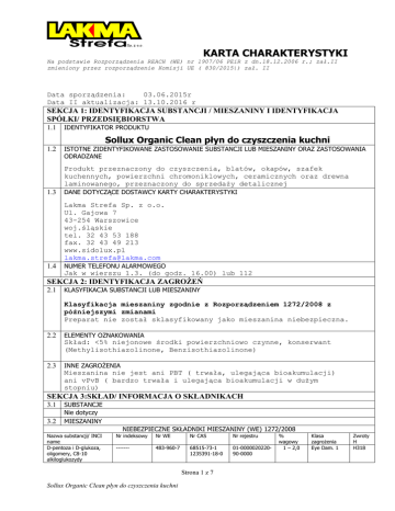 KARTA CHARAKTERYSTYKI Na podstawie Rozporządzenia REACH (WE) nr 1907/06 PEiR z dn.18.12.2006 r.; zał.II zmieniony przez rozporządzenie Komisji UE ( 830/2015|) zał. II Data sporządzenia: 03.06.2015r Data II aktualizacja: 13.10.2016 r SEKCJA 1: IDENTYFIKACJA SUBSTANCJI / MIESZANINY I IDENTYFIKACJA SPÓŁKI/ PRZEDSIĘBIORSTWA 1.1 IDENTYFIKATOR PRODUKTU Sollux Organic Clean płyn do czyszczenia kuchni 1.2 ISTOTNE ZIDENTYFIKOWANE ZASTOSOWANIE SUBSTANCJI LUB MIESZANINY ORAZ ZASTOSOWANIA ODRADZANE Produkt przeznaczony do czyszczenia, blatów, okapów, szafek kuchennych, powierzchni chromoniklowych, ceramicznych oraz drewna laminowanego, przeznaczony do sprzedaży detalicznej 1.3 DANE DOTYCZĄCE DOSTAWCY KARTY CHARAKTERYSTYKI Lakma Strefa Sp. z o.o. Ul. Gajowa 7 43-254 Warszowice woj.śląskie tel. 32 43 53 188 fax. 32 43 49 213 www.sidolux.pl [email protected] 1.4 NUMER TELEFONU ALARMOWEGO Jak w wierszu 1.3. (do godz. 16.00) lub 112 SEKCJA 2: IDENTYFIKACJA ZAGROŻEŃ 2.1 KLASYFIKACJA SUBSTANCJI LUB MIESZANINY Klasyfikacja mieszaniny zgodnie z Rozporządzeniem 1272/2008 z późniejszymi zmianami Preparat nie został sklasyfikowany jako mieszanina niebezpieczna. 2.2 ELEMENTY OZNAKOWANIA Skład: <5% niejonowe środki powierzchniowo czynne, konserwant (Methylisothiazolinone, Benzisothiazolinone) 2.3 INNE ZAGROŻENIA Mieszanina nie jest ani PBT ( trwała, ulegająca bioakumulacji) ani vPvB ( bardzo trwała i ulegająca bioakumulacji w dużym stopniu) SEKCJA 3:SKŁAD/ INFORMACJA O SKŁADNIKACH 3.1 3.2 SUBSTANCJE Nie dotyczy MIESZANINY NIEBEZPIECZNE SKŁADNIKI MIESZANINY (WE) 1272/2008 Nazwa substancji/ INCI name D-pentoza i D-glukoza, oligomery, C8-10 alkiloglukozydy Nr indeksowy Nr WE Nr CAS Nr rejestru ------- 483-960-7 68515-73-1 1235391-18-0 01-000002022090-0000 Strona 1 z 7 Sollux Organic Clean płyn do czyszczenia kuchni % wagowy 1 – 2,0 Klasa zagrożenia Eye Dam. 1 Zwroty H H318 KARTA CHARAKTERYSTYKI Na podstawie Rozporządzenia REACH (WE) nr 1907/06 PEiR z dn.18.12.2006 r.; zał.II zmieniony przez rozporządzenie Komisji UE ( 830/2015|) zał. II SEKCJA 4: ŚRODKI PIERWSZEJ POMOCY 4.1 Opis środków pierwszej pomocy W przypadku wystąpienia jakichkolwiek niepokojących objawów wezwać natychmiast lekarza lub odwieźć poszkodowanego do szpitala, pokazać kartę charakterystyki, opakowanie produktu lub etykietę. Inhalacja W warunkach normalnych zagrożenie praktycznie nie istnieje. W warunkach awaryjnych wyprowadzić lub wynieść poszkodowanego na świeże powietrze. Kontakt z Przepłukać obficie wodą, jeżeli podrażnienie oczu oczami utrzymuje się, skonsultować się ze specjalistą. Kontakt ze Zapobiegawczo umyć wodą z mydłem. W przypadku skórą podrażnienia skóry skonsultować się z lekarzem. Połknięcie: Wypić 1-2 szklanki wody. W razie potrzeb skontaktować się z lekarzem, pokazać kartę charakterystyki, opakowanie produktu lub etykietę. Nieprzytomnej osobie nigdy nie podawać nic doustnie. 4.2 NAJWAŻNIEJSZE OSTRE I OPÓŹNIONE OBJAWY ORAZ SKUTKI NARAŻENIA Patrz pkt 11. 4.3 WSKAZANIA DOTYCZĄCE WSZELKIEJ NATYCHMIASTOWEJ POMOCY LEKARSKIEJ I SZCZEGÓLNEGO POSTĘPOWANIA Z POSZKODOWANYM Brak danych SEKCJA 5: POSTĘPOWANIE W PRZYPADKU POŻARU 5.1 ŚRODKI GAŚNICZE Dwutlenek węgla, proszki gaśnicze, gaśnica pianowa, prądy wodne rozproszone. 5.2 SZCZEGÓLNE ZAGROŻENIE ZWIĄZANE Z SUBSTANCJĄ LUB MIESZANINĄ Podczas pożaru powstają niebezpieczne dla zdrowia pary i dymy, które mogą zawierać tlenki węgla, siarki oraz związki organiczne i nieorganiczne. Nie wdychać dymów. 5.3 INFORMACJE DLA STRAŻY POŻARNEJ: Odzież gazoszczelna i aparaty izolujące drogi oddechowe nie zależne od otaczającego powietrza. SEKCJA 6: POSTĘPOWANIE W PRZYPADKU NIEZAMIERZONEGO UWOLNIENIA DO ŚRODOWISKA 6.1 INDYWIDUALNE ŚRODKI OSTROŻNOŚCI, SPRZĘT OCHRONNY I PROCEDURY W SYTUACJACH AWARYJNYCH Nie dopuszczać osób postronnych i nieupoważnionych. Unikać bezpośredniego kontaktu z produktem, zapewnić wentylację, stosować odpowiednie środki ochrony indywidualnej, patrz pkt.8. 6.2 ŚRODKI OSTROŻNOŚCI W ZAKRESIE OCHRONY ŚRODOWISKA Zapobiegać zanieczyszczeniu gleby i wody oraz przedostaniu się do kanalizacji, rowów lub rzek. 6.3 METODY I MATERIAŁY ZAPOBIEGAJĄCE ROZPRZESTRZENIANIU SIĘ SKAŻENIA I SŁUŻĄCE DO USUWANIA SKAŻENIA Niewielkie ilości uwolnionego materiału zetrzeć papierowym ręcznikiem i umieścić w pojemniku na odpady. Duże ilości uwolnionego produktu przesypać materiałem pochłaniającym (piasek, ziemia okrzemkowa, trociny) i zebrać do oznakowanego pojemnika na odpady. Miejsce wycieku zmyć starannie wodą Strona 2 z 7 Sollux Organic Clean płyn do czyszczenia kuchni KARTA CHARAKTERYSTYKI Na podstawie Rozporządzenia REACH (WE) nr 1907/06 PEiR z dn.18.12.2006 r.; zał.II zmieniony przez rozporządzenie Komisji UE ( 830/2015|) zał. II 6.4 ODNIESIENIA DO INNYCH SEKCJI Informacje dotyczące odpowiedniego sprzętu ochrony osobistej podano w sekcji 8 Informacje dotyczące usuwania odpadów podano w sekcji 13 SEKCJA 7: POSTĘPOWANIE Z SUBSTANCJAMI I MIESZANINAMI ORAZ ICH MAGAZYNOWANIE 7.1 ŚRODKI OSTROŻNOŚCI DOTYCZĄCE BEZPIECZNEGO POSTĘPOWANIA Postępować zgodnie z ogólnymi zasadami bezpieczeństwa i higieny pracy z substancjami chemicznymi oraz dobrej praktyki przemysłowej; ściśle przestrzegać opracowanych procedur postępowania oraz wszelkich zaleceń producenta; podczas pracy z produktem należy stosować ogólne przepisy bezpieczeństwa i higieny pracy zawarte w Rozporządzeniu Ministra Pracy i Polityki Socjalnej z dnia 26 września 1997 r. w sprawie ogólnych przepisów bezpieczeństwa i higieny pracy (Dz.U. nr 129/1997, poz. 844)wraz z późniejszymi zmianami. 7.2 WARUNKI BEZPIECZNEGO MAGAZYNOWANIA, W TYM INFORMACJE DOTYCZĄCE WSZELKICH WZAJEMNYCH NIEZGODNOŚCI Magazynować w pomieszczeniu z wentylacją ogólną. Przechowywać w chłodnych, suchych miejscach, w pojemnikach szczelnie zamkniętych w temperaturze +5 - +35˚C, w pozycji pi