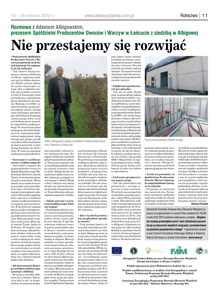 10 – 16 września 2012 r. Rolnictwo | 11 www.zielonysztandar.com.pl Rozmowa z Adamem Albigowskim, prezesem Spółdzielni Producentów Owoców i Warzyw w Łańcucie z siedzibą w Albigowej Nie przestajemy się rozwijać • Panie prezesie, Spółdzielnia Producentów Owoców i Warzyw przygotowała się do dużych inwestycji. Czy rozpoczęła się ich realizacja? – Tak, budowa dużego magazynu z komorą chłodniczą na 120 ton i zapleczem socjalnym jest już bliska ukończenia. Obiekt zostanie oddany do użytku od początku nowego roku, a całkowita wartość tego projektu wyniesie 1,2 mln zł. Inwestycja ta była przewidziana w pięcioletnim planie dochodzenia do uznania. Wyjaśnię, że w 2010 r. zarejestrowaliśmy się jako grupa wstępnie uznana i od tego czasu realizujemy pięcioletni plan dochodzenia do pełnego uznania grupy, który został zatwierdzony przez marszałka województwa podkarpackiego. W ramach tego planu realizujemy określone działania m.in. wspominaną budowę bazy magazynowej i zakup różnego typu sprzętu, przede wszystkim kilku kombajnów do zbioru porzeczki, a także dużego kombajnu do zbioru wiśni. W sumie na inwestycje zamierzamy wydać 2,26 mln zł. • Inwestycje te są dofinansowane z środków unijnych? – Jeśli chodzi o wsparcie dla grup producentów warzyw, to Agencja Restrukturyzacji i Modernizacji Rolnictwa dawała 75 proc. zwrotu kosztów poniesionych na inwestycje. Mówię dawała, bo te bardzo korzystne warunki, to już przeszłość. O ile wiem, od kwietnia obowiązuje rozporządzenie wykonawcze Komisji Europejskiej, które ogranicza w budżecie unijnym środki przewidziane na wsparcie grup producentów. W tej chwili nie wiadomo jeszcze, na jaki zwrot będą mogły liczyć nowo powstałe grupy producentów owoców i warzyw. Niemniej będzie to pułap o wiele niższy. Mówi się, że zamiast 75 proc. będzie to 25-30 proc. W związku z tym duże inwestycje, takie jak budowa chłodni, zwłaszcza dla małych sadowników, będą o wiele trudniejsze do zrealizowania, niż było do tej pory. Nasza grupa podjęła działania inwestycyjne na starych zasadach, więc można powiedzieć, że w pełni wykorzystaliśmy czas, w którym należało podjąć takie działania. • Jak duże znaczenie dla grupy ma budowa obiektu magazynowego z chłodnią? – Do tej pory sprzedaż odbywała się na bieżąco. Najczęściej było to tak, że bezpośrednio do plantacji podjeż- proc., 6 proc. i 4 proc. wartości produkcji sprzedanej, stanowiącej równowartość w złotych do sumy 1 mln euro. Powyżej tej kwoty są to liczby o połowę mniejsze. To wsparcie ma być utrzymane także dla nowo powstających grup producentów owoców i warzyw. Adam Albigowski, prezes Spółdzielni Producentów Owoców i Warzyw w Łańcucie dżał samochód i zebrany towar ładowano do niego. Następnie załadowany samochód jechał bezpośrednio do odbiorcy. Tymczasem często jest tak, że cena danego produktu może się zmienić znacząco z dnia na dzień. Dlatego bardzo korzystnie jest zebrać owoce z sadów i plantacji, a następnie towar trzymać w chłodni. Wtedy, w dniu, w którym ceny skoczą do góry, my możemy korzystnie sprzedać dużą partię towaru. To jest olbrzymia zaleta posiadania magazynów i chłodni. • Jakimi owocami i warzywami handluje grupa? Gdzie one trafiają? – Produkujemy głównie owoce i warzywa do przetwórstwa: czarna i czerwona porzeczka, malina, wiśnia, aronia, jabłka oraz rabarbar. Z tego zdecydowaną większość stanowią owoce przemysłowe, około 30 proc. stanowią owoce na rynek świeży, a więc sprzedawane na targach, czy bezpośrednio w sklepach. Można je podzielić na owoce sprzedawane bezpośrednio po zbiorach oraz owoce sprzedawane w ciągu długiego okresu czasu. Jeśli chodzi o aktualny rok to dużym odbiorcą naszych owoców jest firma BioConcept-Gardenia, chodzi tu głównie o produkty ekologiczne i agrest. Mimo pewnych zatorów płatniczych wiele towaru trafia do Hortino Leżajsk, gdzie nasza grupa ma udziały w tej spółce. Trochę owoców trafia do Spółdzielni Ogrodni- czej-Pszczelarskiej w Rzeszowie i do firmy O.K. Owocowe Koncentraty w Przeworsku. W tej chwili są to nasi najwięksi odbiorcy, głównie z tego rejonu. Miewaliśmy jednak też propozycje kupna naszych produktów z drugiego krańca Polski. Ale tutaj, żeby wysłać taki transport, nieodzowne jest wcześniejsze schłodzenie produktu. Na całe szczęście już od nowego roku będziemy mieli własną chłodnię, która na pewno w takich sytuacjach się przyda. W związku z tym nie ukrywam też, że będzie możliwe również zorganizowanie dużych partii towaru, który będziemy mogli sprzedać zagranicą. • Jak w tej chwili przedstawia się opłacalność sprzedaży owoców? – Tutaj możemy mówić o olbrzymich wahaniach cen, które potrafią zmienić się z dnia na dzień. Dlatego np. mimo, że w tym roku w tonach sprzedaliśmy więcej czarnej porzeczki, to zysk osiągnęliśmy mniejszy niż rok wcześniej. W tym roku sprzedaliśmy 200 ton, natomiast rok wcześniej 150-160 ton, ale wtedy cena była wyższa – 5 zł za kilogram, a teraz otrzymywaliśmy tylko 2 zł za kg, więc sumarycznie mimo zwiększenia produkcji osiągnęliśmy mniejszy zysk. W takiej sytuacji duże znaczenie ma dofinansowanie wsparcia dla grup wynoszące w pięciu latach dochodzenia grupy do uznania: 10 proc., 10 proc., 8 • I dzięki temu sprzedaż owoców jest opłacalna. – Tak, ale nie tylko. Dzięki temu, że grupa oferuje większą ilość danego produktu, uzyskuje korzystniejsze ceny. Nasza spółdzielnia, zanim przystąpiliśmy do pięcioletniej procedury uznania za pełnoprawną grupę producentów, działała od 2003 r. Już wtedy, biorąc aktualną w danym roku sytuację na rynku, uzyskiwaliśmy lepsze ceny niż producenci indywidualni. Ośrodek Doradztwa Rolniczego w Boguchwale corocznie przygotowuje podsumowanie sezonu, gdzie podaje średnie ceny, jakie na Podkarpa