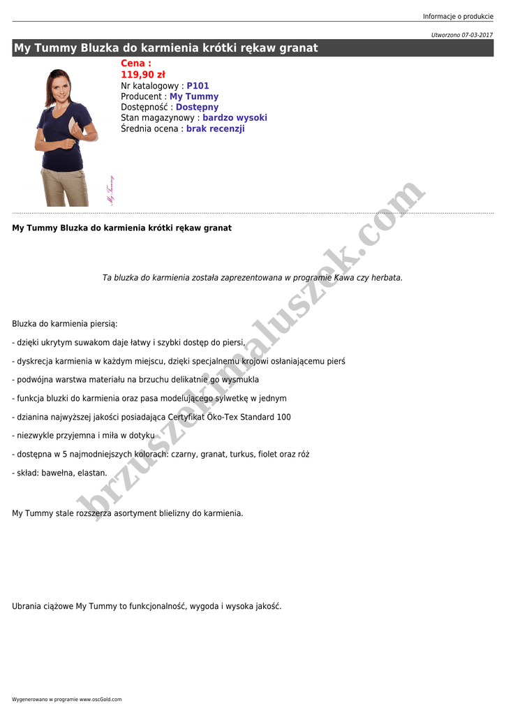 Informacje o produkcie Utworzono 07-03-2017 My Tummy Bluzka do karmienia krótki rękaw granat Cena : 119,90 zł My Tummy Bluzka do karmienia krótki rękaw granat us ze k. co m Nr katalogowy : P101 Producent : My Tummy Dostępność : Dostępny Stan magazynowy : bardzo wysoki Średnia ocena : brak recenzji Ta bluzka do karmienia została zaprezentowana w programie Kawa czy herbata. Bluzka do karmienia piersią: al - dzięki ukrytym suwakom daje łatwy i szybki dostęp do piersi, ze ki m - dyskrecja karmienia w każdym miejscu, dzięki specjalnemu krojowi osłaniającemu pierś - podwójna warstwa materiału na brzuchu delikatnie go wysmukla - funkcja bluzki do karmienia oraz pasa modelującego sylwetkę w jednym - dzianina najwyższej jakości posiadająca Certyfikat Öko-Tex Standard 100 us - niezwykle przyjemna i miła w dotyku - dostępna w 5 najmodniejszych kolorach: czarny, granat, turkus, fiolet oraz róż br z - skład: bawełna, elastan. My Tummy stale rozszerza asortyment blielizny do karmienia. Ubrania ciążowe My Tummy to funkcjonalność, wygoda i wysoka jakość. Wygenerowano w programie www.oscGold.com Dostępne opcje My Tummy Bluzka do karmienia krótki rękaw granat br z us ze ki m al us ze k. co m Rozmiar: S, M, L, XL.