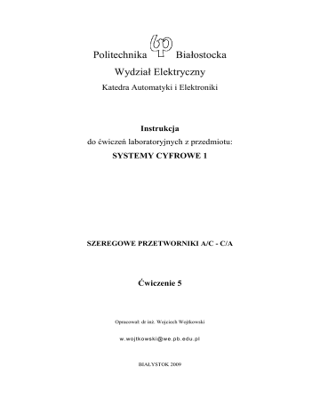 Politechnika Białostocka Wydział Elektryczny Katedra Automatyki i Elektroniki Instrukcja do ćwiczeń laboratoryjnych z przedmiotu: SYSTEMY CYFROWE 1 SZEREGOWE PRZETWORNIKI A/C - C/A Ćwiczenie 5 Opracował: dr inŜ. Wojciech Wojtkowski w. woj tk o ws k i @ we. p b. ed u .p l BIAŁYSTOK 2009 Spis treści instrukcji: 1. Cel i zakres ćwiczenia laboratoryjnego ............................................................................................. 2 2. Przetwornik A/C C/A PCF8591 ............................................................................................. 2 Adres ............................................................................................. 3 Bajt sterujący ............................................................................................. 4 Konwersja D/A ............................................................................................. 6 Konwersja A/D ............................................................................................. 7 Napięcie referencyjne ............................................................................................. 9 3. Zagadnienia do przygotowania ............................................................................................. 12 4. Wymagania BHP ............................................................................................. 12 5. Sprawozdanie ............................................................................................. 13 6. Przykładowe zadania ............................................................................................. 13 7. Literatura ............................................................................................. 14 1. CEL I ZAKRES ĆWICZENIA LABORATORYJNEGO Celem ćwiczenia jest poznanie problematyki związanej z wykorzystaniem przetworników A/C oraz C/A z interfejsem szeregowym w systemach cyfrowych. W ramach ćwiczenia studenci projektują wybrane układy mikroprocesorowe wykorzystujące przetworniki A/C i C/A z interfejsem I2C. Oprócz badania przetworników studenci poznają magistralę I2C stosowaną powszechnie w wielu cyfrowych czujnikach (takŜe wielkości nieelektrycznych) oraz specjalizowanych układach peryferyjnych systemów cyfrowych (głównie do komunikacji lokalnej). Zakres ćwiczenia obejmuje: • Poznanie zasad obsługi magistrali I2C. • Projektowanie układów mikroprocesorowych współpracujących z przetwornikami A/C oraz C/A. Szczegółowy zakres ćwiczenia ustala prowadzący. 2. PRZETWORNIK A/C C/A PCF8591 Układ PCF8591 jest 8-mio bitowym układem akwizycji danych posiadającym 4 analogowe wejścia, jedno analogowe wyjście, interfejs szeregowy I2C. Adres urządzenia jest ustawiany sprzętowo poprzez trzy końcówki, co umoŜliwia jednoczesne podłączenie do jednej magistrali 2 8 takich przetworników. Adres, sterowanie i dane są przesyłane do i z układu poprzez I2C. W układzie jest blok multipleksera sygnału analogowego, 8-bit A/D przetwornik, 8-bitowy przetwornik D/A (Rys. 1). Maksymalna szybkość konwersji jest ograniczona tylko transmisją I2C. Rys. 1. Schemat blokowy PCF8591 Adres KaŜdy układ PCF8591 dołączony do magistrali, jest aktywowany gdy na magistrali I2C pojawi się jego adres. Adres układu składa się ze stałej części będącej jakby identyfikatorem typu układu oraz z części ustawianej sprzętowo poprzez odpowiednie podłączenie trzech pinów adresowych. Adres na magistrali I2C zawsze musi być przesłany zaraz po sekwencji START. Ostatni bit adresu jest znacznikiem zapisu/odczytu i określa rodzaj dalszej komunikacji (rys. 2). Rys. 2. Bajt adresu 3 Bajt sterujący Drugi bajt przesłany do PCF8591 jest umieszczany w control register i jest wykorzystany do sterowania funkcjami układu. Starszy półbajt jest wykorzystany do aktywacji analogowego wyjscia, i do programowania analogowych wejść. Młodszy półbajt jest wykorzystany do definiuje numer kanału wejściowego oraz pozwala na włączenie autoinkrementacji kanałów po kaŜdej konwersji A/D (Rys. 3). Wyjscie analogowe naleŜy wyłączyć jeśli jest nieuŜywane co pozwala na zmniejszenie konsumpcji energii. Po resecie „Power-on” wszystkie bity słowa kontrolnego sa ustawiane na zero. Wyjście analogowe znajduje się wtedy w stanie wysokiej impedancji. 4 Rys. 3. Słowo sterujące 5 Konwersja D/A Trzeci bajt wysłany do PCF8591 jest umieszczany w rejestrze danych DAC oraz jest poddawany konwersji na wartość analogową przy uŜyciu wbudowanego w układ przetwornika D/A. Wewnętrzny konwerter D/A składa się z dzielnika rezystorowego (256 odczepów) podłączonego do zewnętrznego źródła napięcia referencyjnego. Specjalny dekoder powoduje podłączenie odpowiedniego odczepu dzielnika rezystorowego do wyjścia analogowego. Napięcie wyjściowe analogowe jest buforowane. Napięcie to jest trzymane, aŜ nastąpi nowa konwersja D/A. Wewnętrzny przetwornik D/A jest takŜe wykorzystywany podczas konwersji A/D metoda kolejnych przybliŜeń. Aby umoŜliwić wykorzystanie przetwornika D/A w procesie przetwarzania A/D, układ jest wyposaŜony w S/H (sample and hold). Układ ten utrzymuje napięcie wyjściowe, gdy przetwornik D/A jest wykorzystany do konwersji A/D. Napięcie wyjściowe po konwersji moŜna obliczyć z formuły podanej na rysunku 4. Rys. 4. Obliczanie napięcia wyjściowego 6 Rys. 5. Sekwencja konwersji D/A Konwersja A/D Konwersja A/D jest wykonywana metodą kolejnych przybliŜeń. Wbudowany przetwornik D/A i wbudowany komparator są uŜywane w czasie konwersji A/D. Konwersja A/D jest zawsze rozpoczynana poprzez przesłanie do układu adresu do odczytu (read mode). Konwersja A/D jest zapoczątkowana poprzez zbocze opadające pulsu taktującego potwierdzenie przesłanego bajtu i jest wykonywana w trakcie gdy na magistralę transmitowana jest wartość ostatniej konwersji (opóźnienie jednobajtowe) (Rys. 6). Za kaŜdym razem gdy opadające zbocze pulsu zegarowego odpowiadające